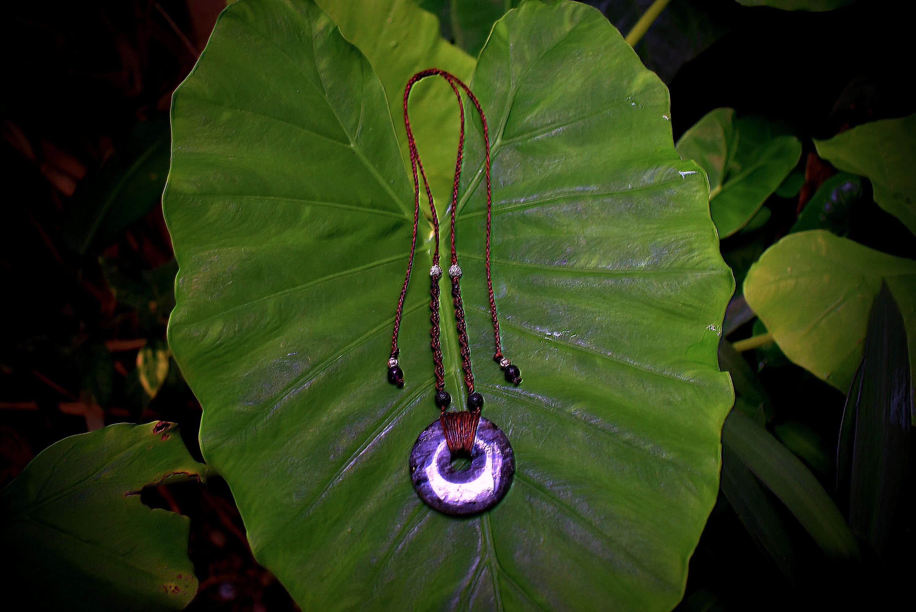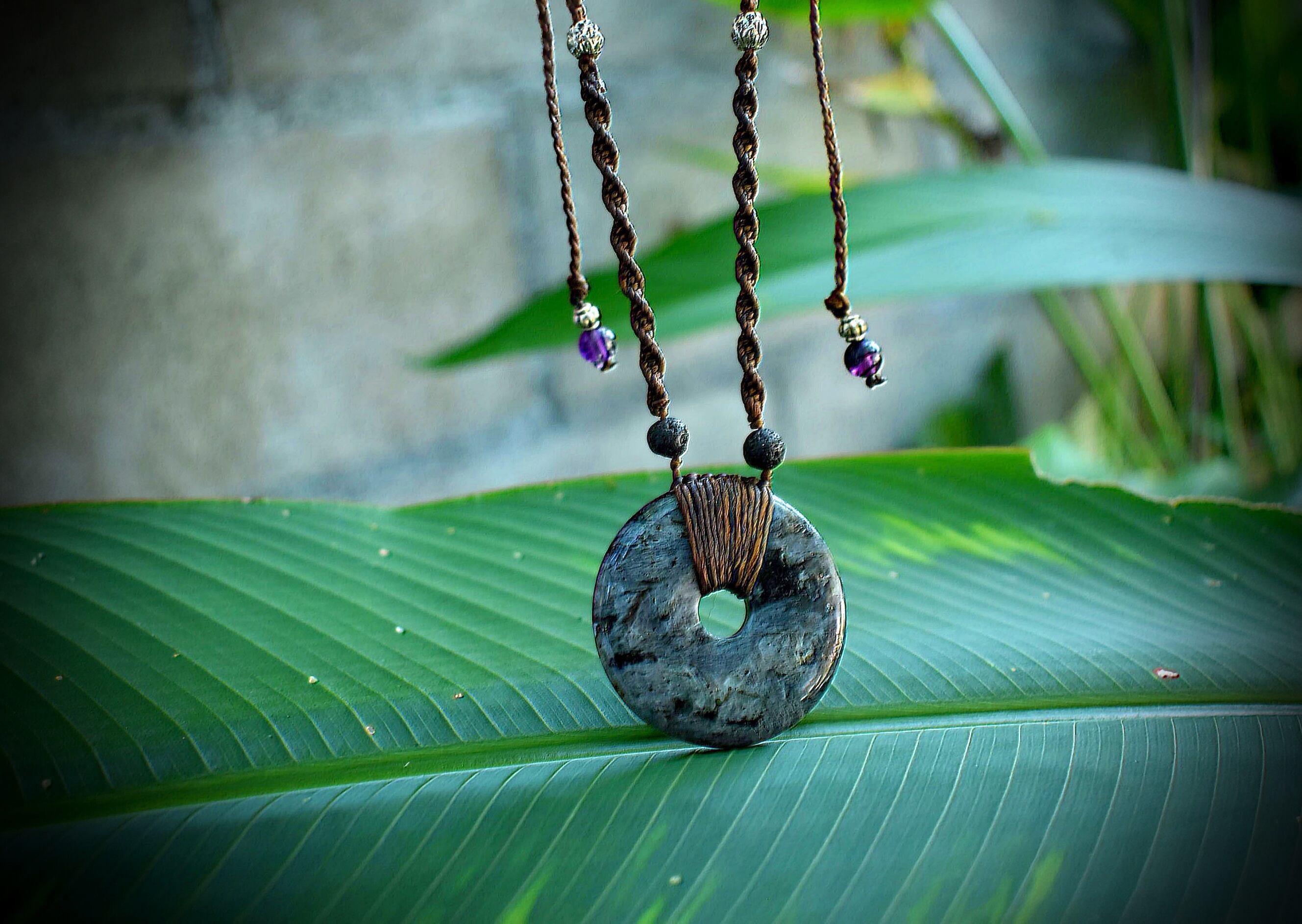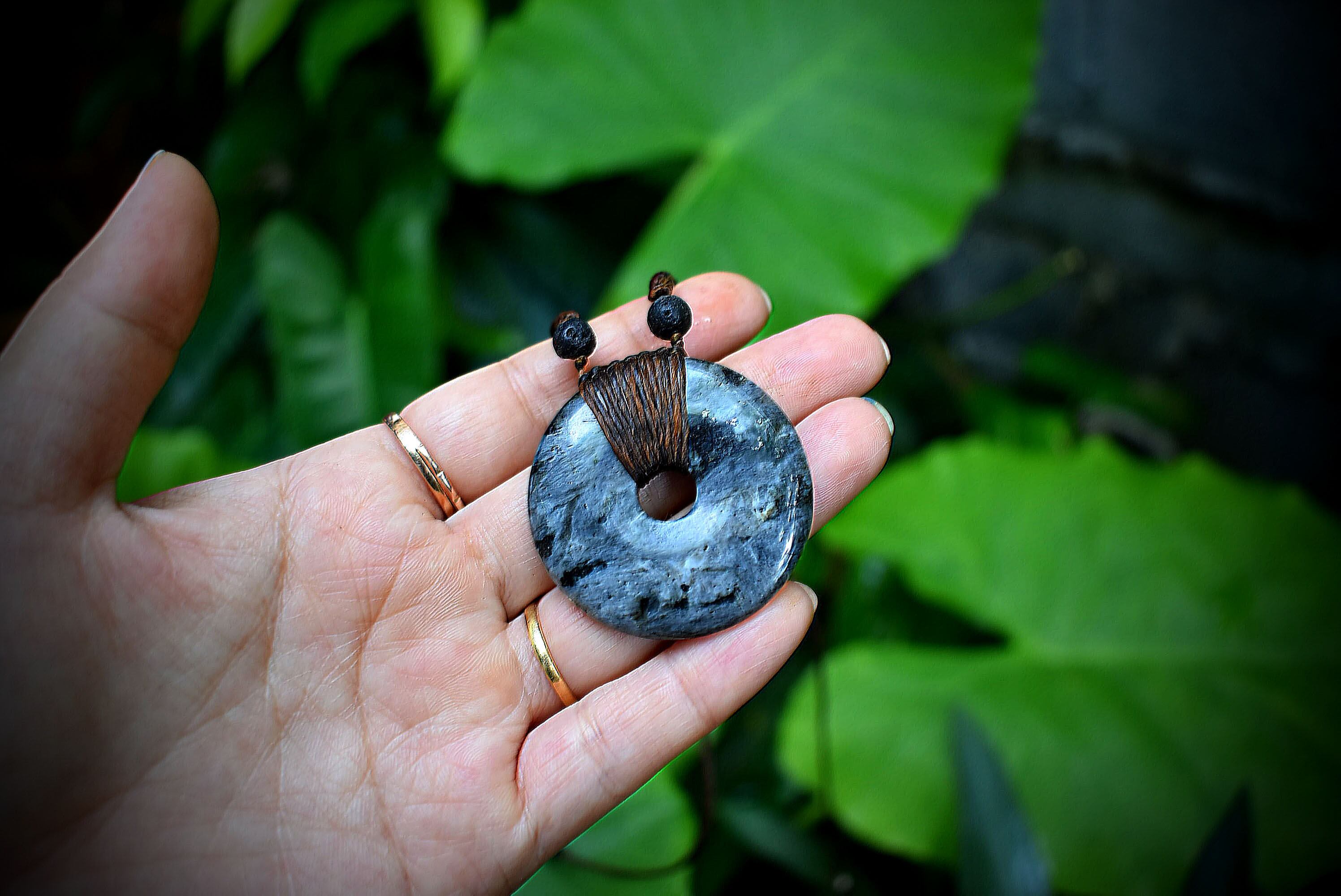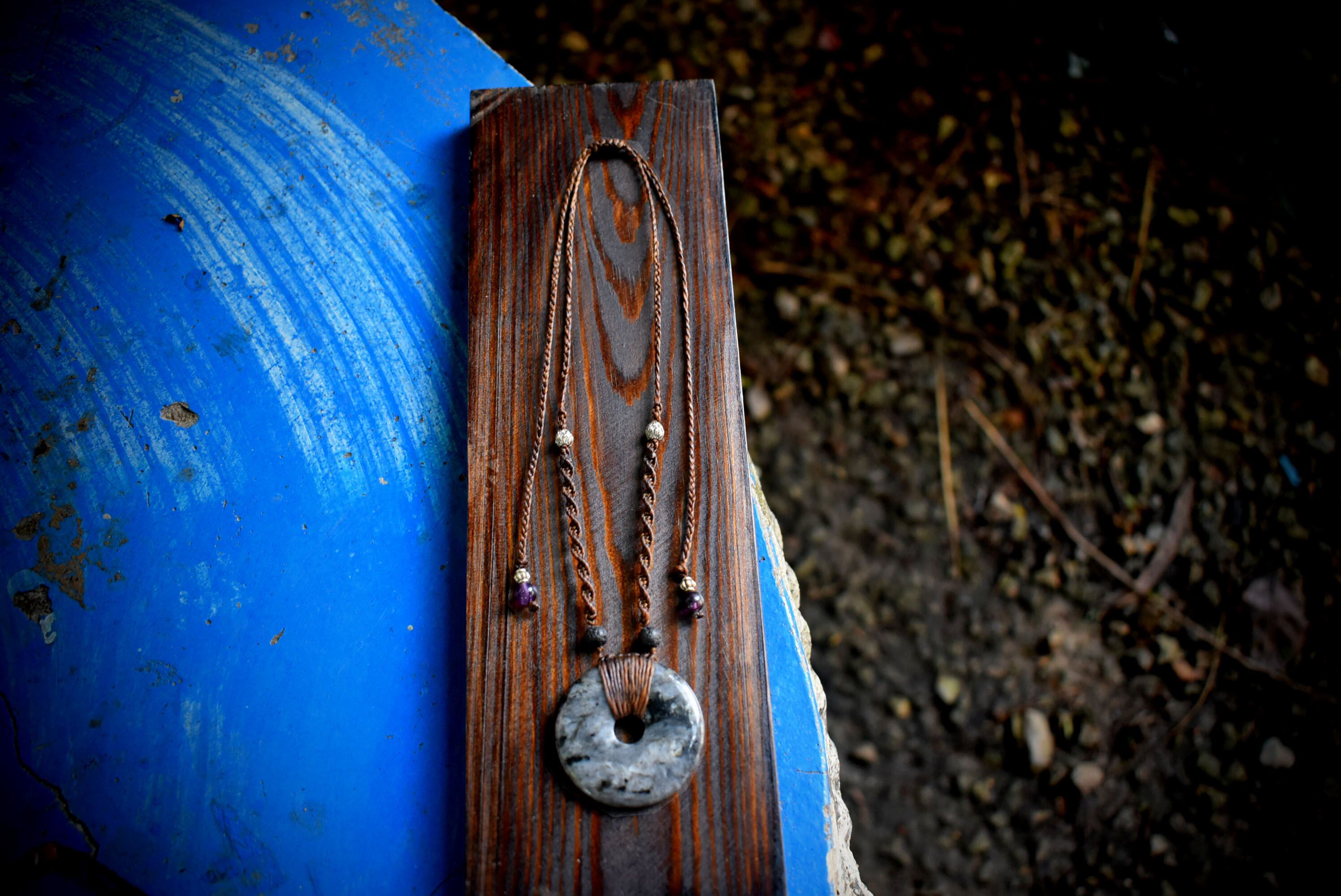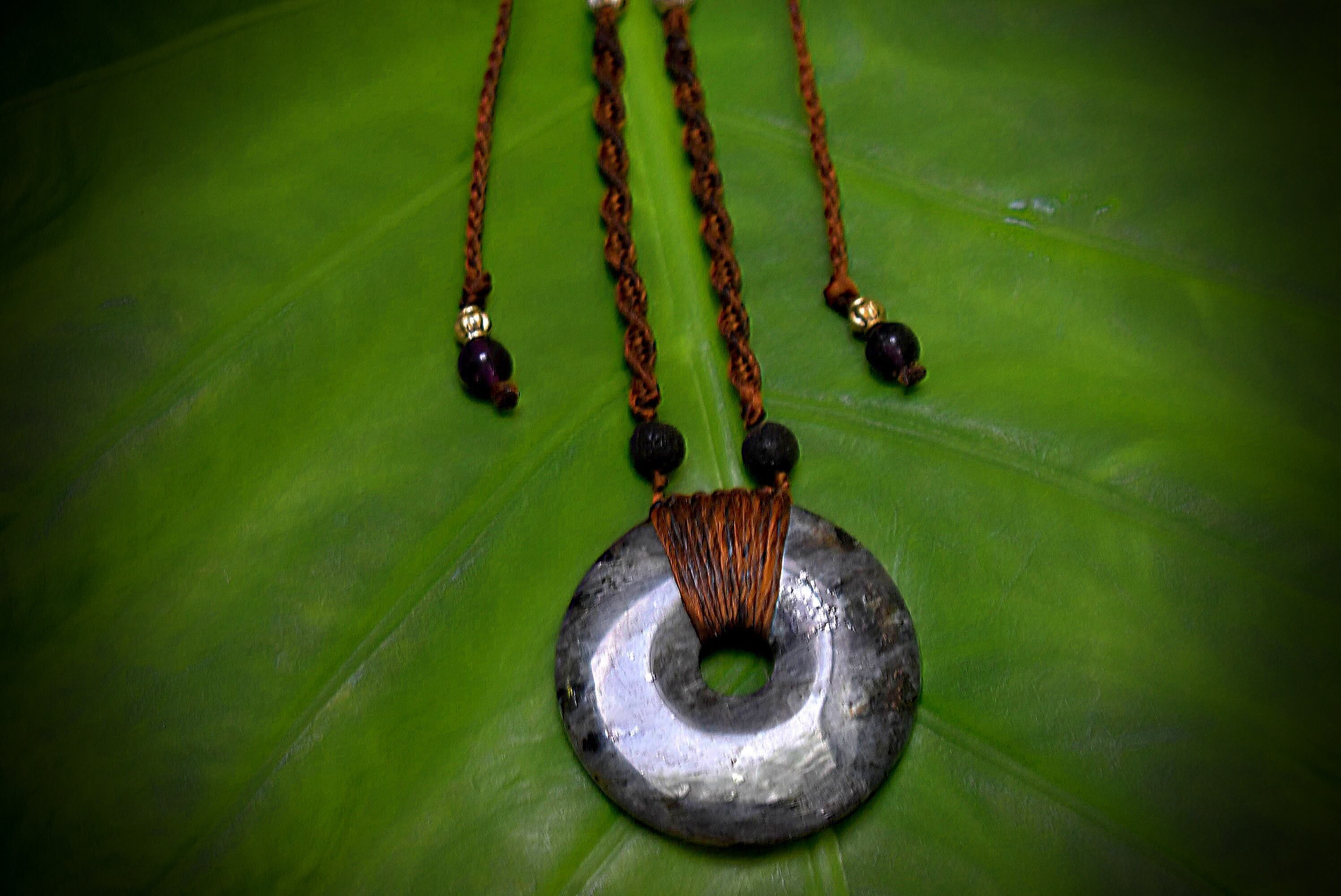 まるでゼブラ模様であることからその名がついたゼブラアゲートはよく見ますと黒い模様とシラーが重なり合ってキラキラと輝くことから本来のアゲートにはないめずらしいタイプのアゲートであると言えます。ドーナツ型のこの石をシンプルにマクラメ編みを取り入れて、ペンダントに仕上げました。