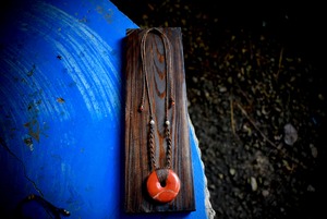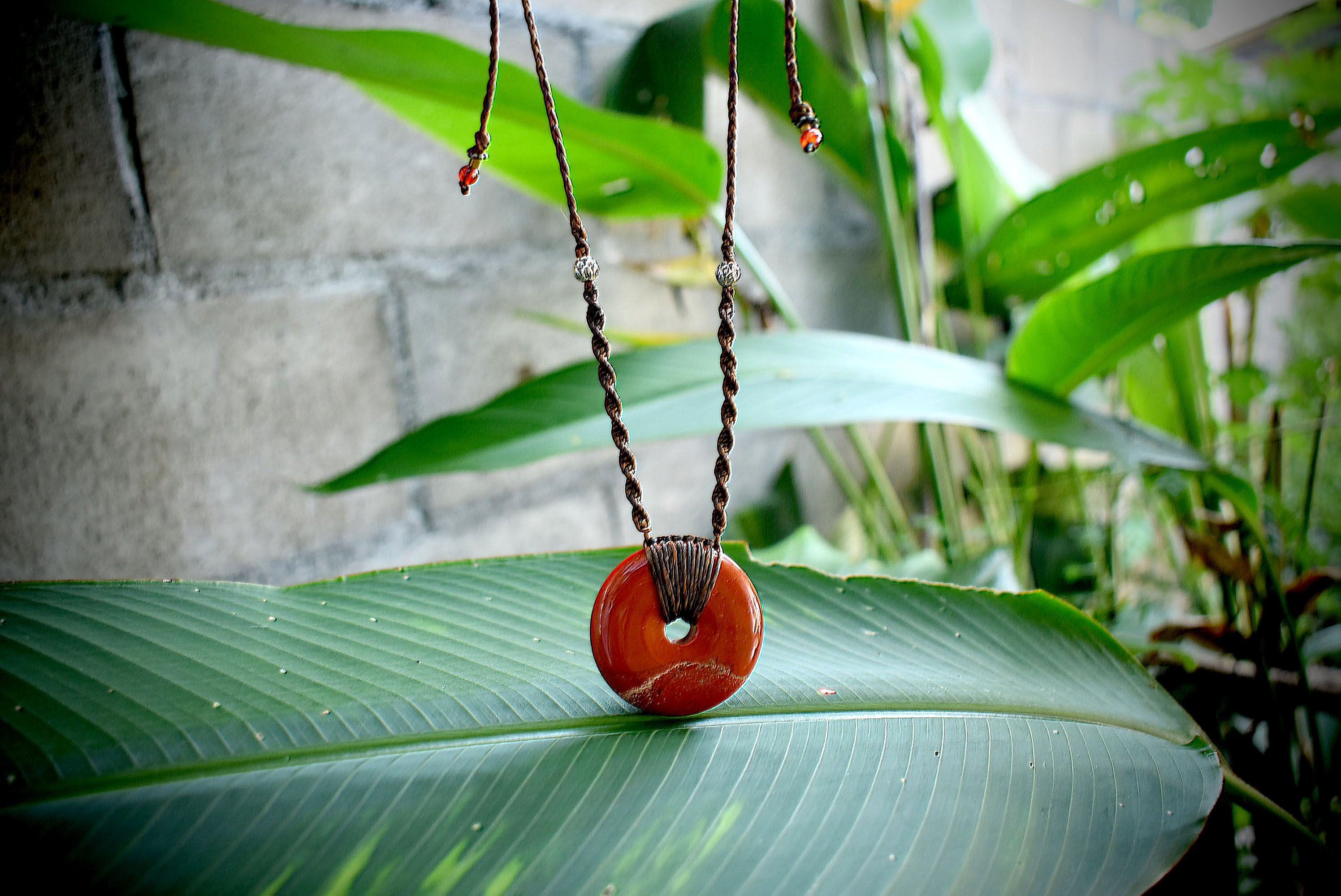 モードなイメージの明るい赤色天然石レッドジャスパーのドーナツ型。石の中には川のような流れの模様が入り込んでいます。マクラメ編み装飾にて丁寧にひと編みひと編み編み込み、シルバーメッキビーズを使用。ペンダントネックレスに仕上げました。