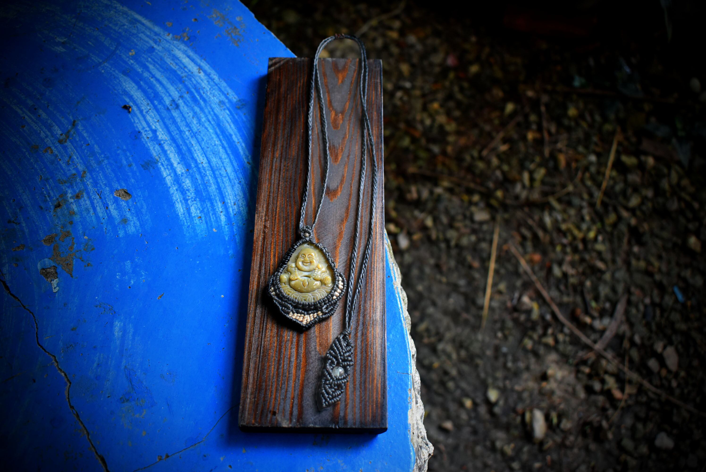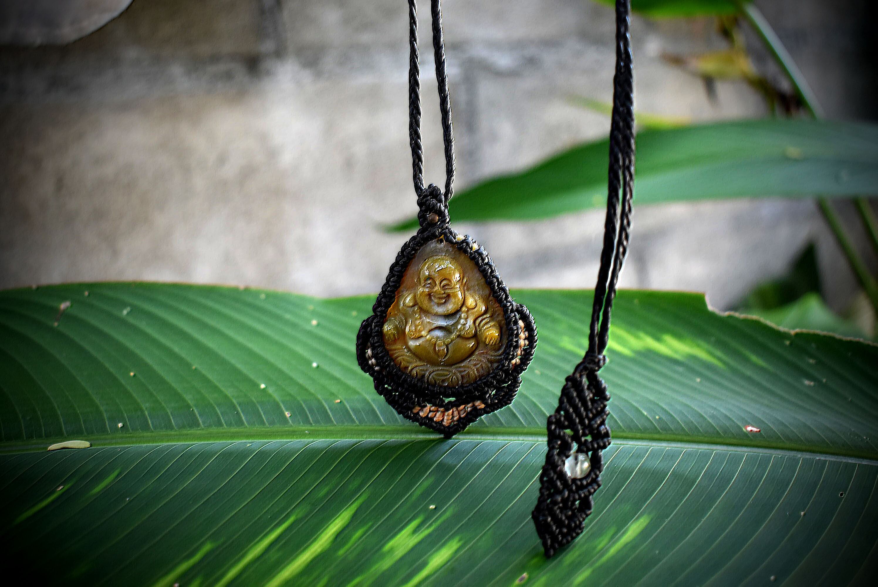 縁起の良いハッピーなお顔のブッダ様がほっこりさせてくれるアゲートを蓮の葉っぱの上に座っているかのようにイメージしてマクラメ編み装飾を施し、仕上げました。