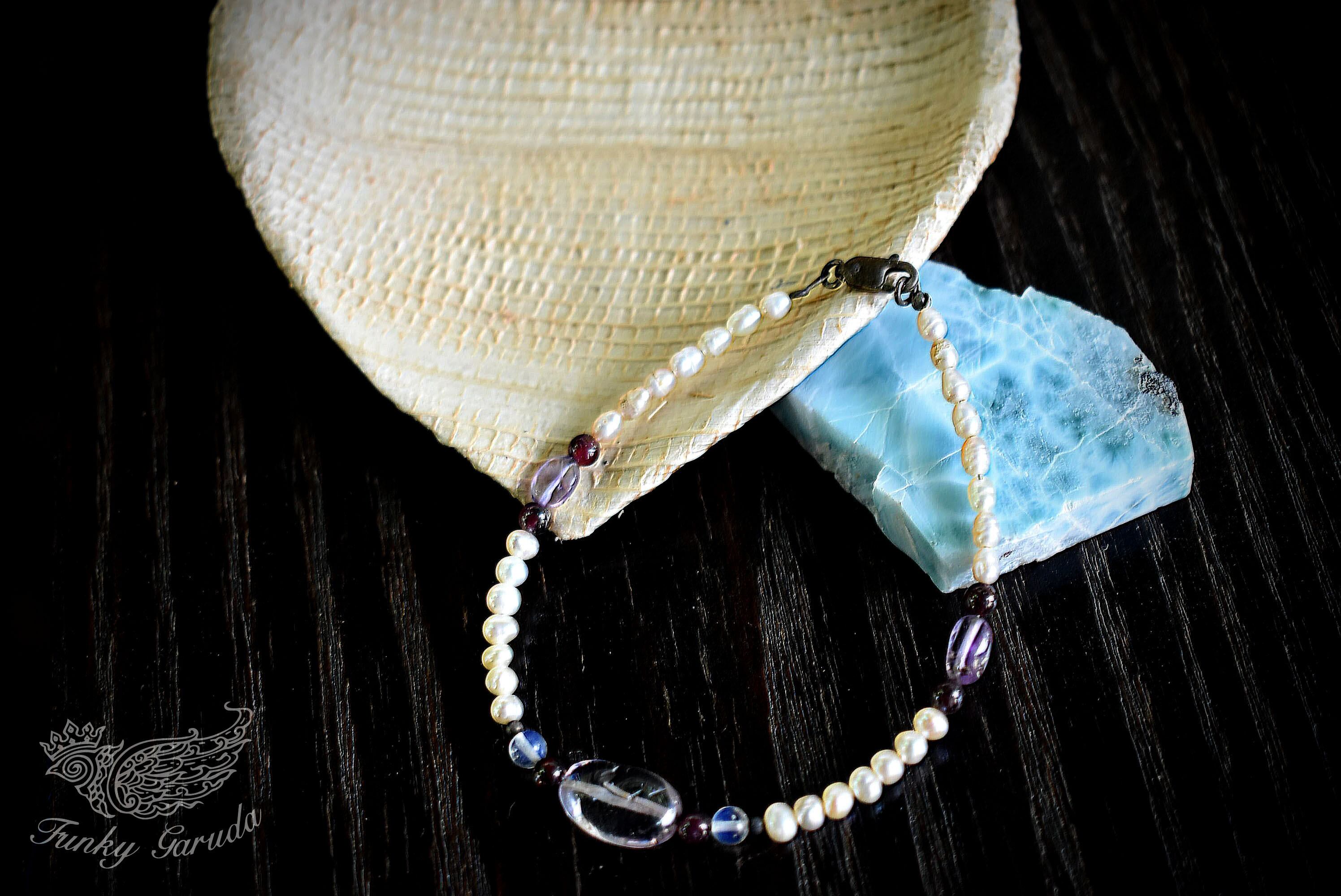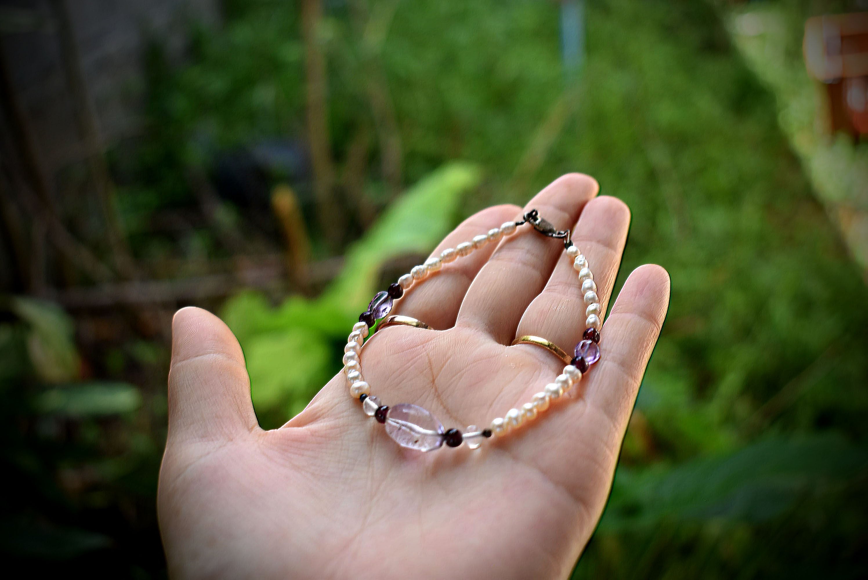 フレッシュウォーターパールと天然石ガーネット、アメトリンを合わせた女性らしいブレスレットを仕上げました。