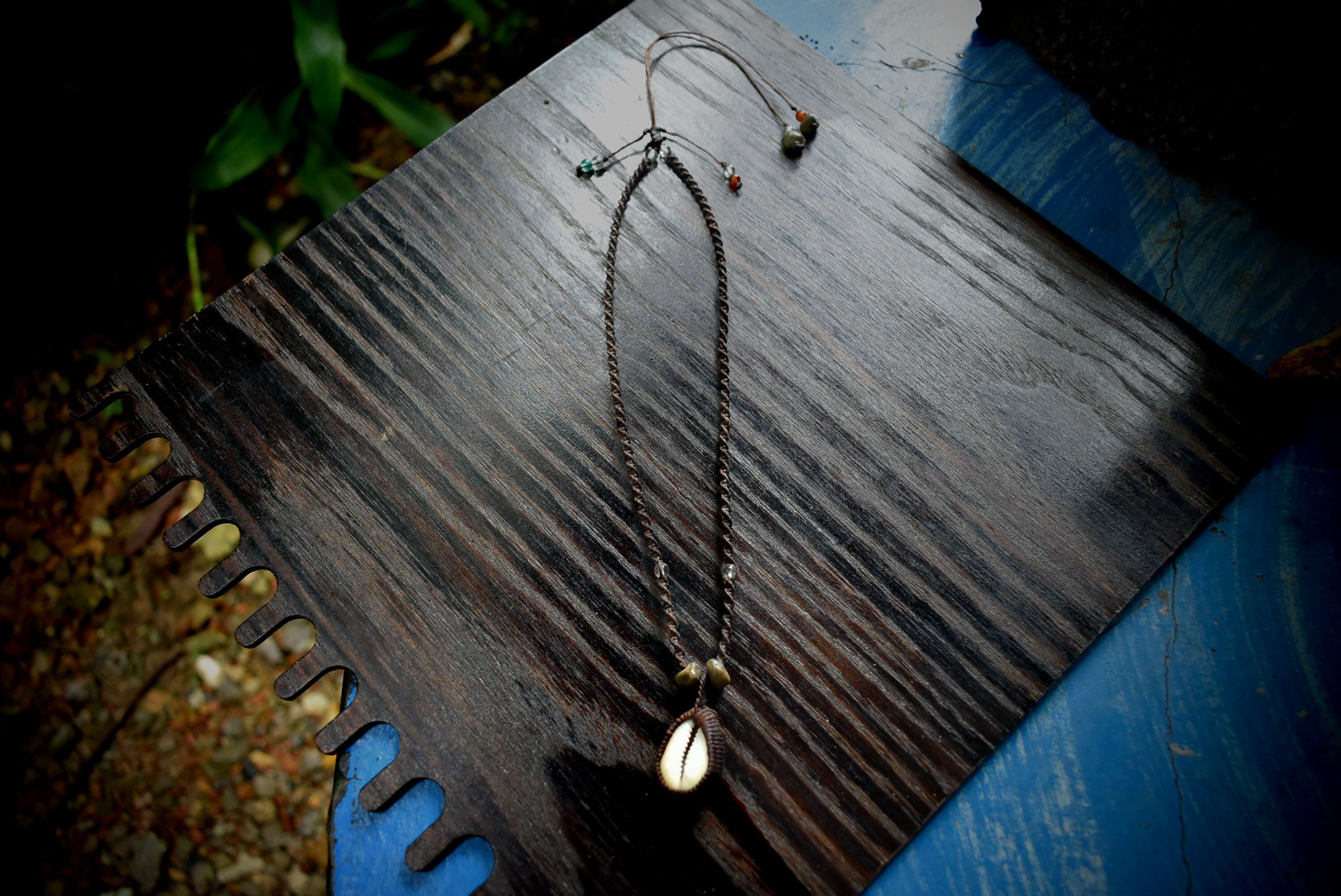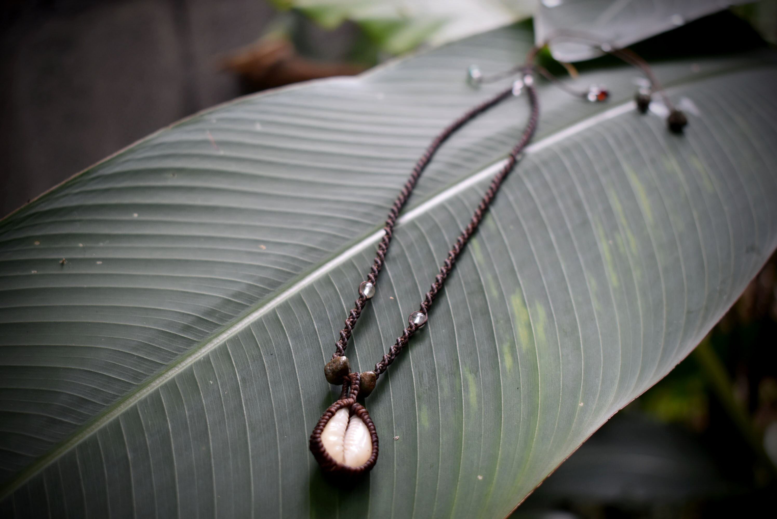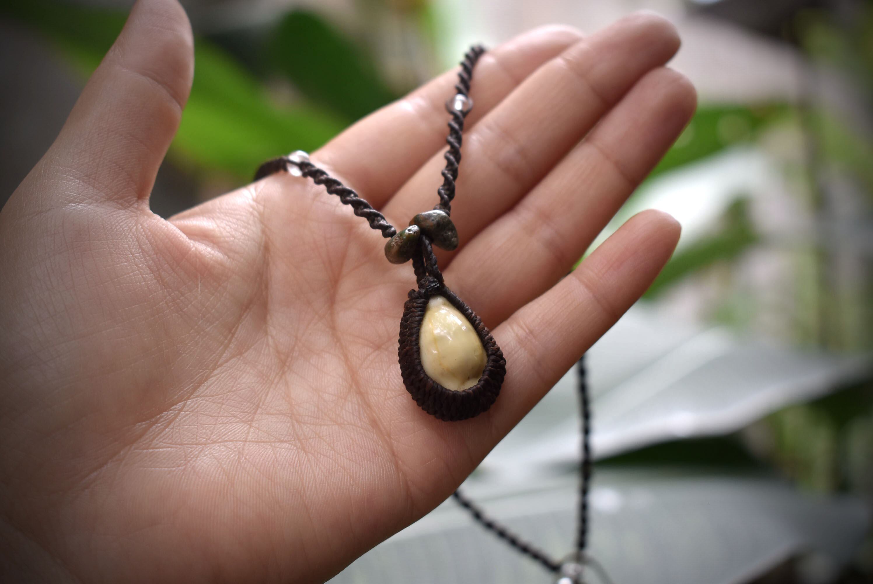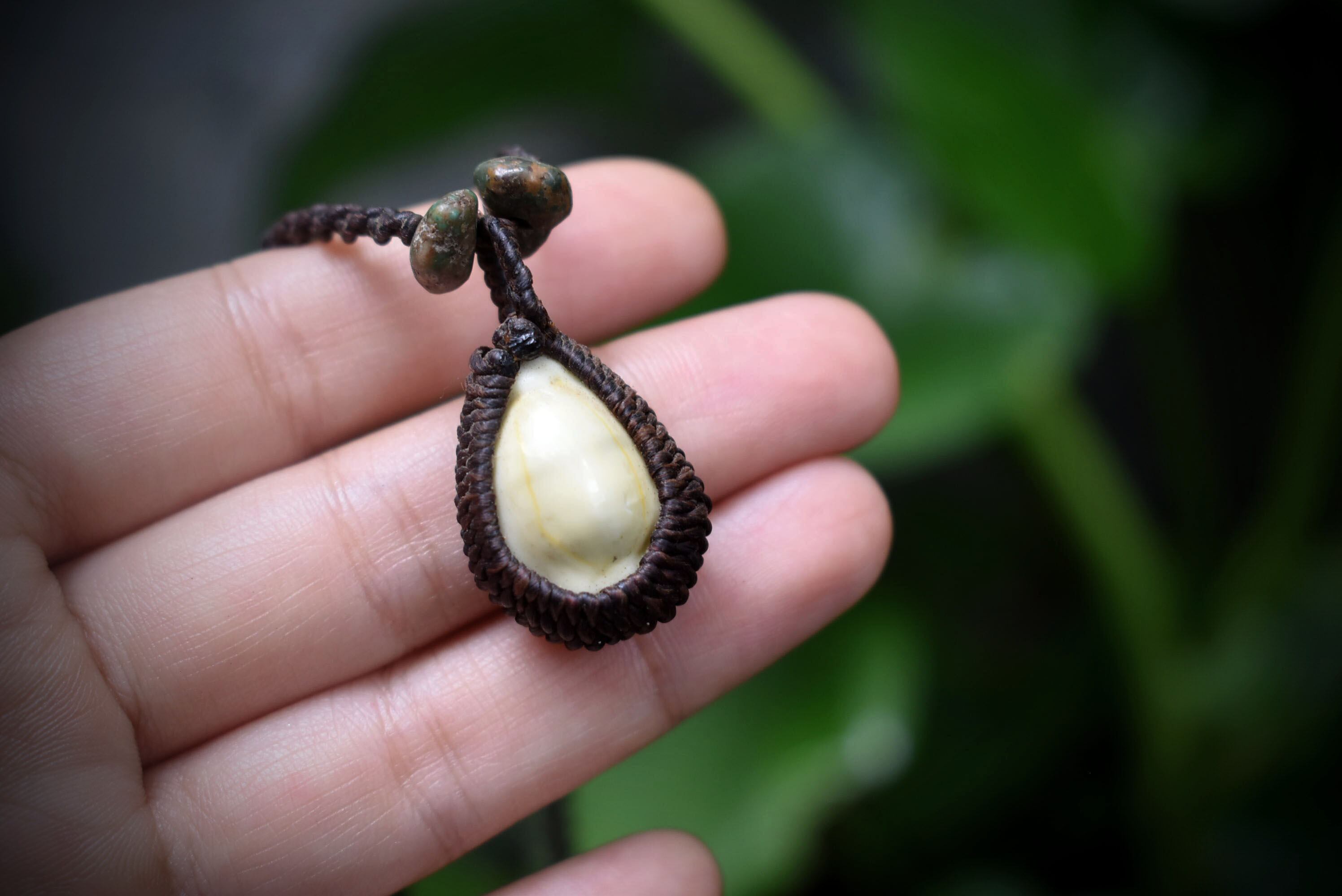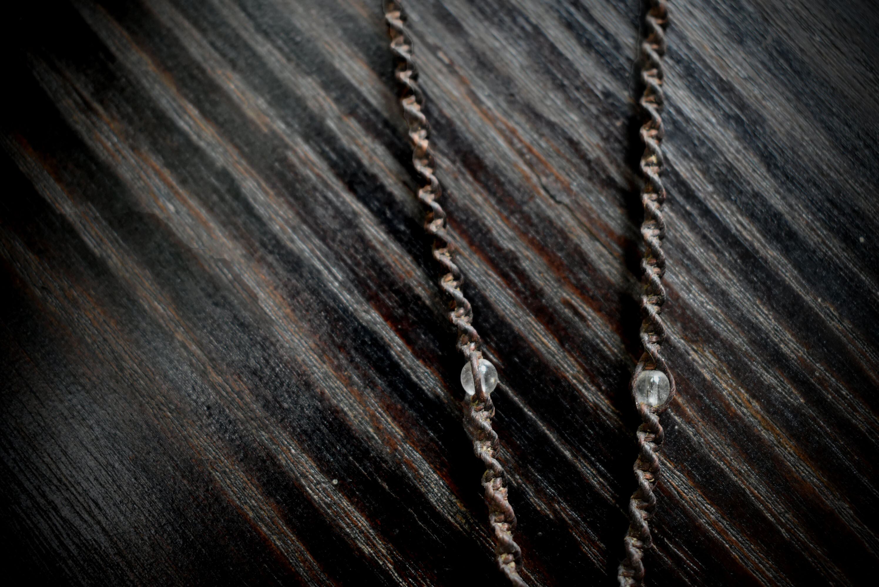 ◆このたびはダークブラウン色の蝋引き糸を使用しマクラメ編み装飾を施しました。