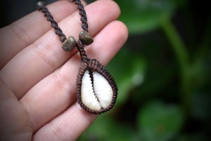 ラッキーシェル貝殻とチベット産ターコイズを合わせて、シンプルであり自然を感じられる色合いを大切にした自然派ネックレスを仕上げました。お肌に優しい蝋引き糸をしておりますので、肌荒れなどもなく敏感な方にもお使いいただける優しいネックレスです。