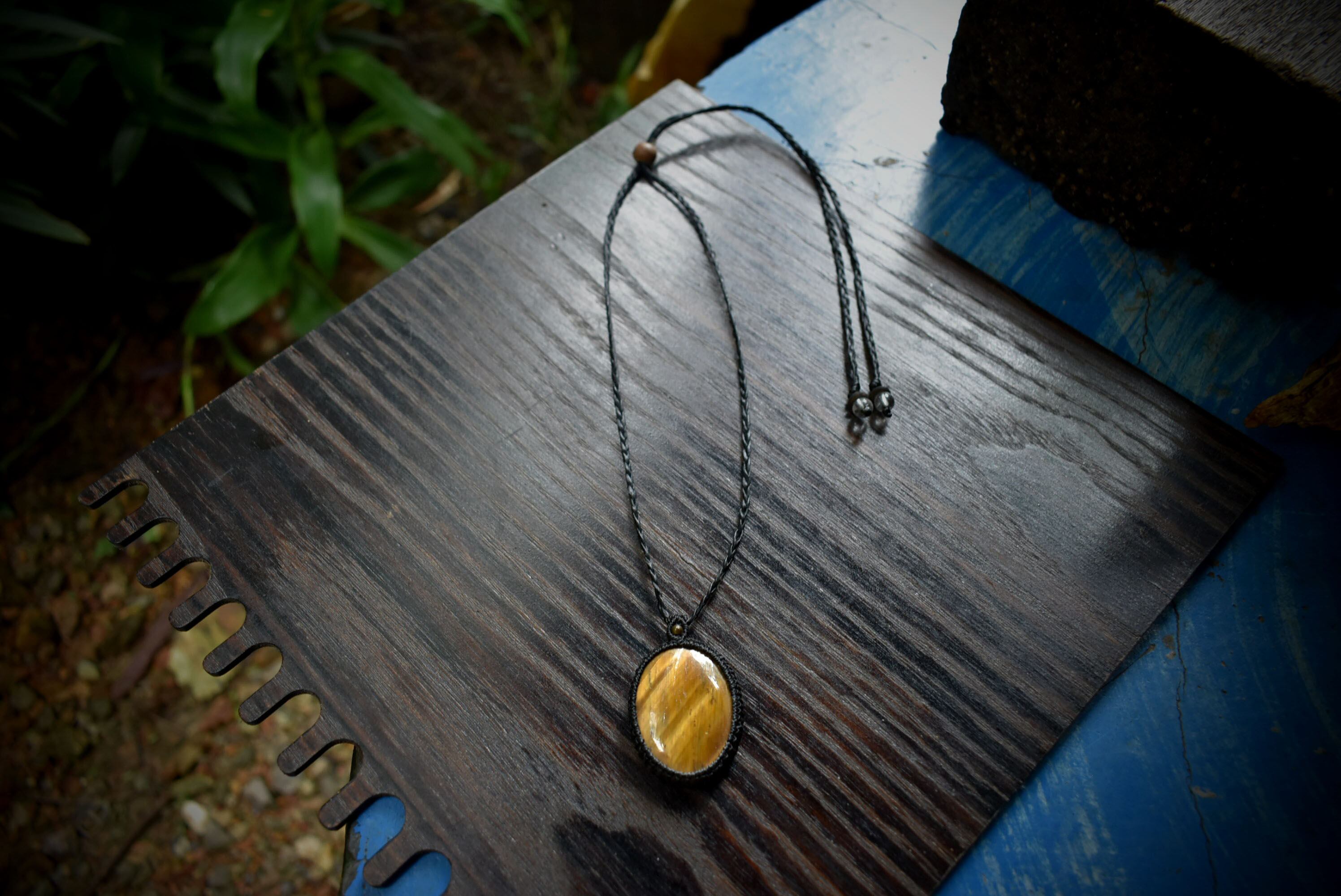 大きめなタイガーアイをなるべくシンプルにマクラメ囲み編み込みしたペンダントです。