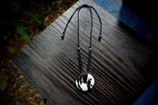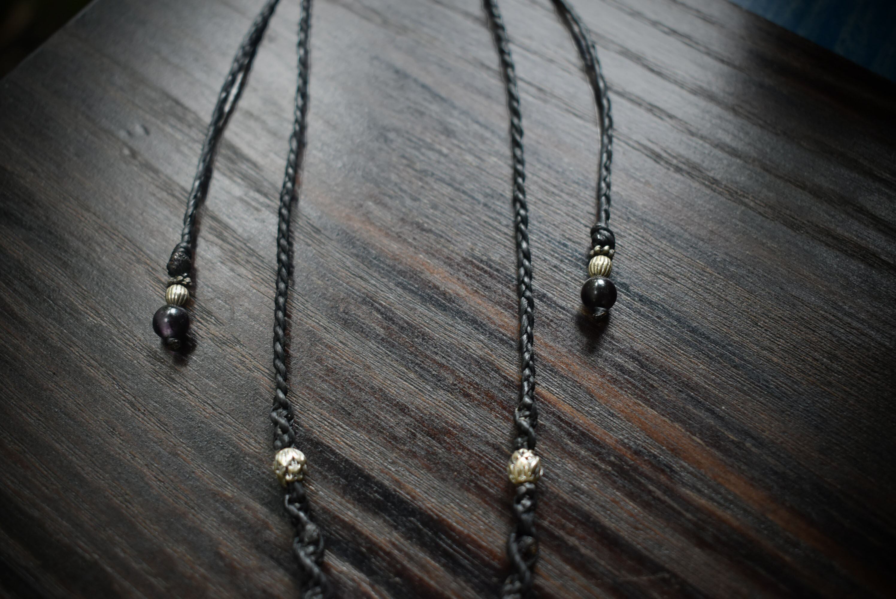 白黒がはっきりのめずらしい天然石ドーナツ型。石の中には格好の良い縦模様が入り込んでいます。マクラメ編み装飾にて丁寧にひと編みひと編み編み込み、シルバーメッキビーズを使用。ペンダントネックレスに仕上げました。