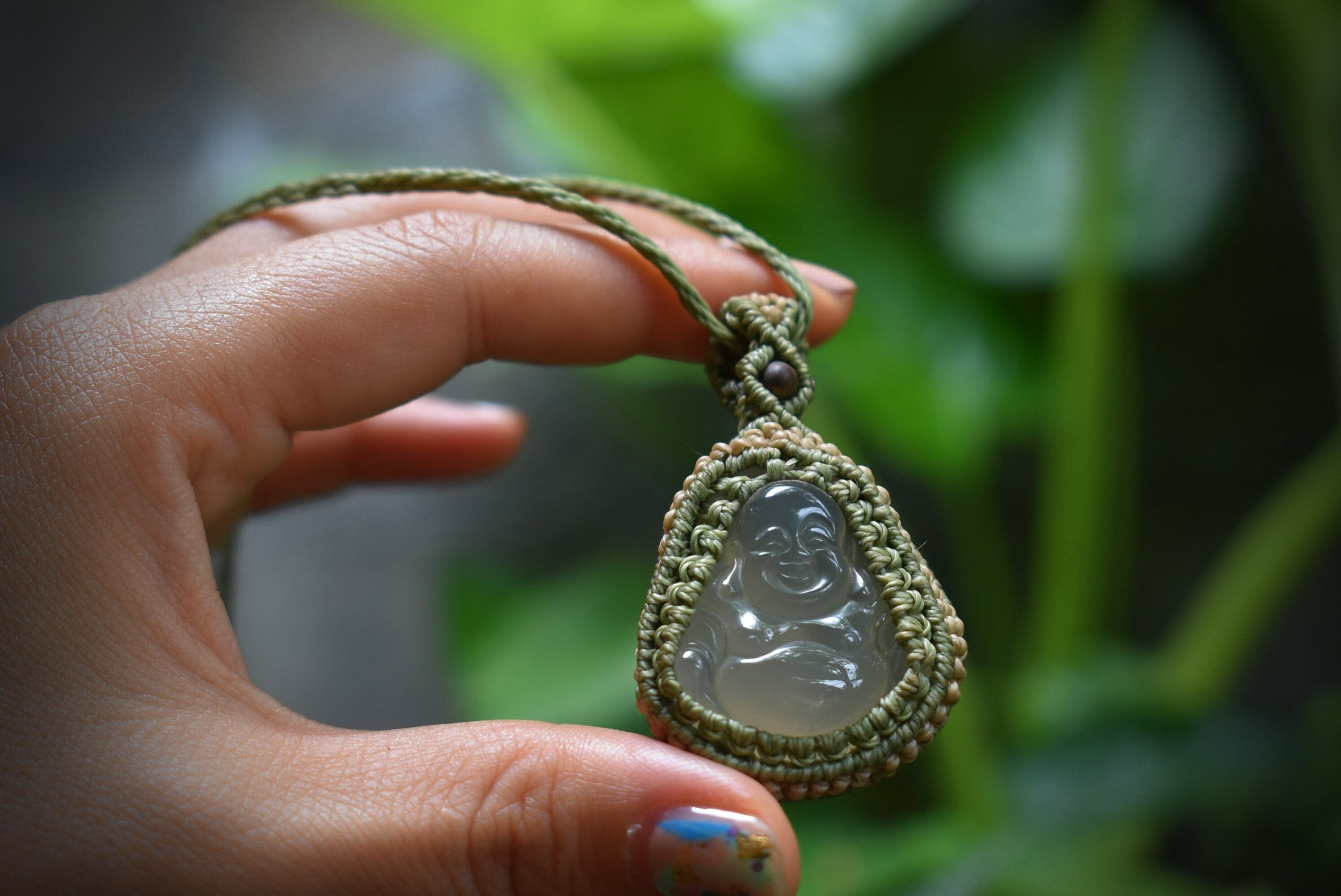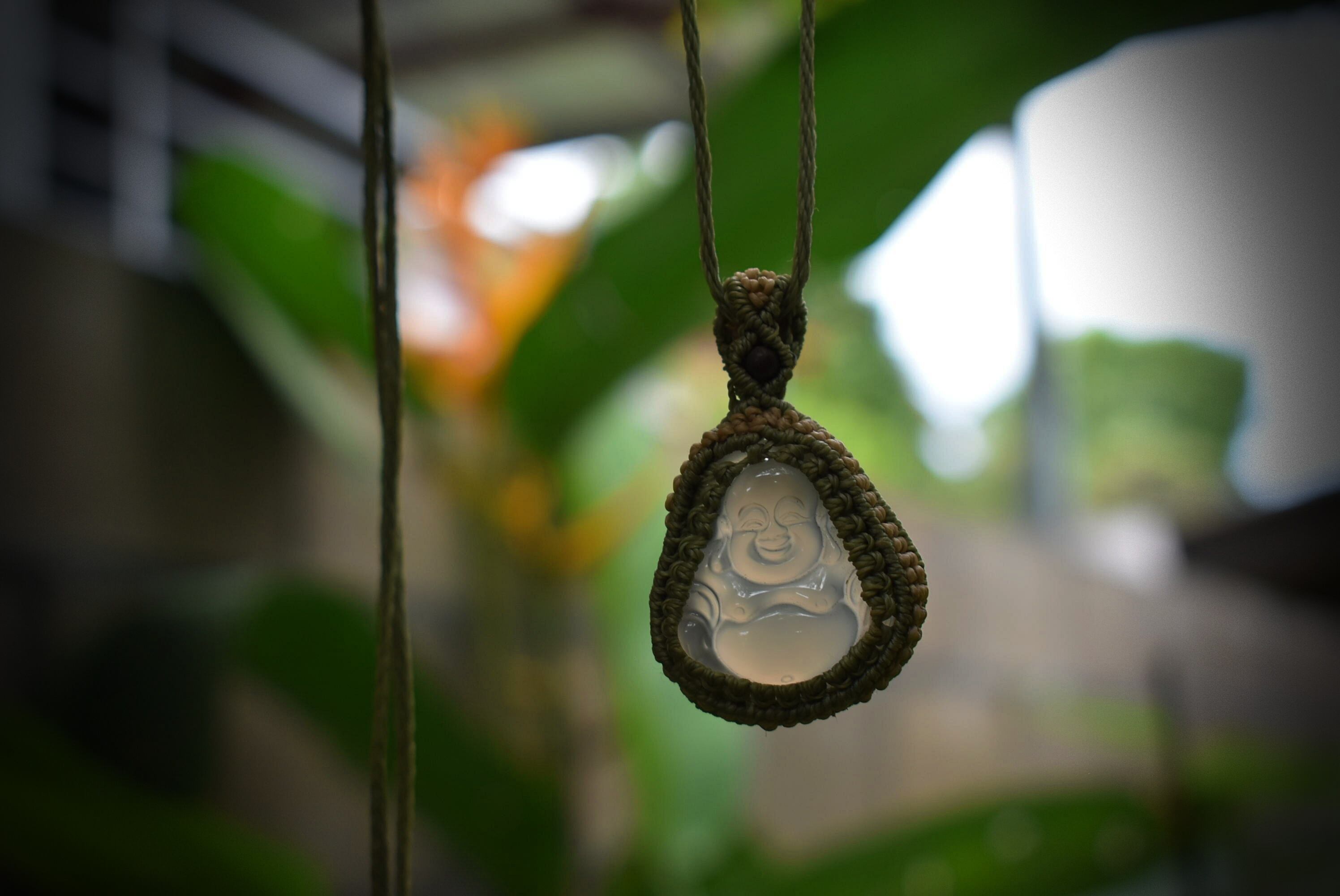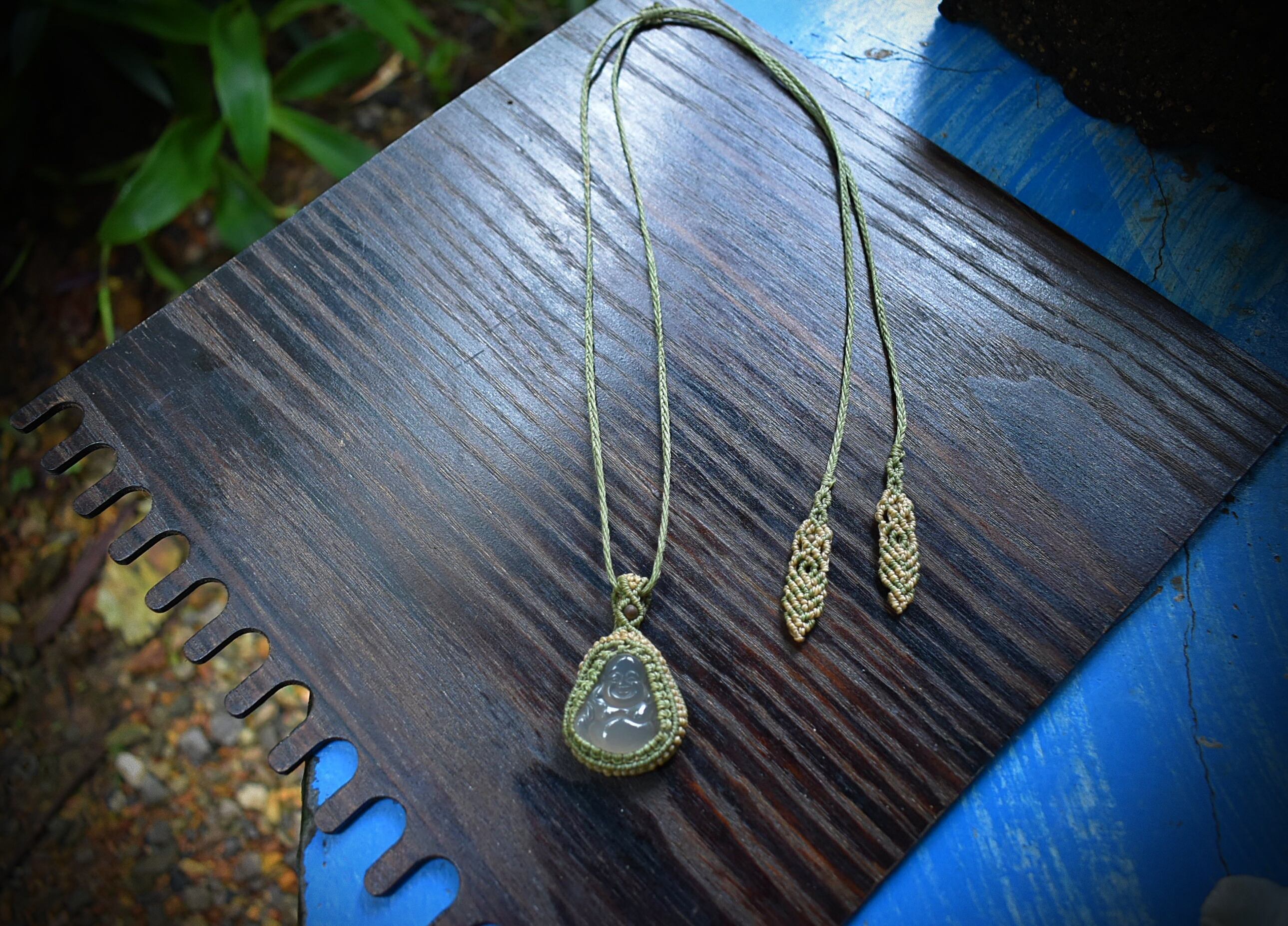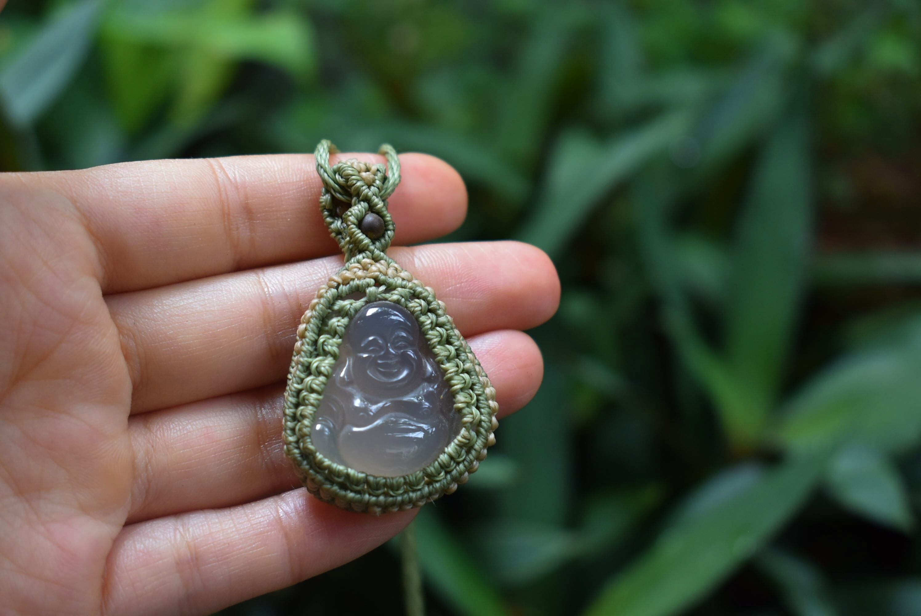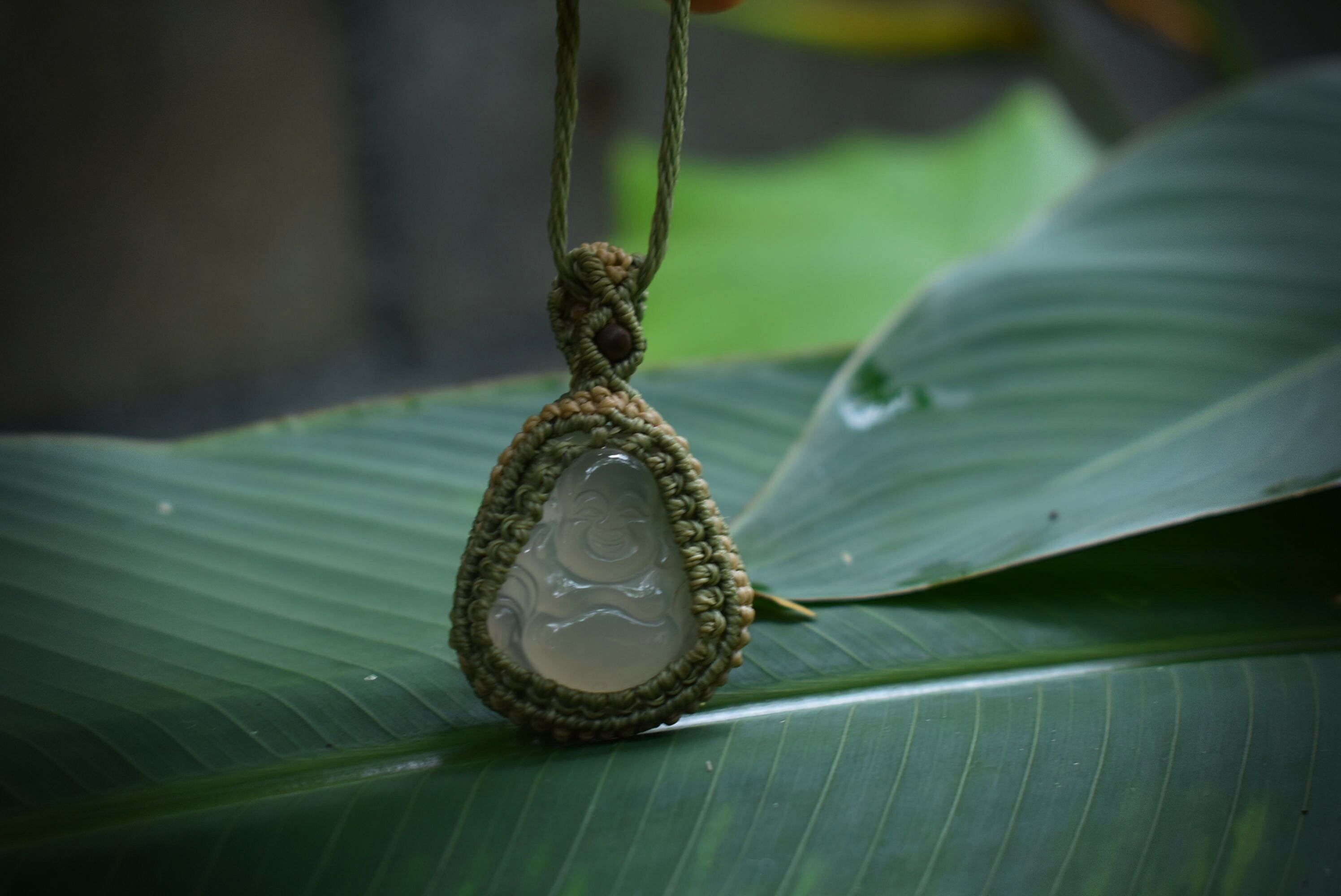 この縁起の良さそうなブッダさまをしっかりとマクラメ編み装飾を施し、ペンダントに仕上げました。