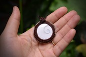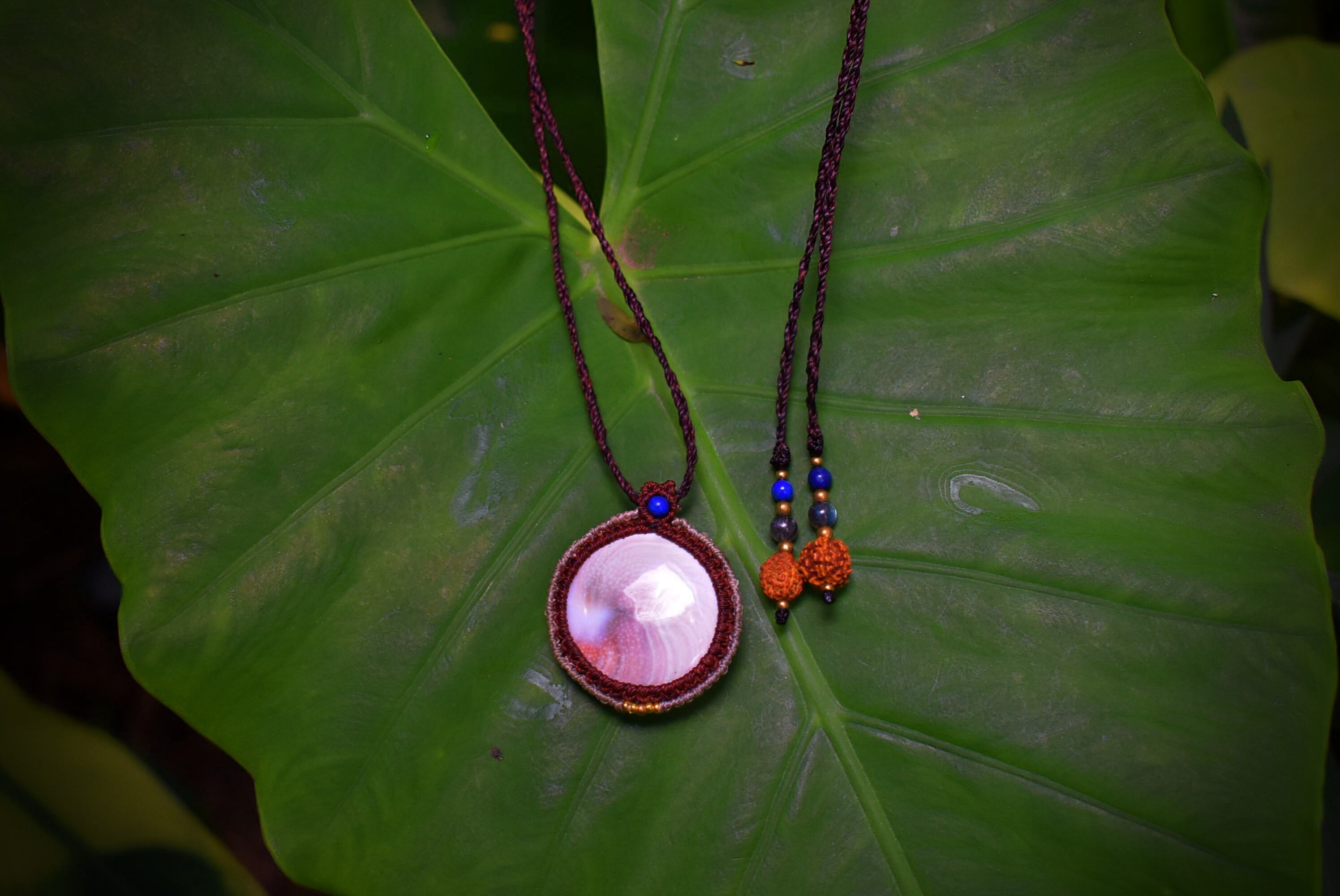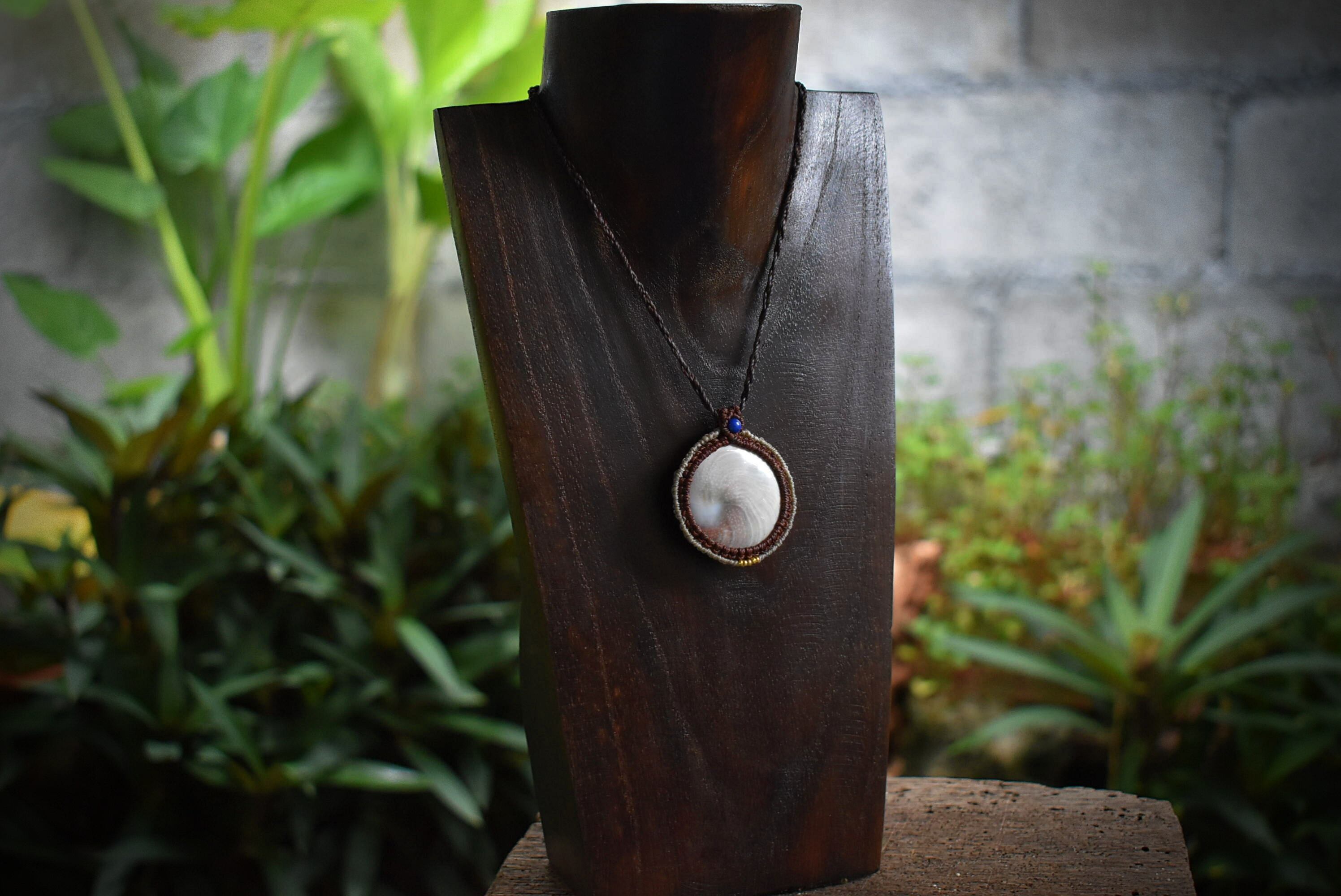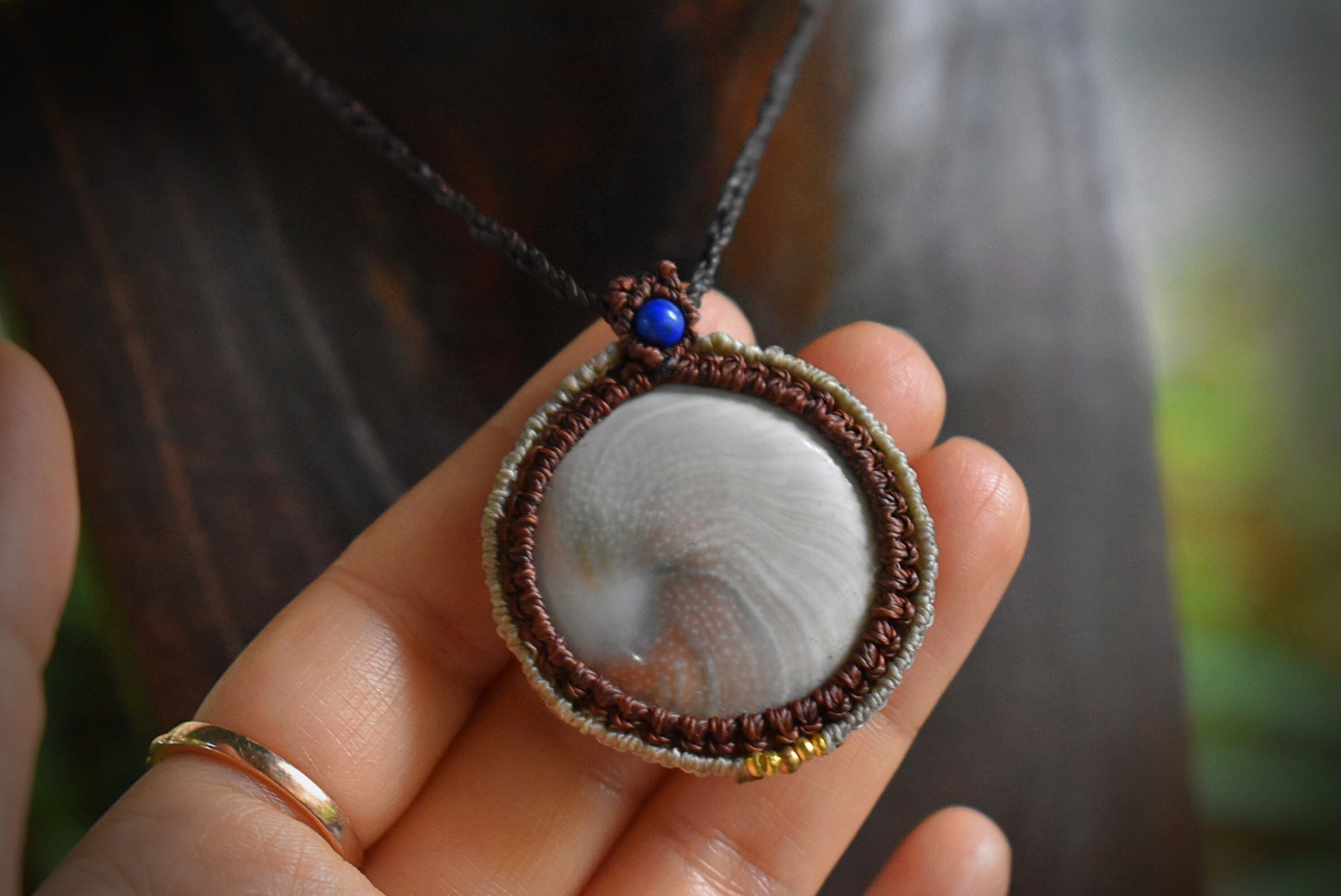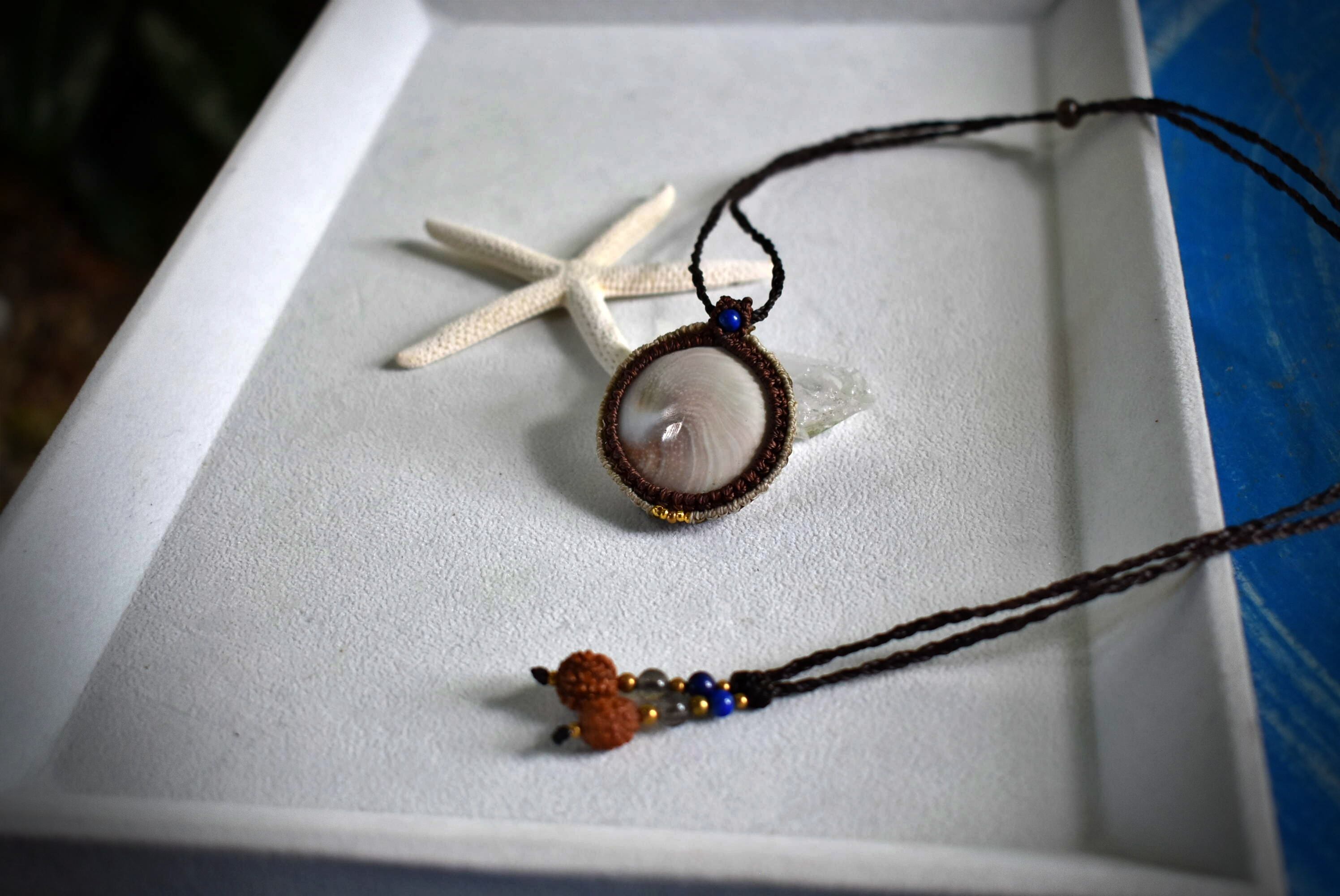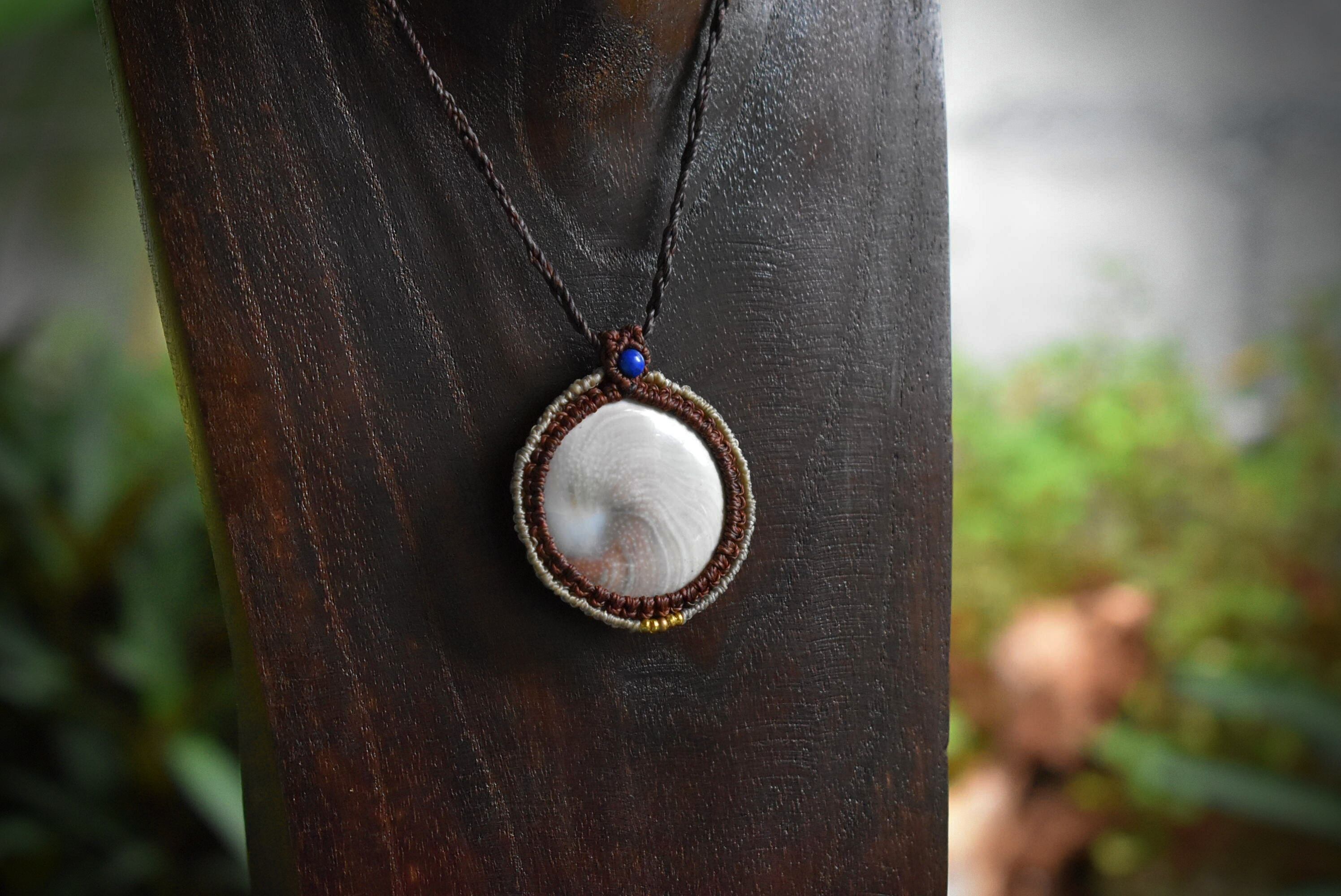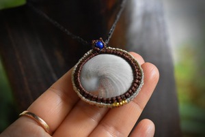 後ろ部分にもきちんと渦が巻いているシヴァアイ。この部分が昔からいい事がある貝殻だと欧米では言われているようです。色味はナチュラルなホワイトカラーに渦巻く芸術的な模様のグリーン、ブラウン..とうっすら描かれている海の贈り物をマクラメ編みペンダントにして仕上げました。ラピスラズリビーズをトップに使用しております。