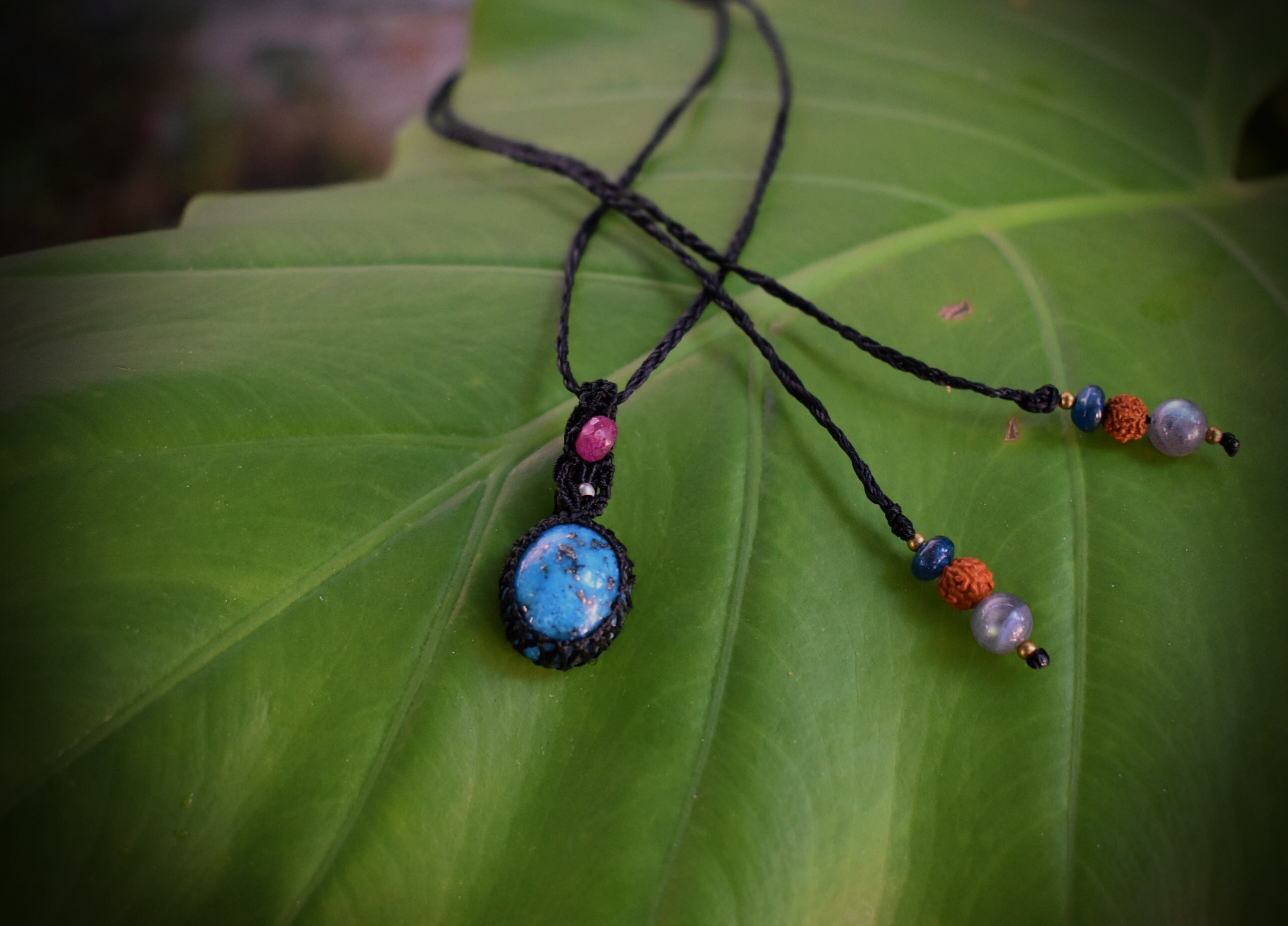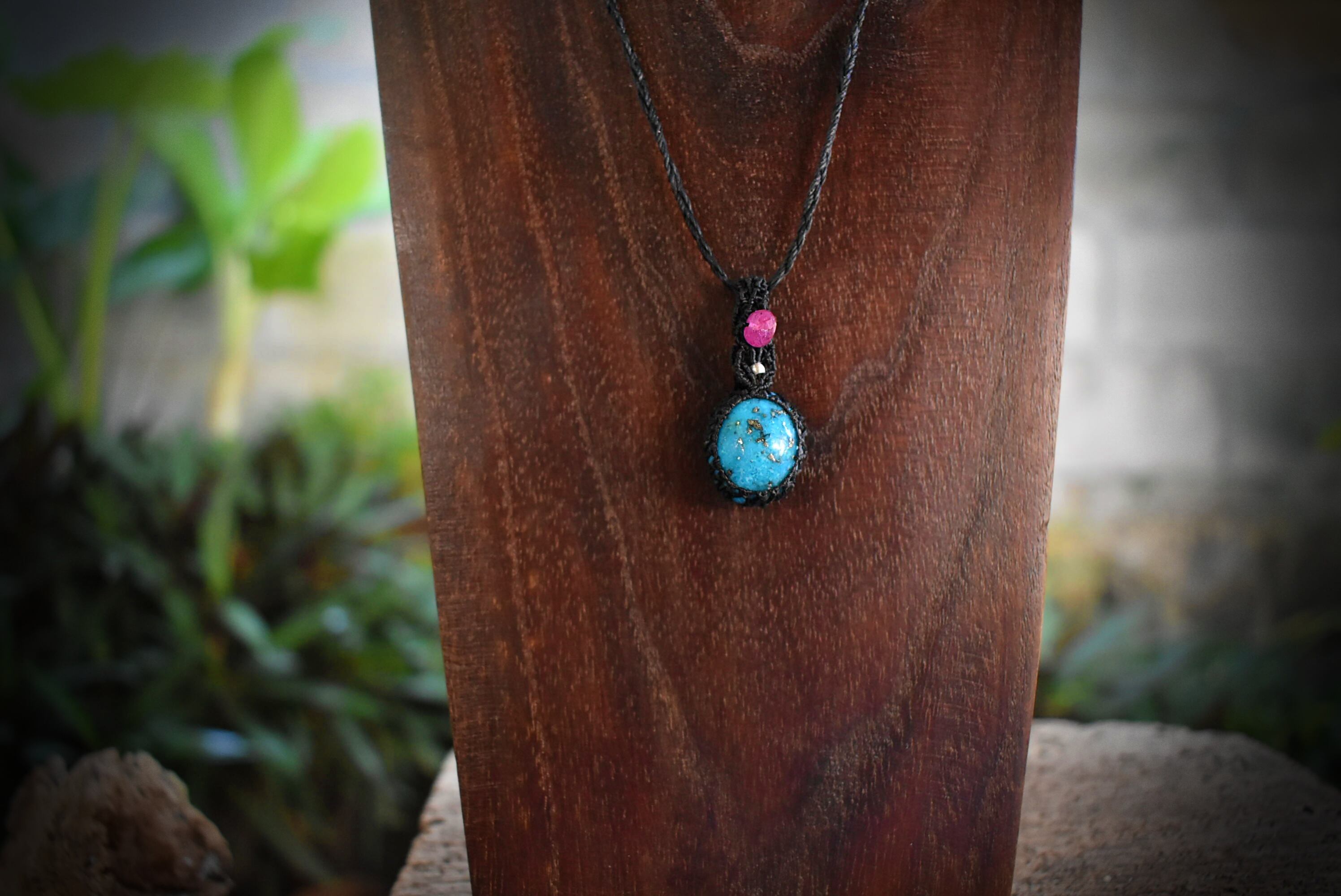 プラチナの模様がぷっくりとヘルシーなボディの中から咲いているかのような、色味の良い、美しく研磨が施された高品質のイラン産ターコイズを細い蝋引き糸を使用してマクラメ編みペンダントに仕上げました。シルバー92.5ビーズをトップにアクセントとして使用し、色艶良い天然ルビービーズをあしらいました。