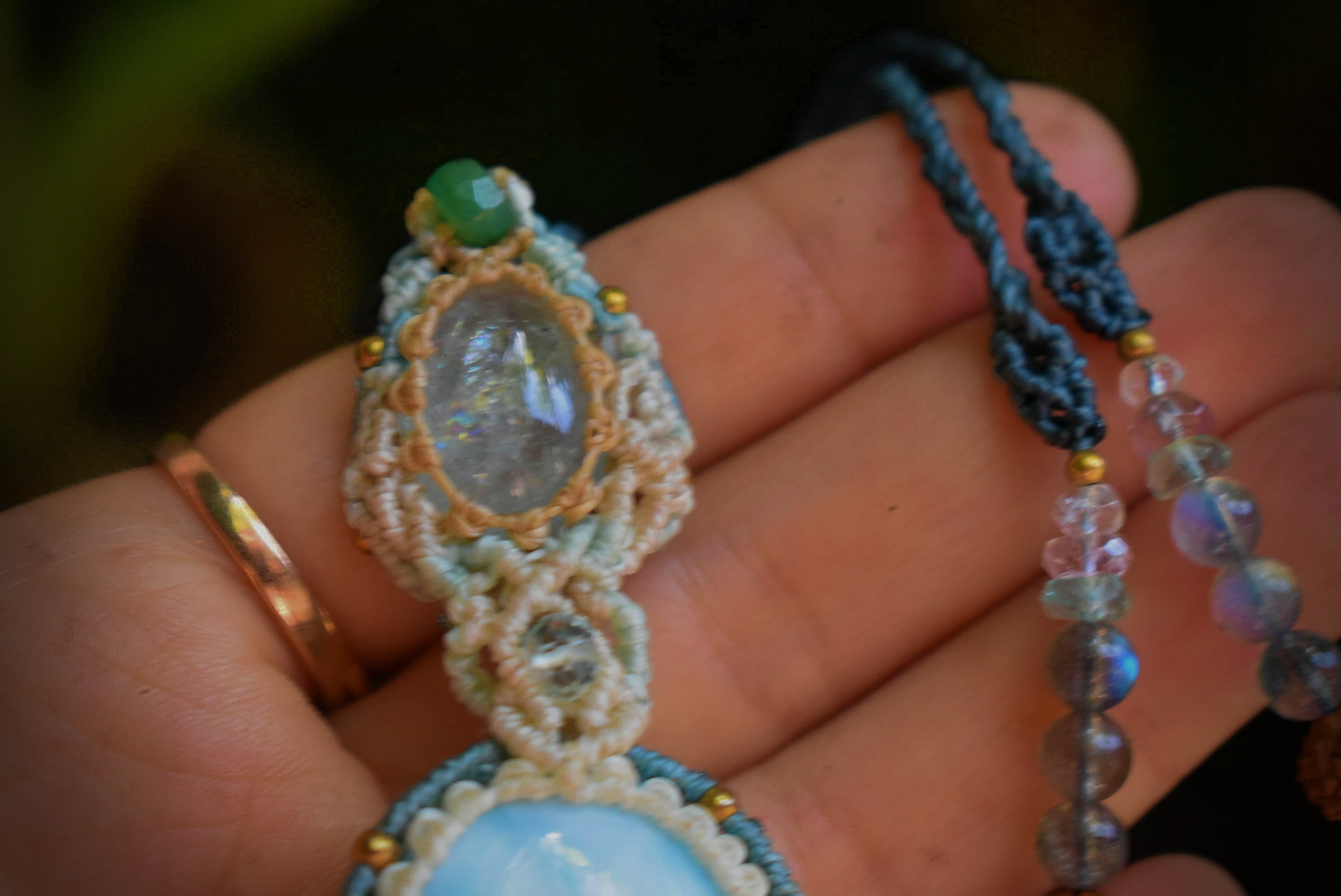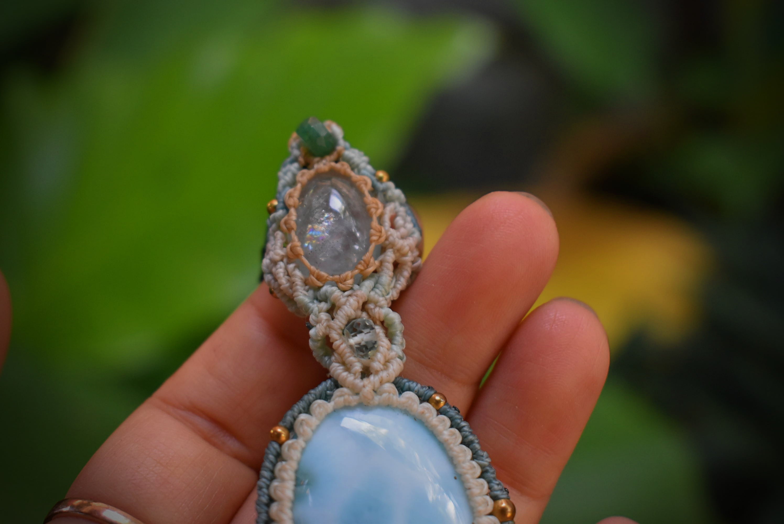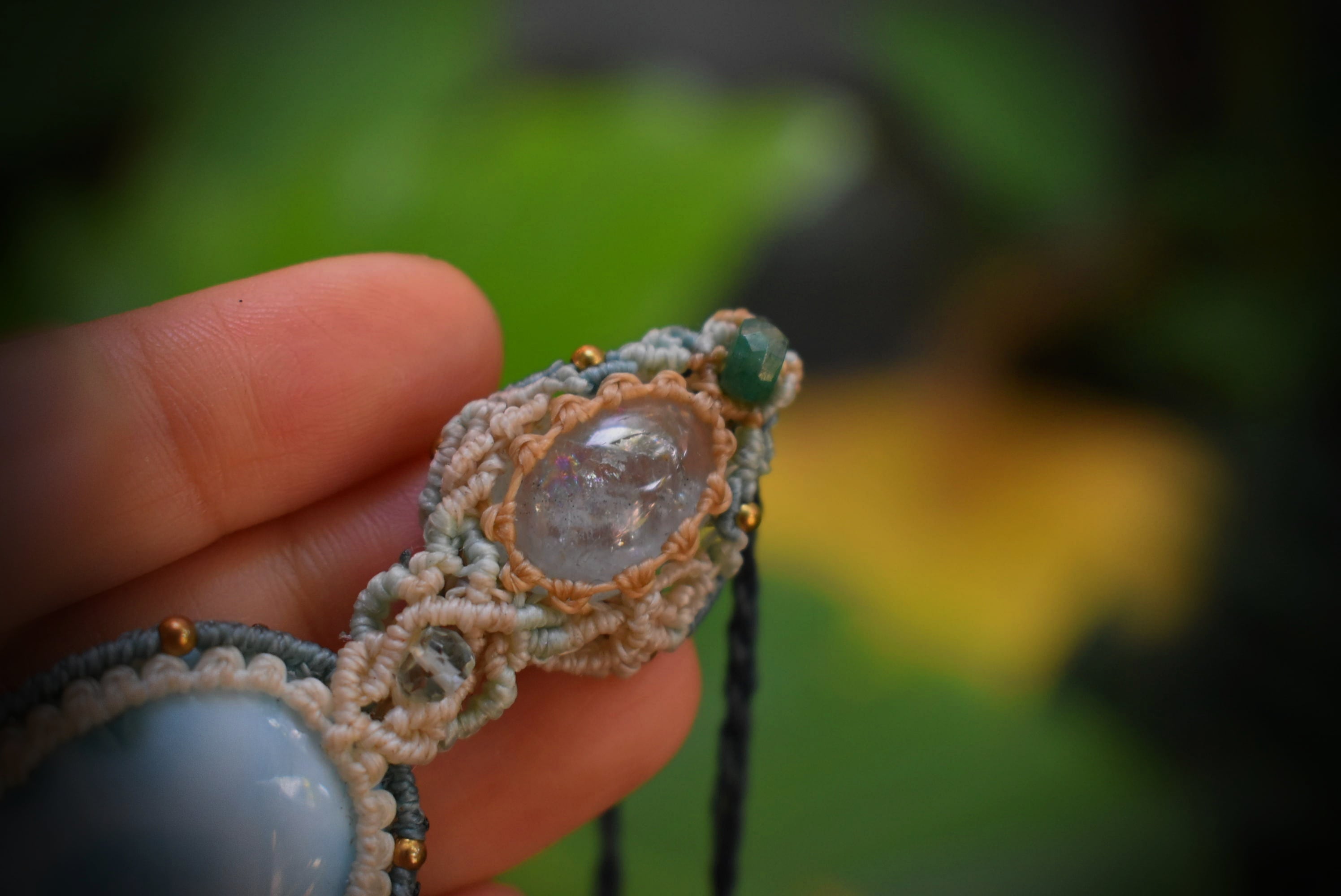 大きな虹がはっきりと見えるアクアマリンと光にかざすとほんのりと透けるラリマー。どちらもブルーカラーが印象的な石ですが、この2つをひとつにマクラメ編み装飾にて連結させてひとつのペンダントに仕上げました。