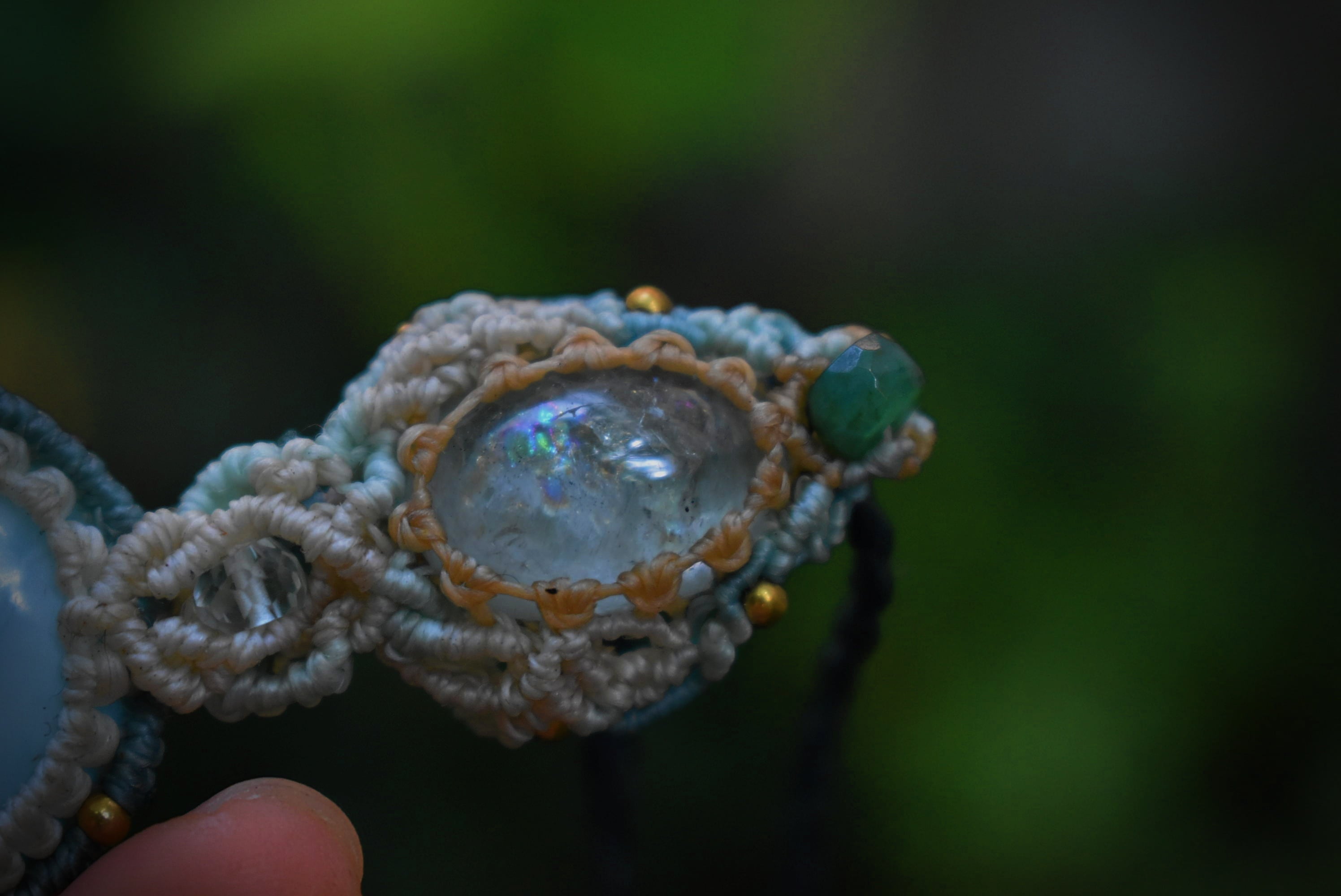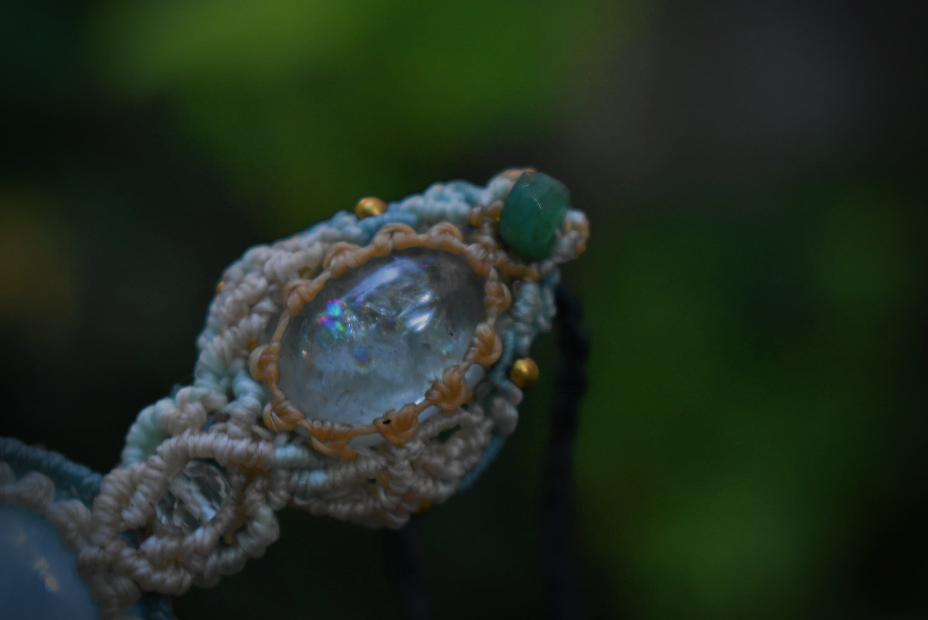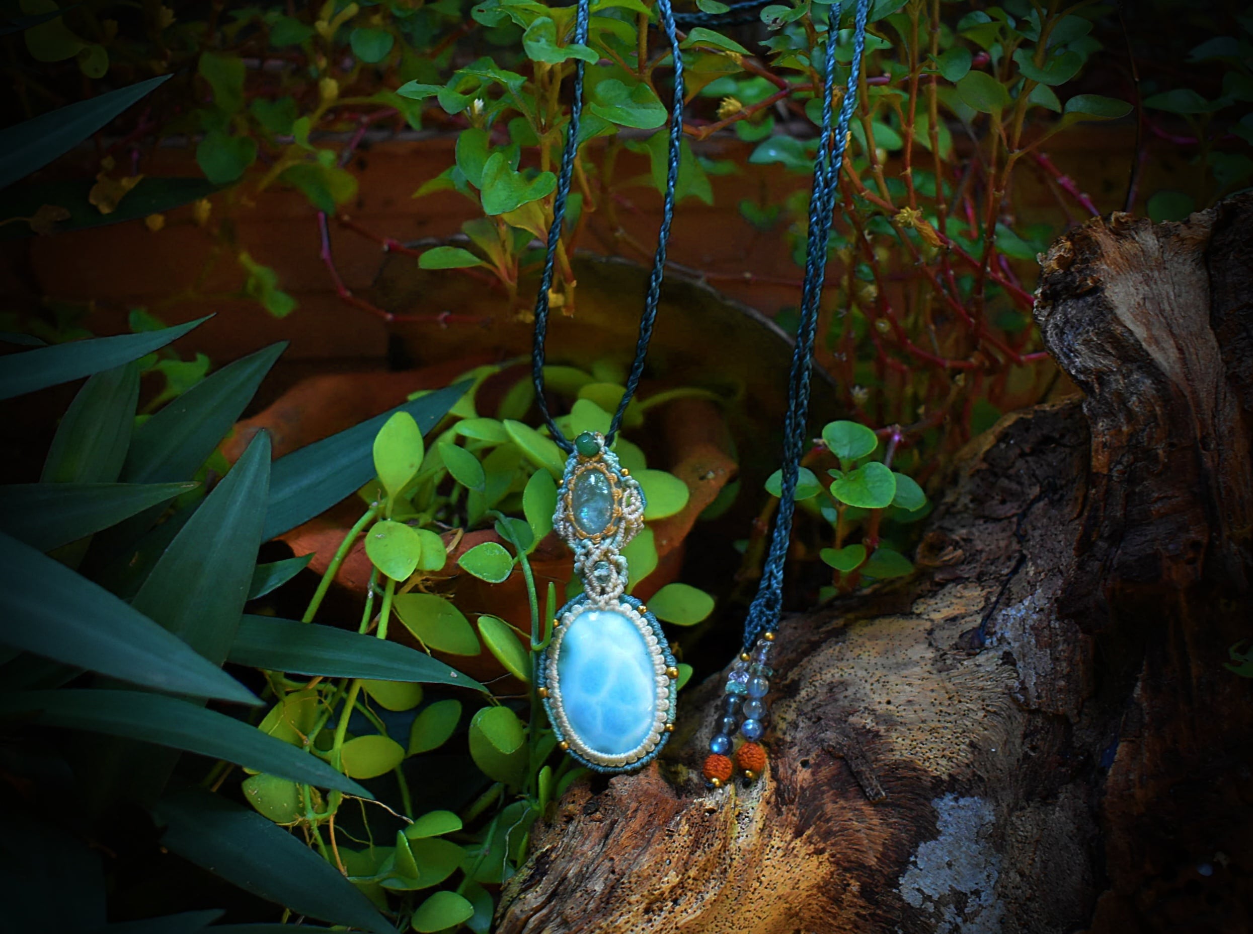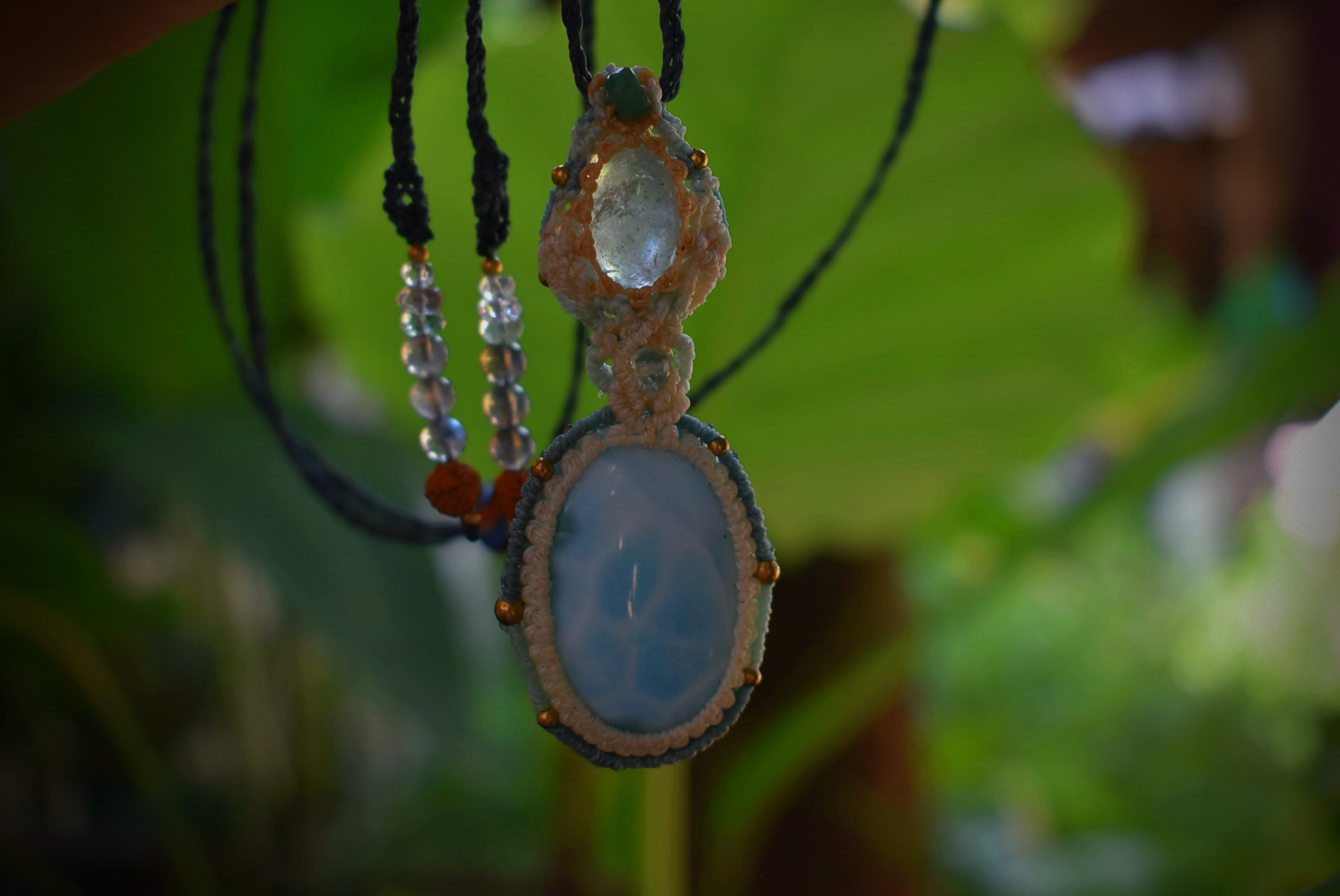 大きな虹がはっきりと見えるアクアマリンと光にかざすとほんのりと透けるラリマー。どちらもブルーカラーが印象的な石ですが、この2つをひとつにマクラメ編み装飾にて連結させてひとつのペンダントに仕上げました。