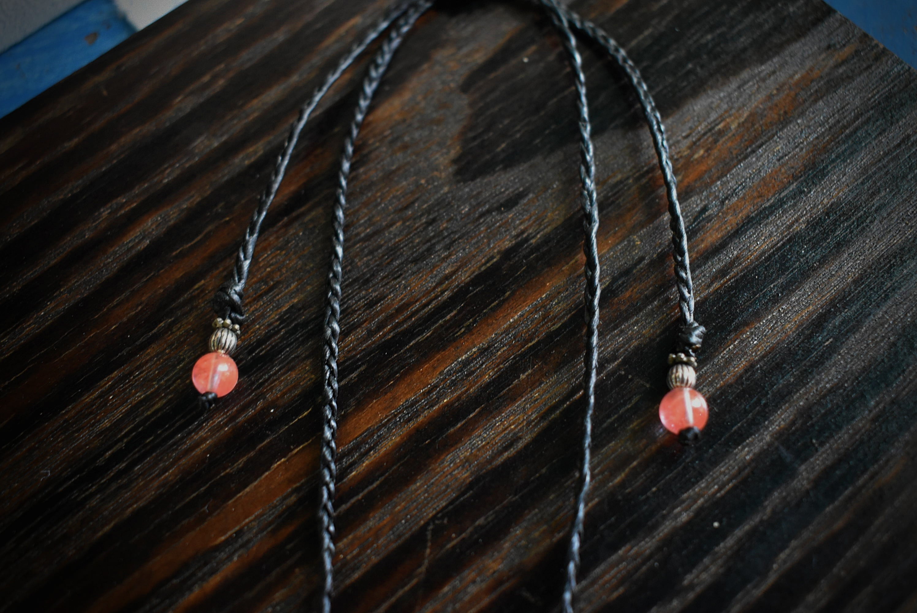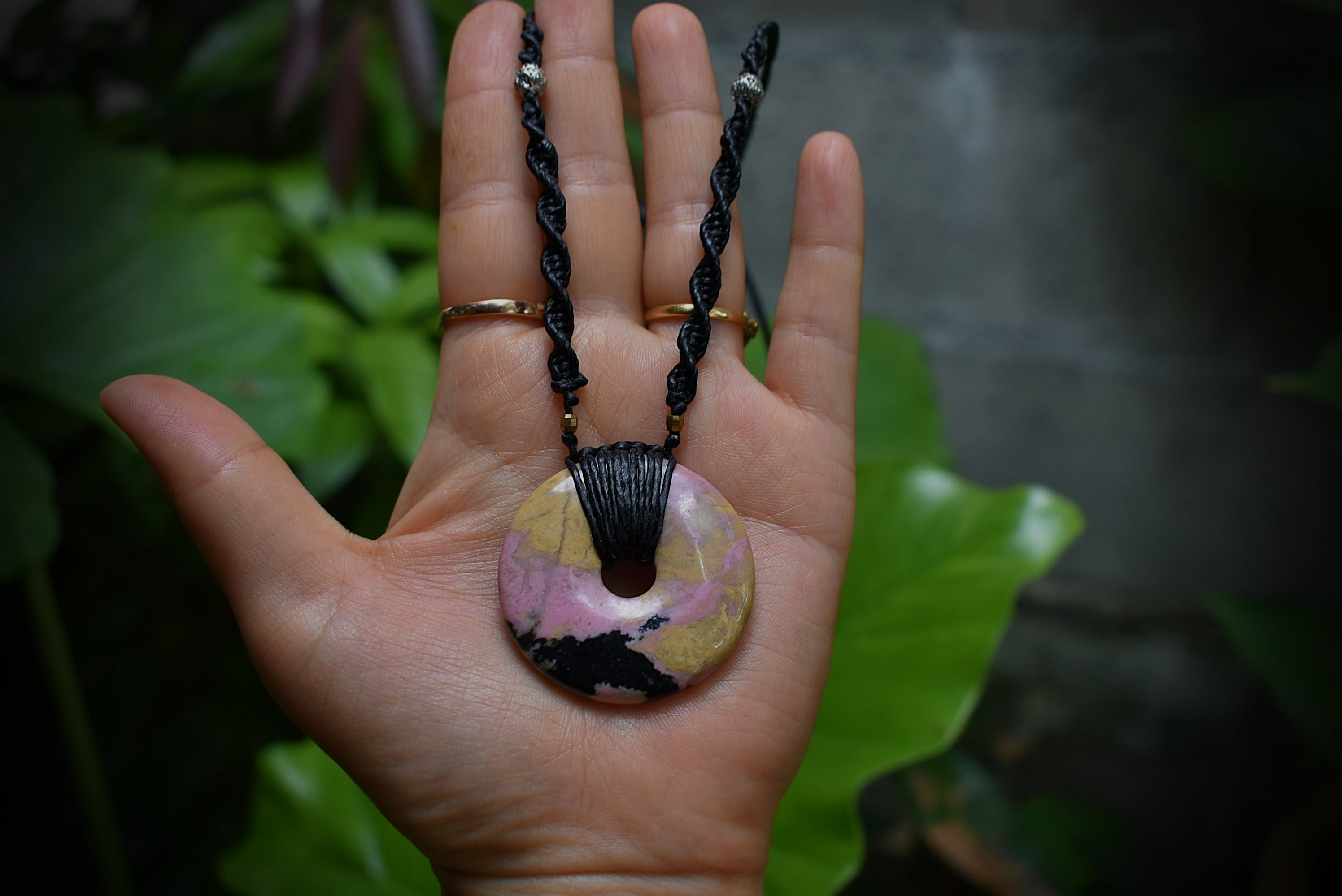 ピンクが入り込んだ色味がはっきりのゼブラジャスパードーナツ型。愛らしくも格好よくもあるドーナツ型。マクラメ編み装飾にて丁寧にひと編みひと編み編み込み、シルバーメッキビーズを使用。ペンダントネックレスに仕上げました。