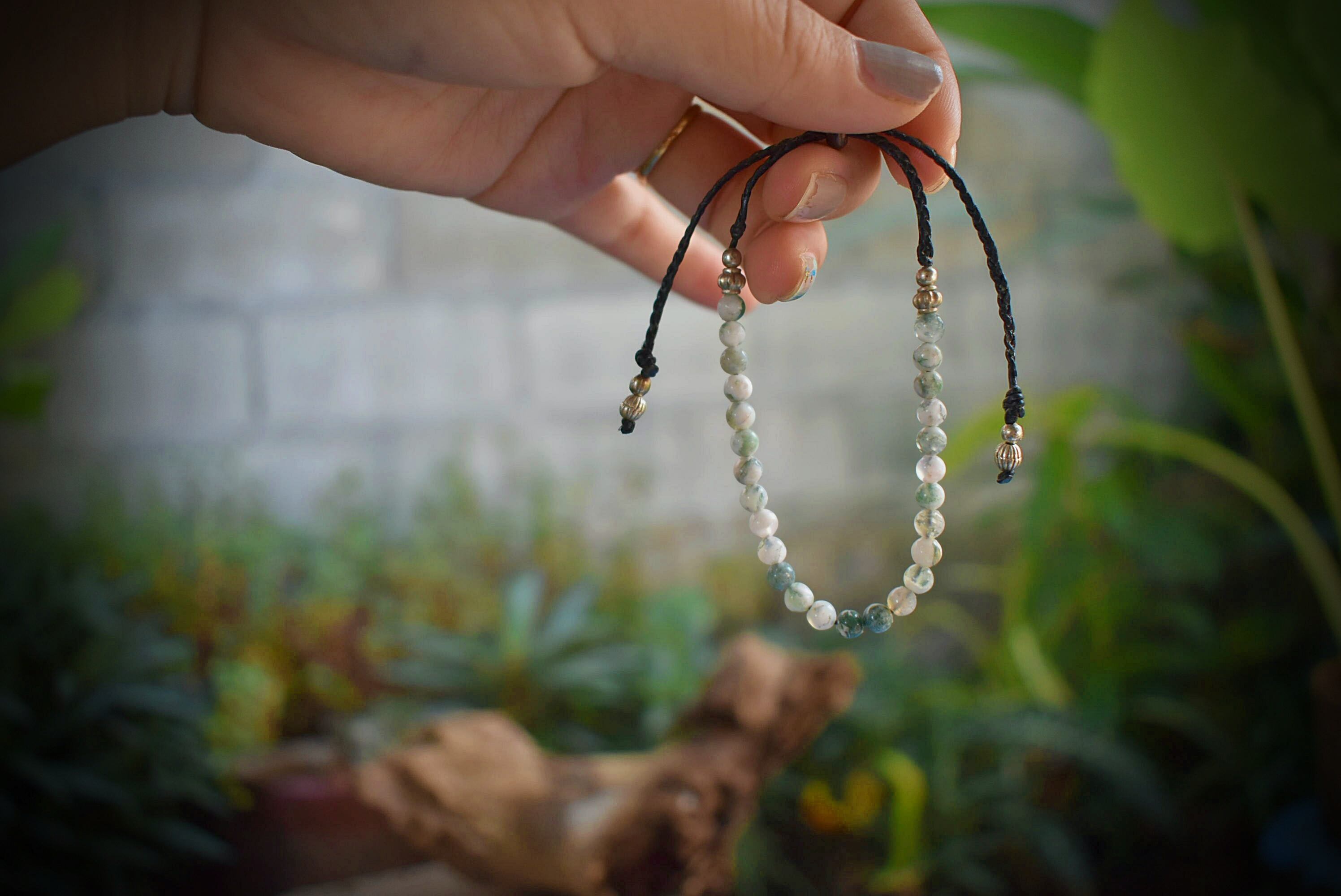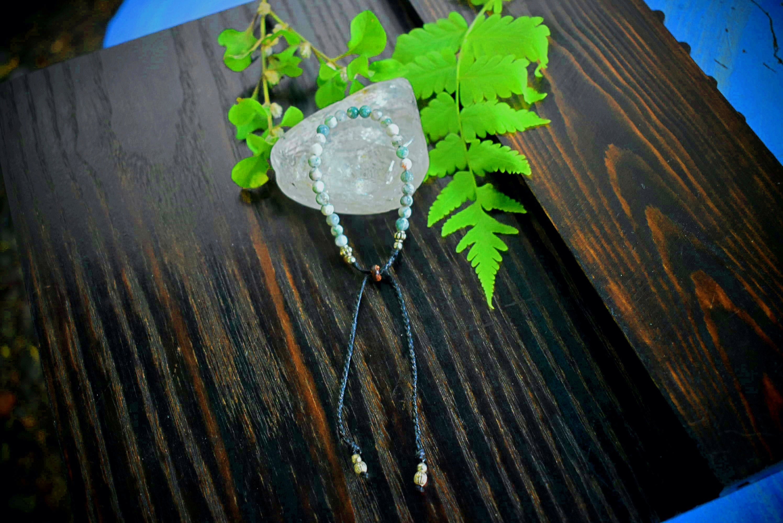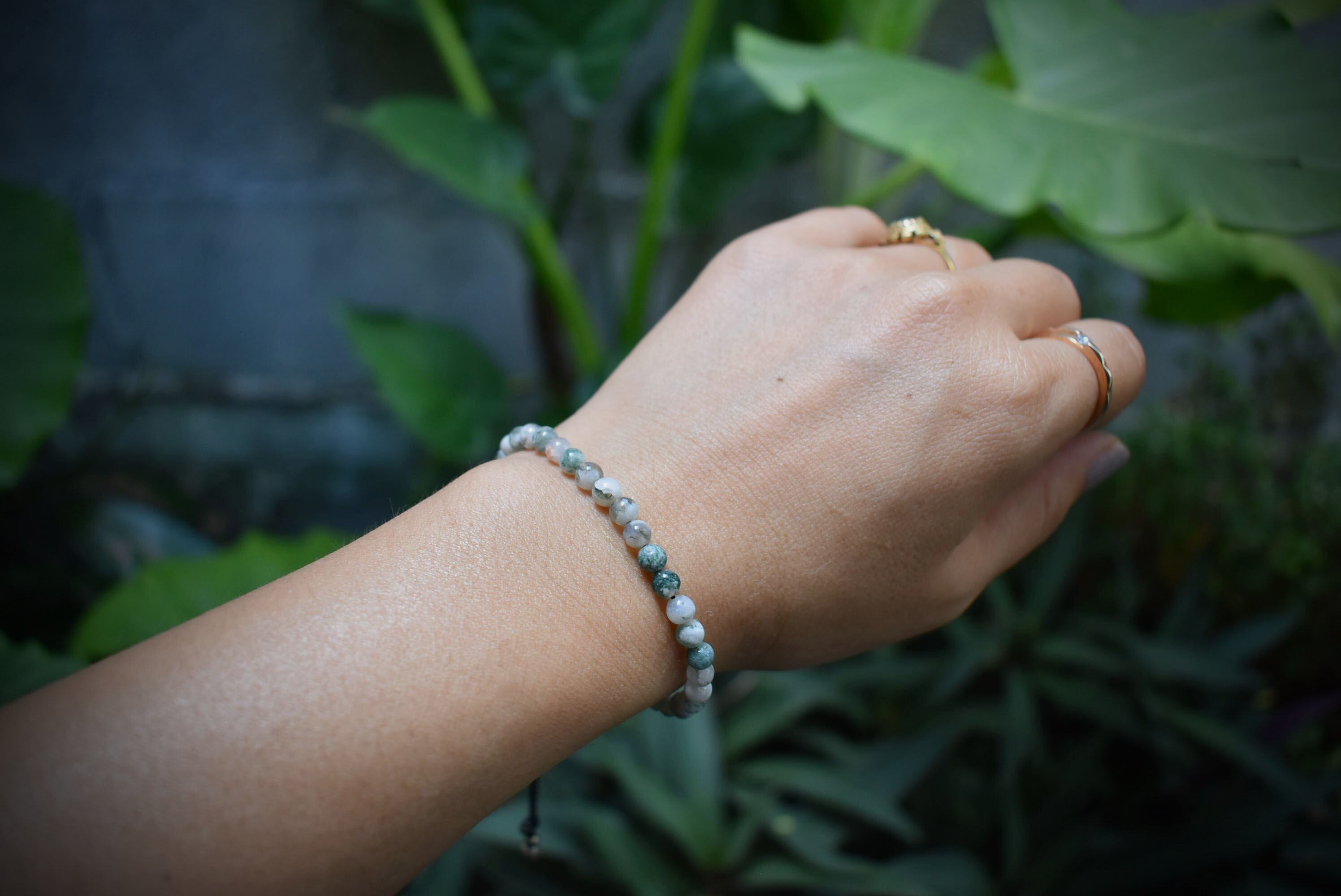 肌によく馴染む蝋引き糸と共にブレスレットに仕上げました。