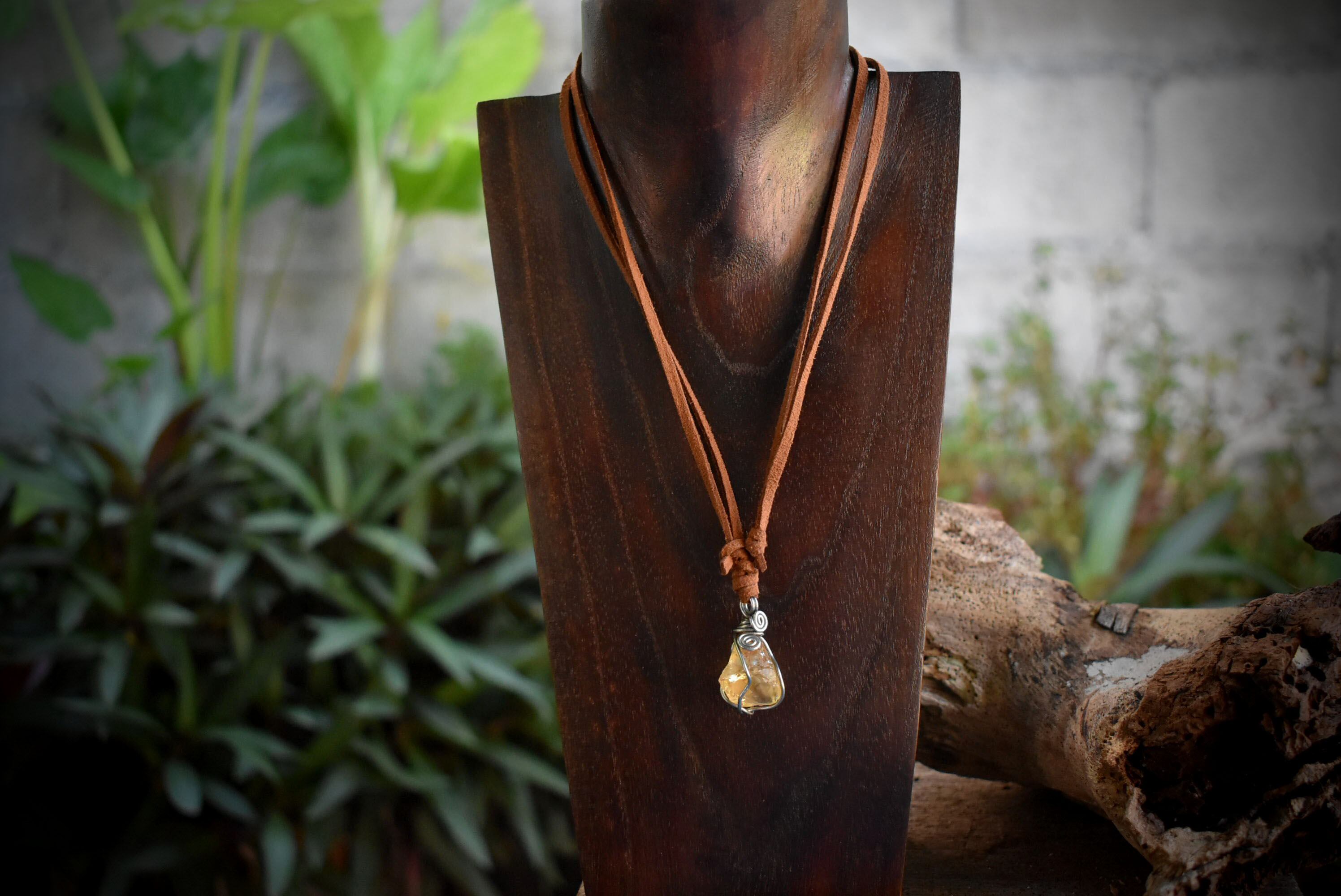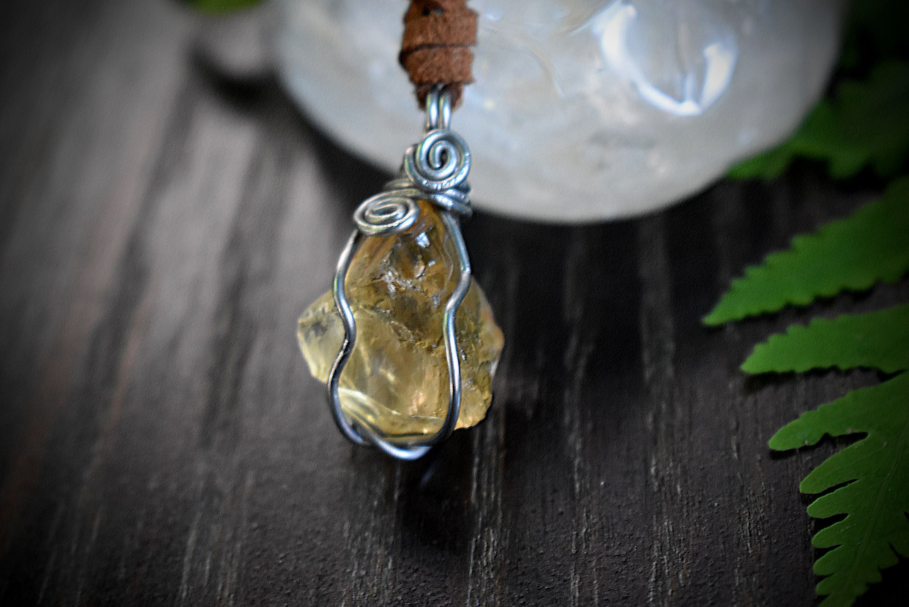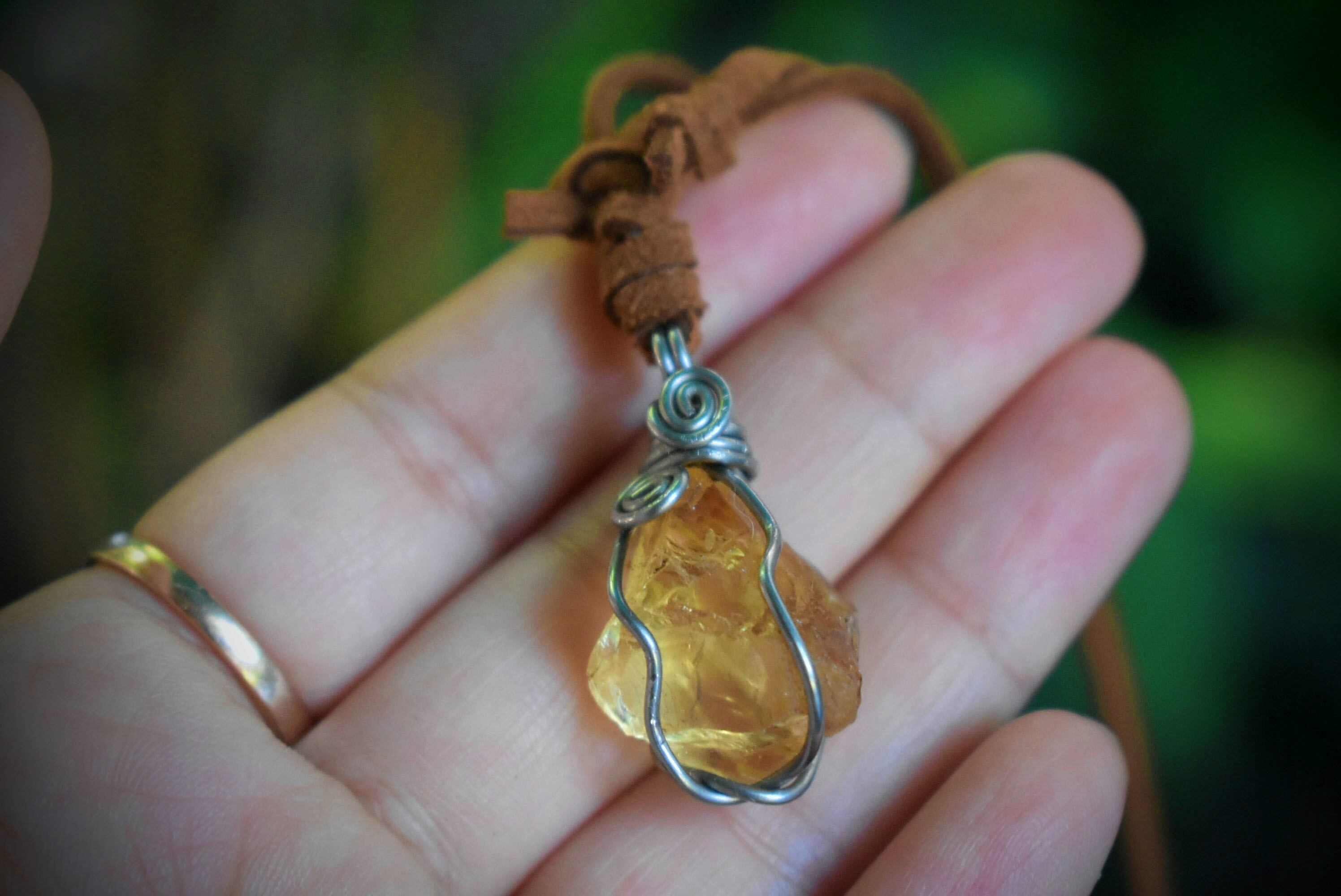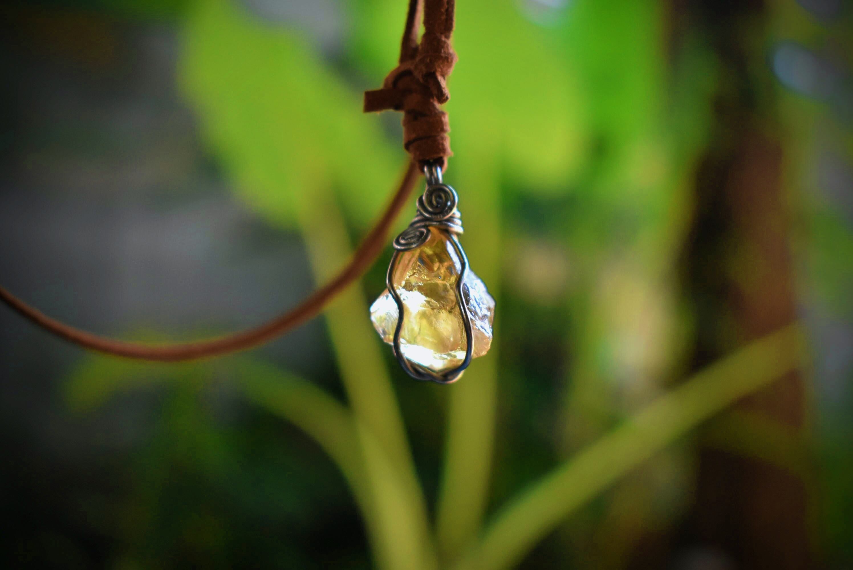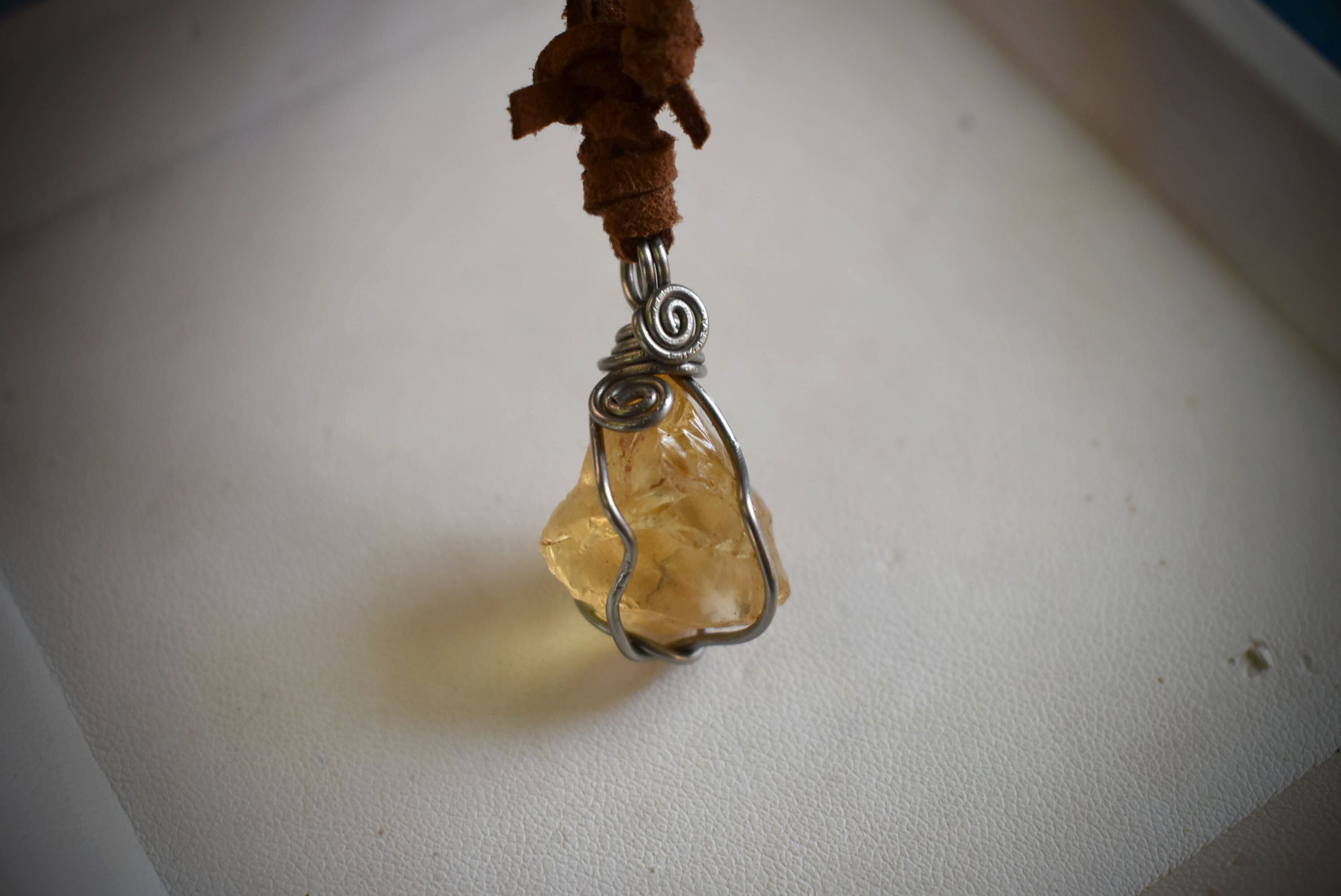 天然石シトリン原石を使用し、ワイヤーワークを施してペンダントトップに仕上げました。石の周りをぐるっとワイヤーで囲んであります。