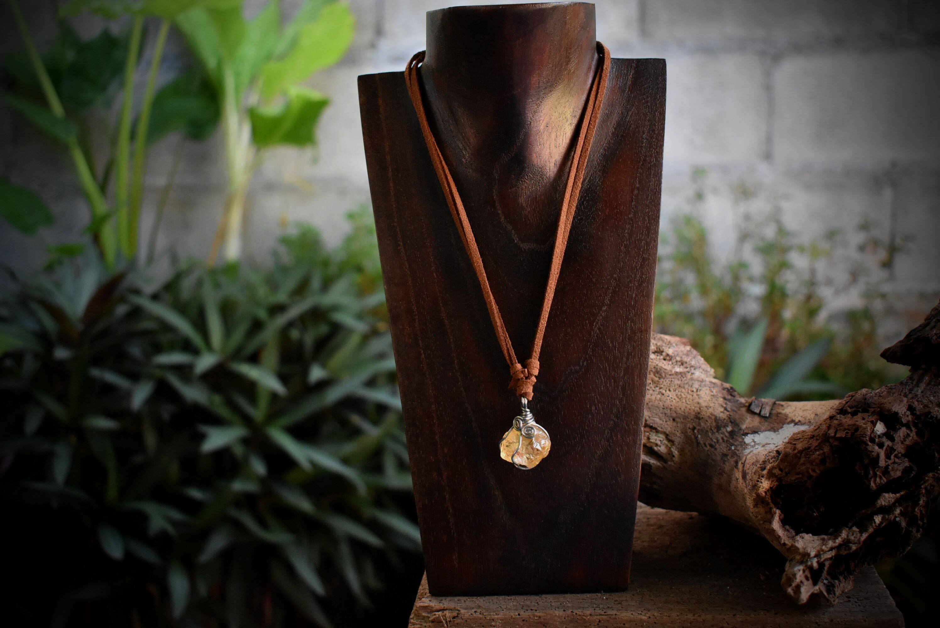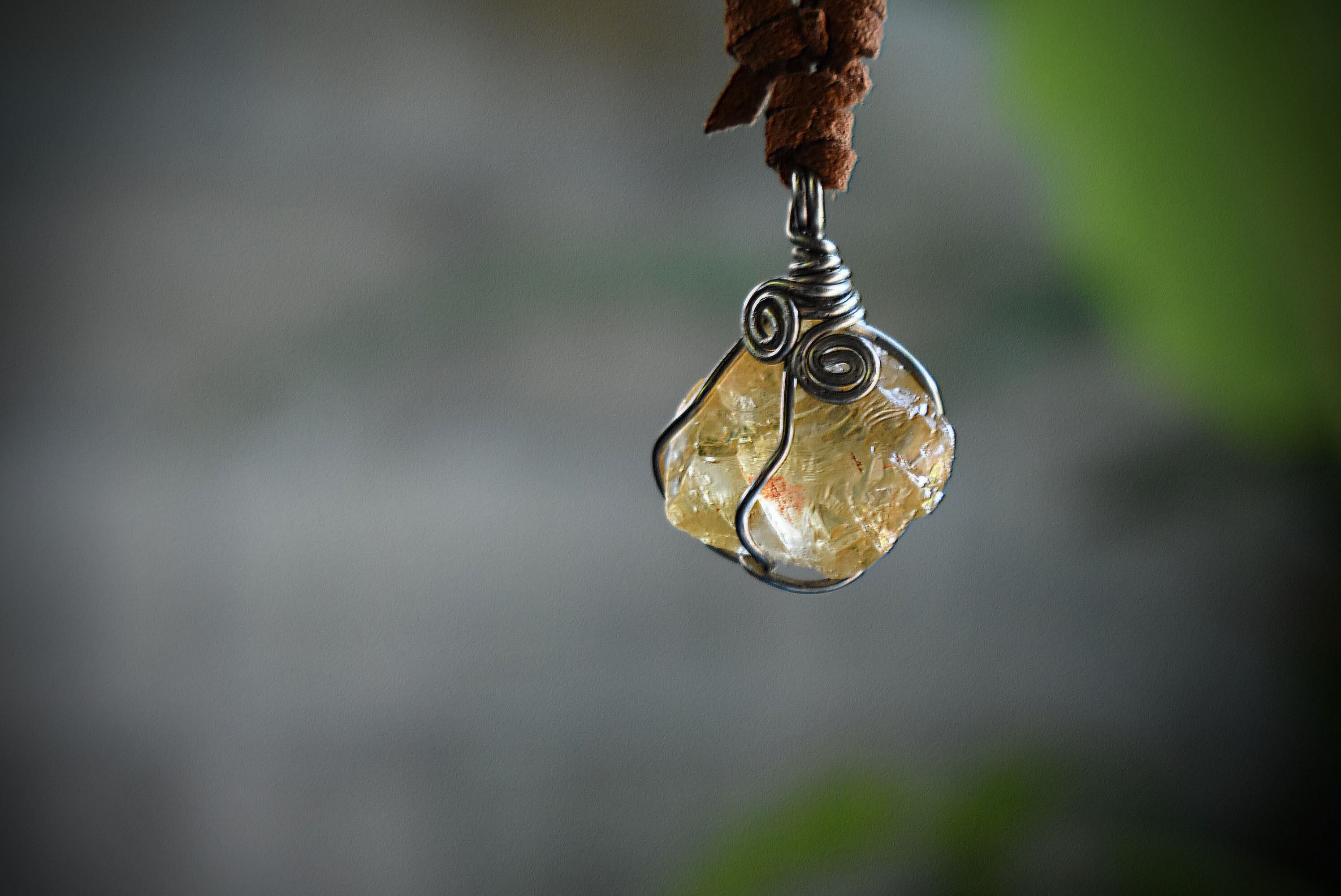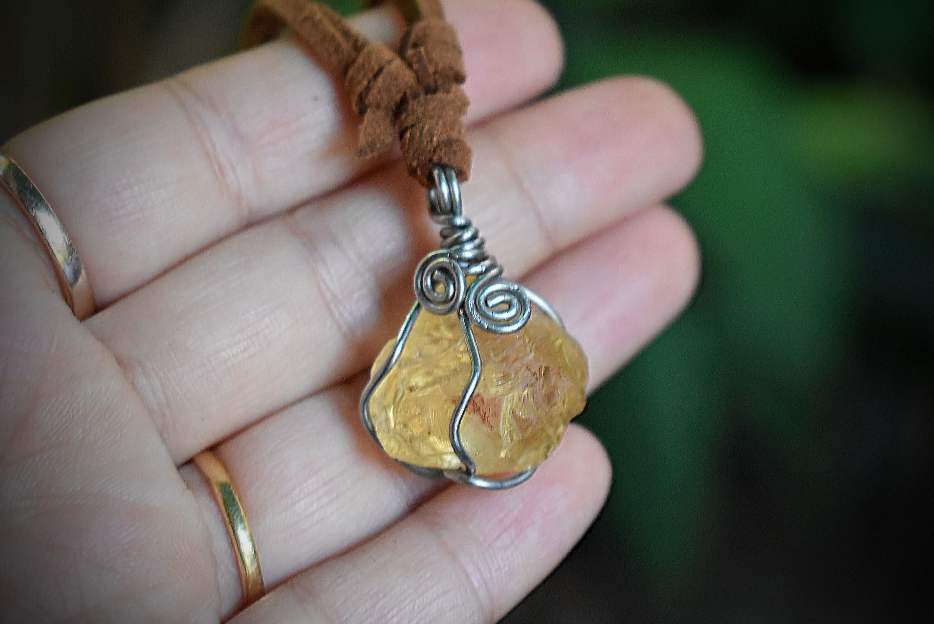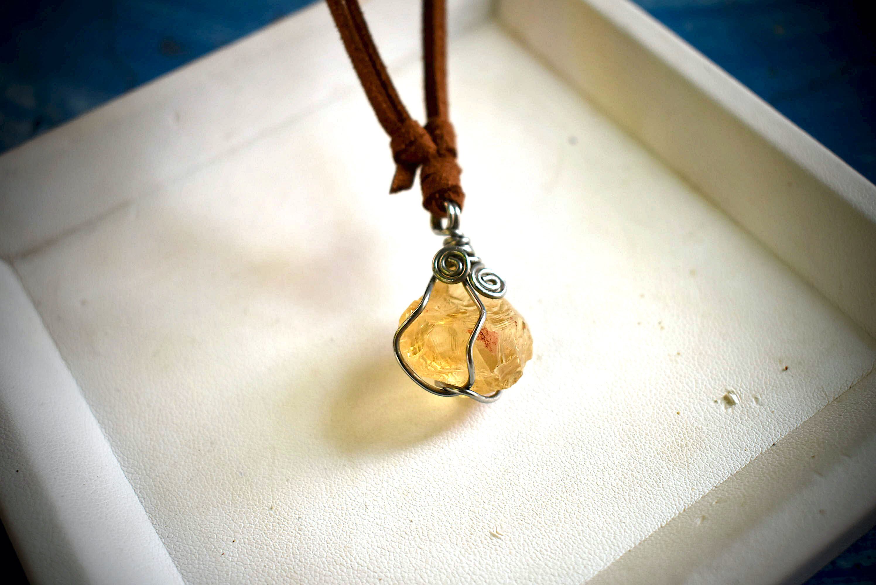 天然石シトリン原石を使用し、ワイヤーワークを施してペンダントトップに仕上げました。石の周りをぐるっとワイヤーで囲んであります。