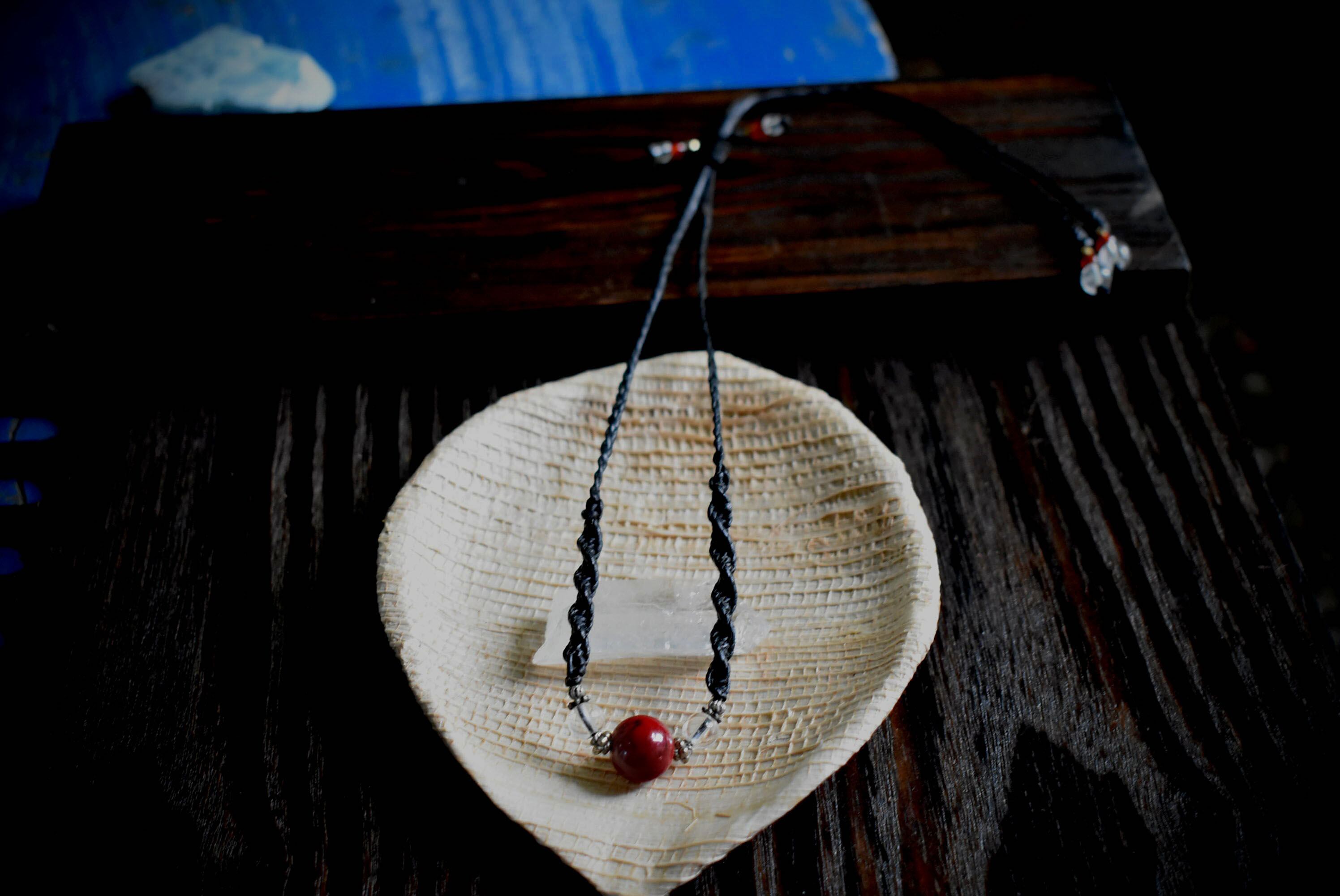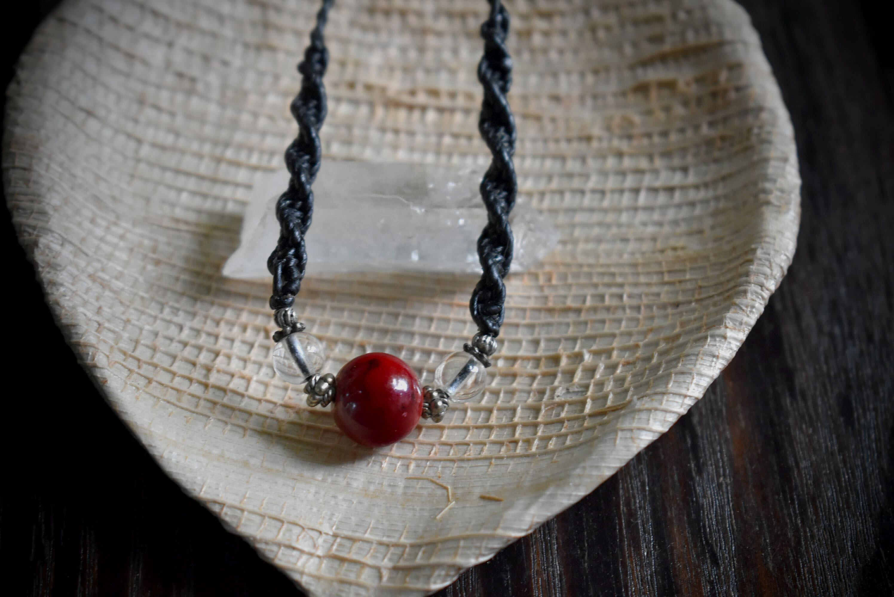 レッドコーラルをイメージさせるアンティークガラスビーズを使用してシンプルにマクラメ編み装飾を施し、チョーカーネックレスに仕上げました。