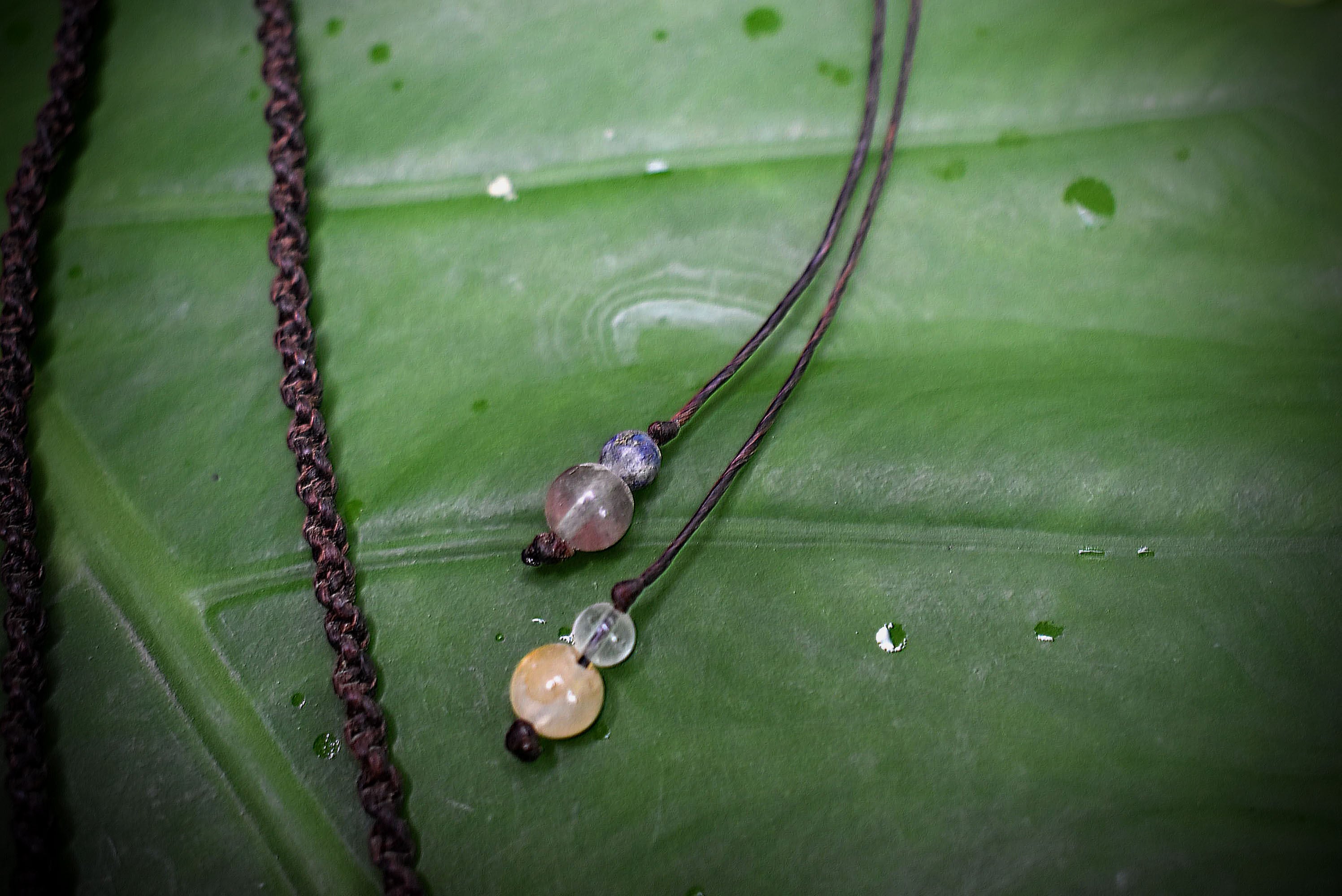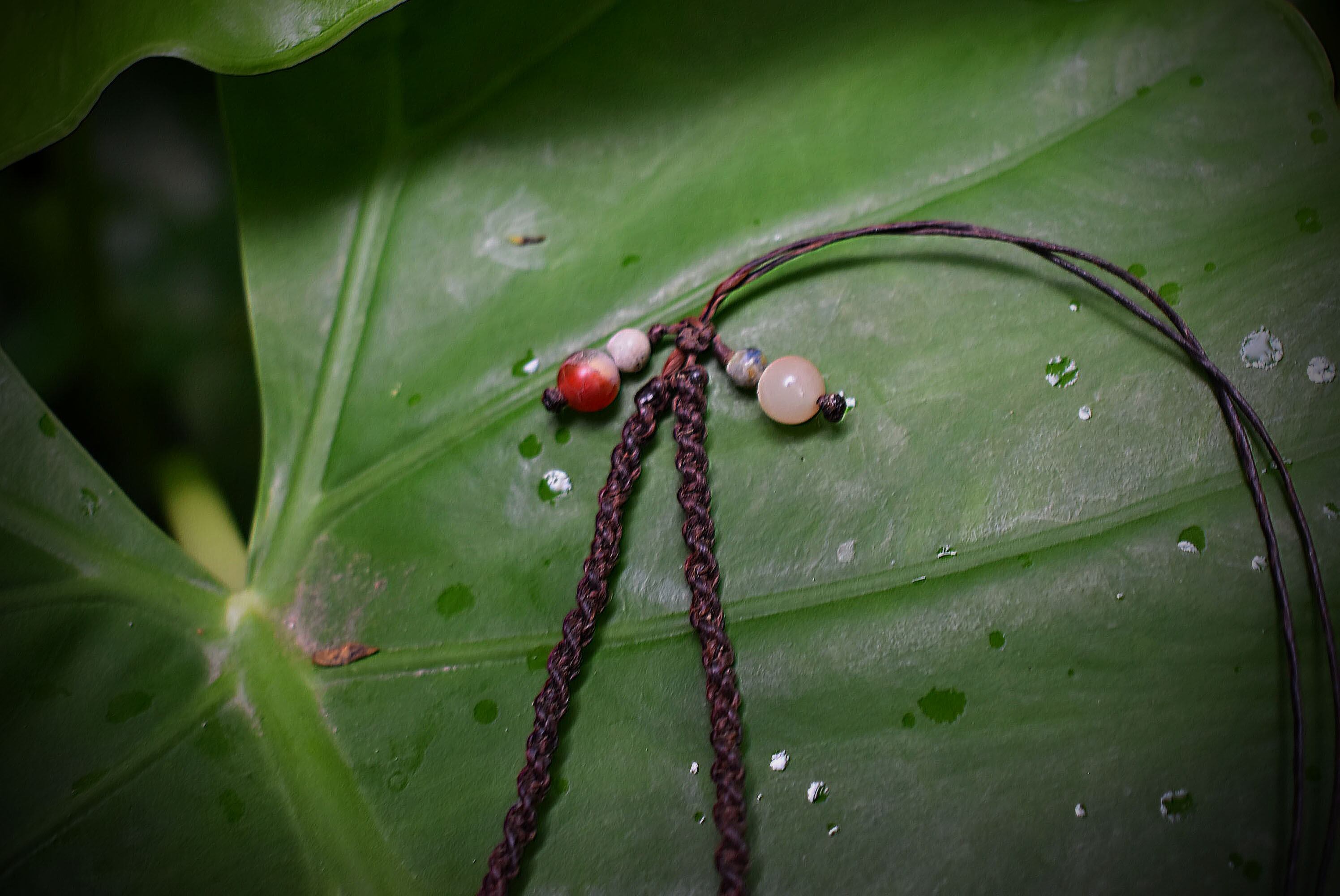 ◆このたびはダークブラウン色の蝋引き糸を使用しマクラメ編みを施しました。