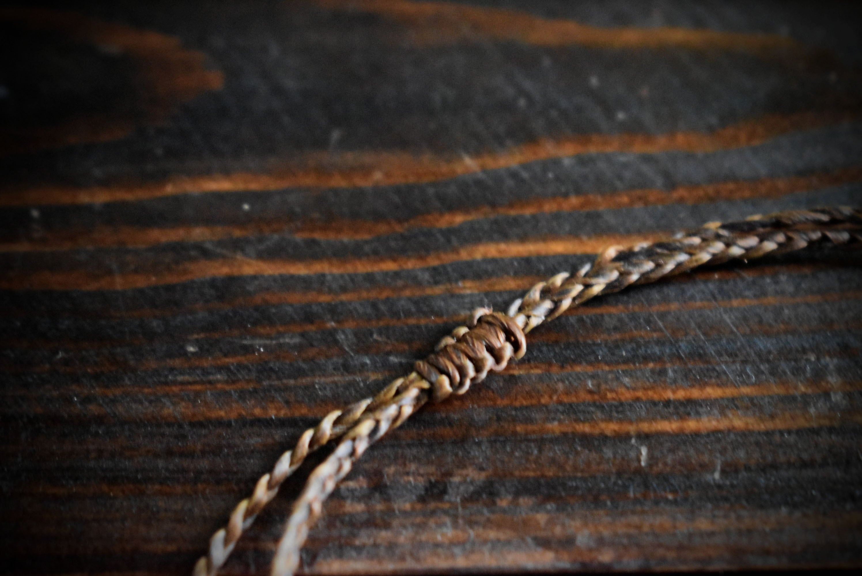 ◆このたびはダークブラウン色の蝋引き糸を使用しマクラメ編み装飾を施しました。