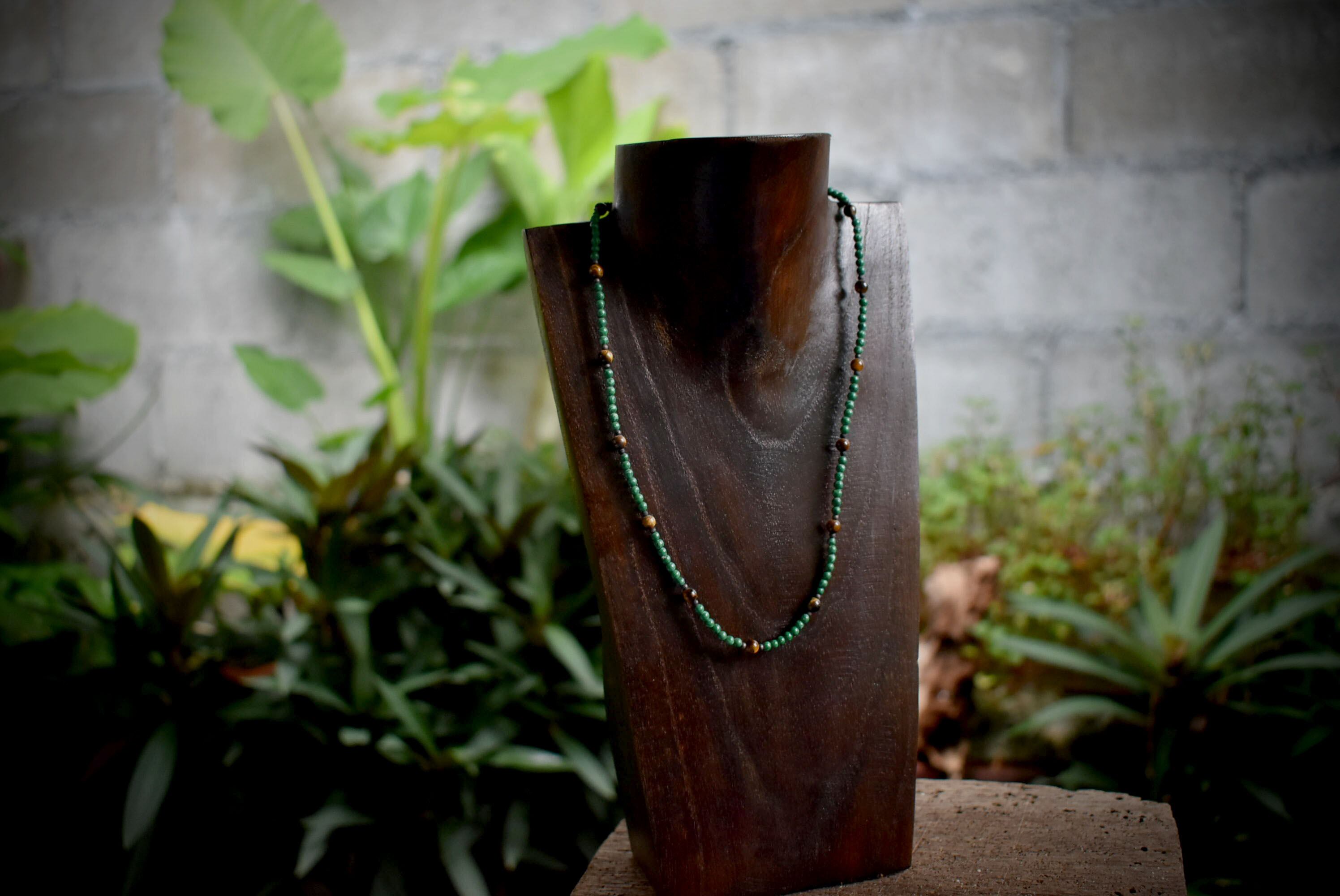 鮮やかな色味の小さな小粒マラカイトビーズを使用し、タイガーアイを合わせたシンプルネックレスを制作しました。重ね付けなどにもぴったりなシンプルネックレス。