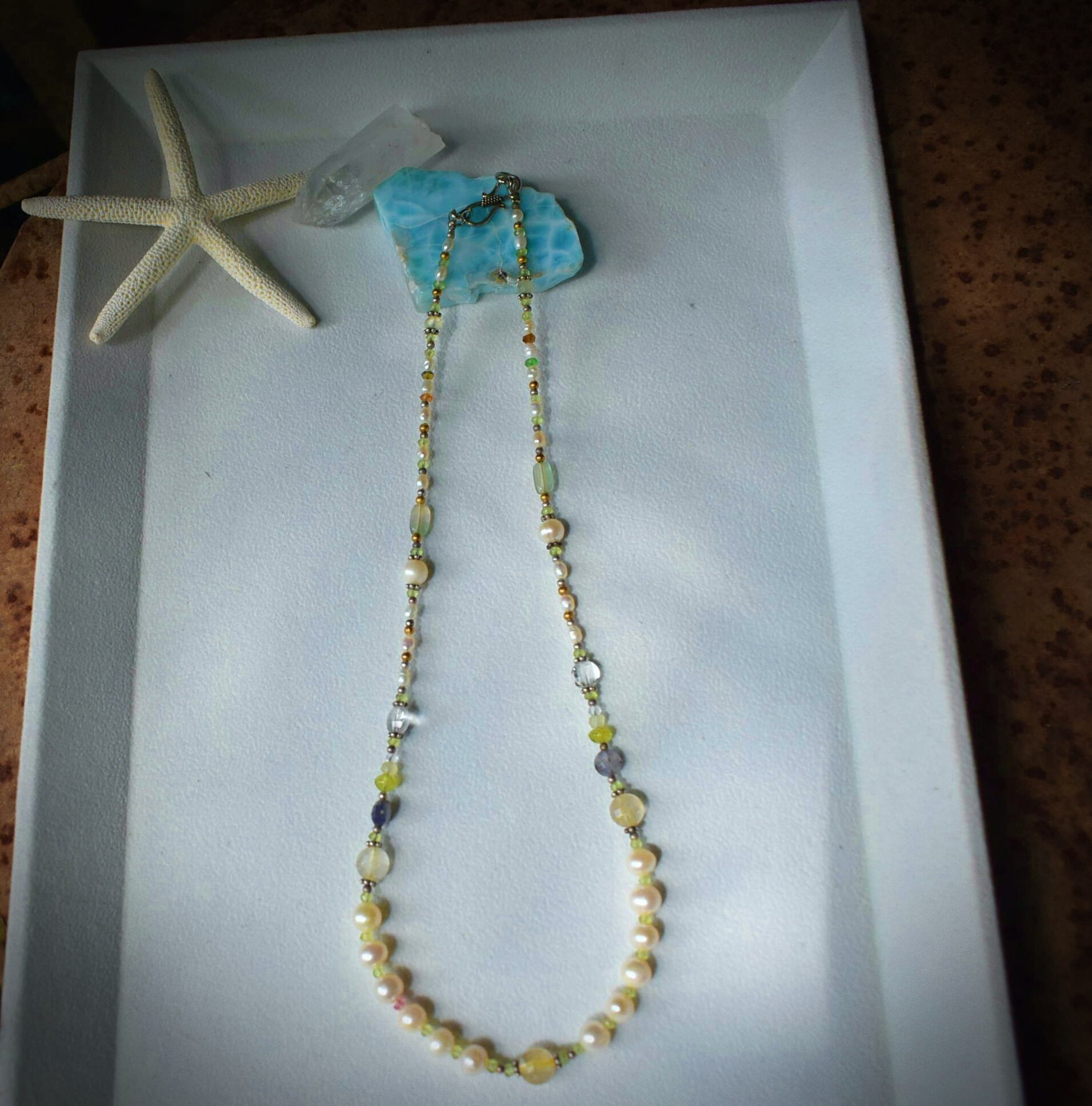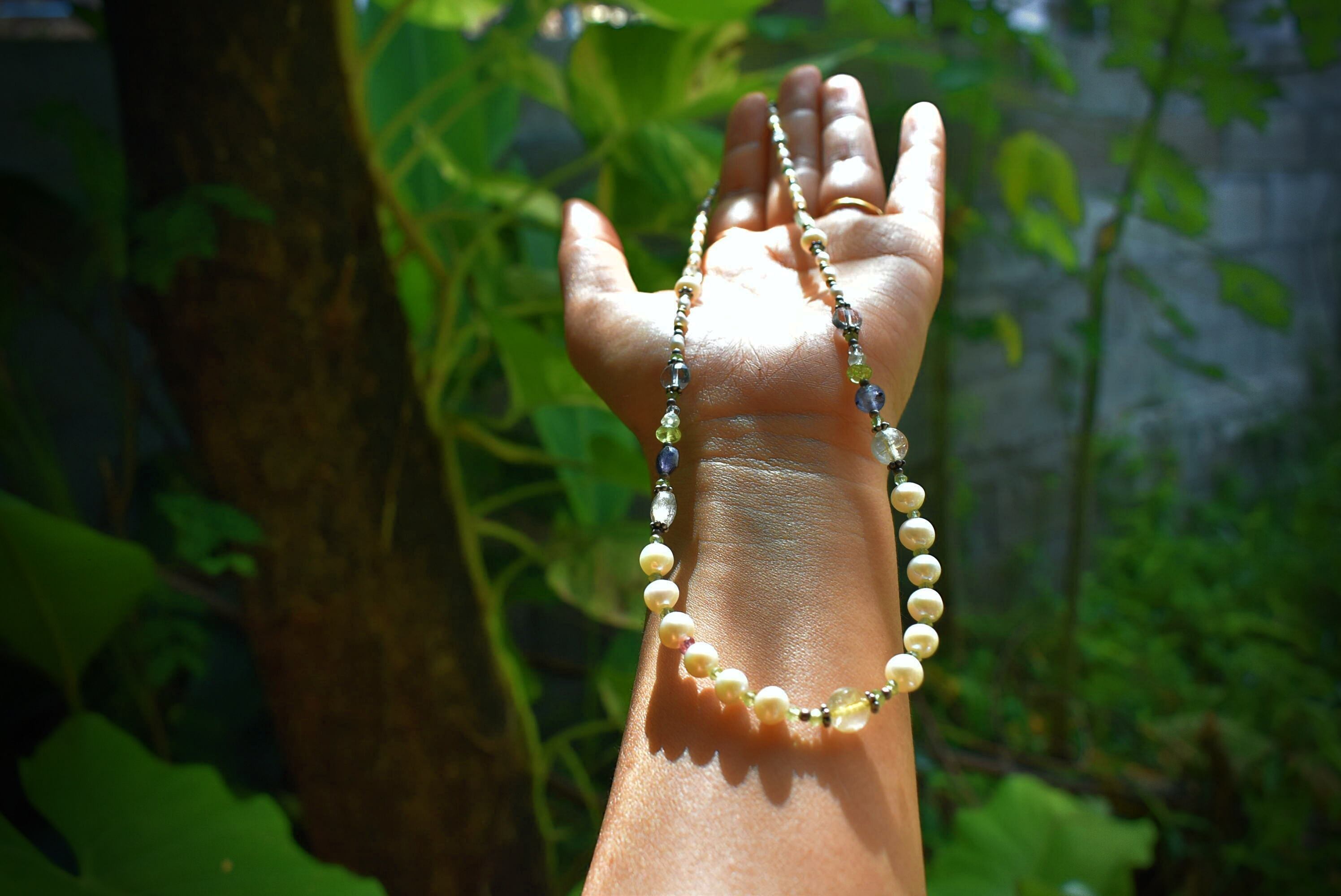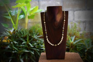 このたび、色艶の非常に良いフレッシュウォーターパールと宝石質の天然石ビーズを組み合わせ、シルバー92.5パーツそしてビーズを組み合わせてアンティークスタイルネックレスを制作しました。今回はペリドットとクリアクォーツビーズを基調とし、なめらかな色合いの真珠を使用した高貴なイメージのネックレス。美しく着飾りたい場で、またフォーマルな場所でのワンポイントに使用していただけるアーティスティックなネックレスを意識しました。