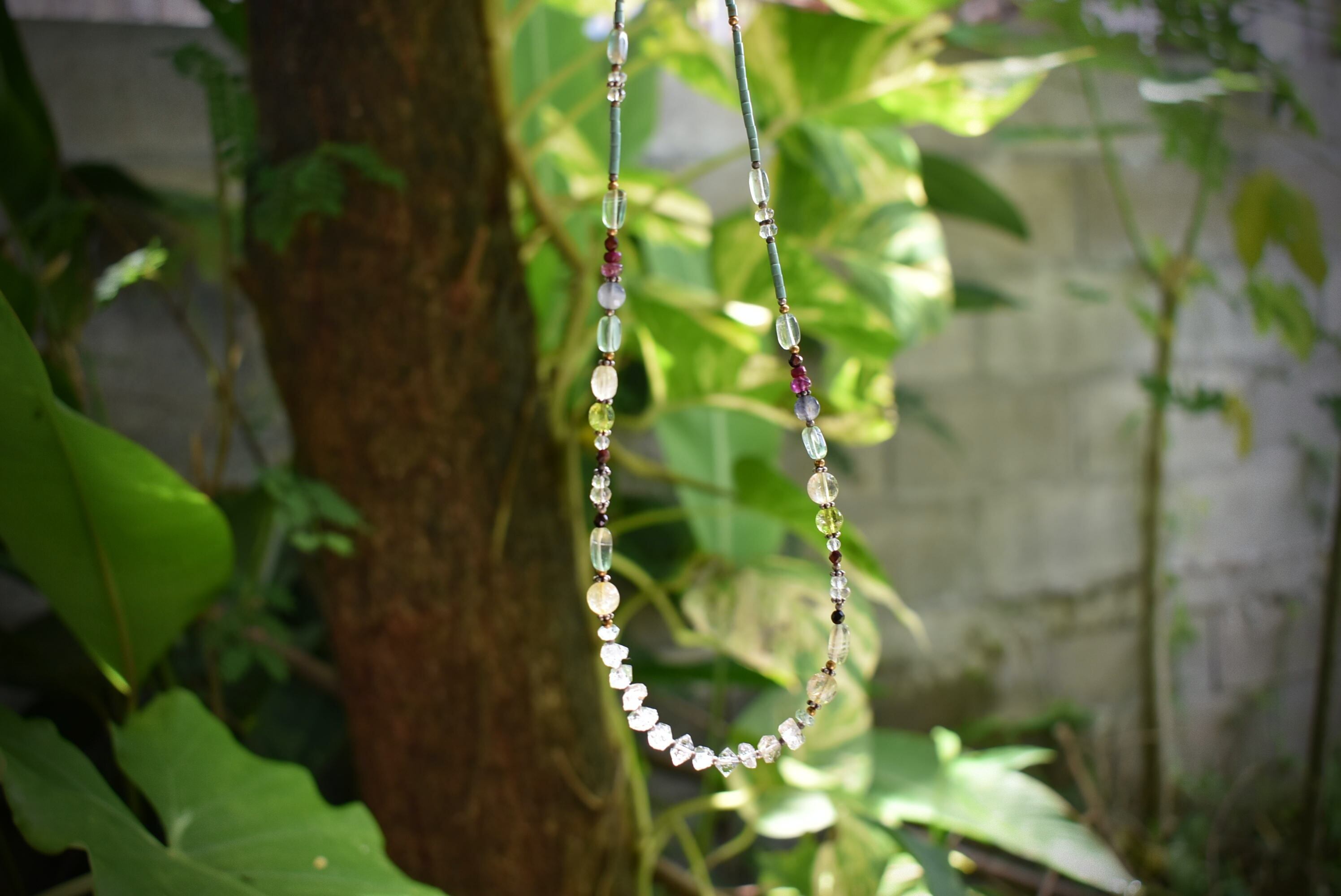 ひとつひとつの天然石ビーズの個性を生かし様々なジェムストーンを組み合わせて制作した贅沢なネックレスが仕上げています。