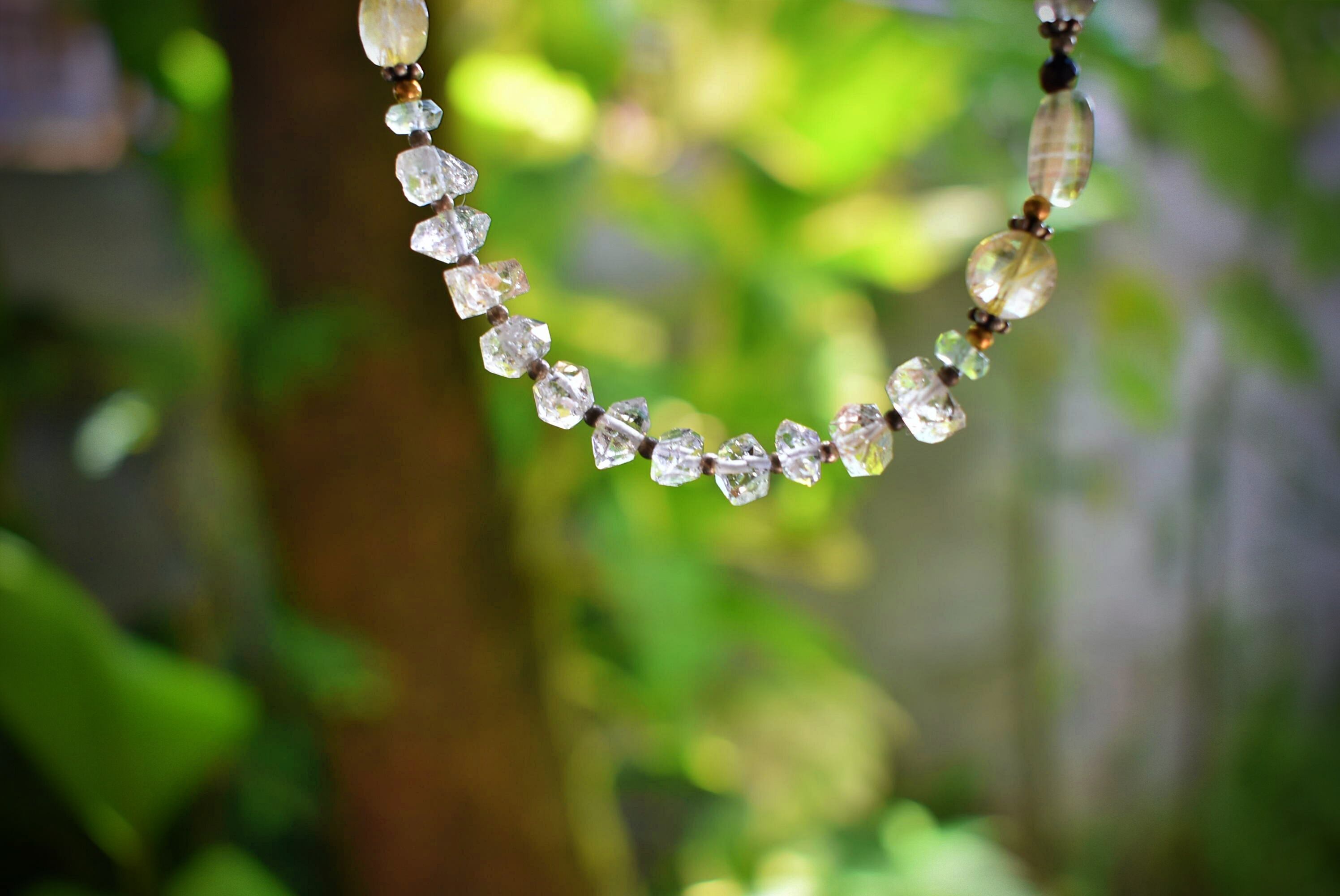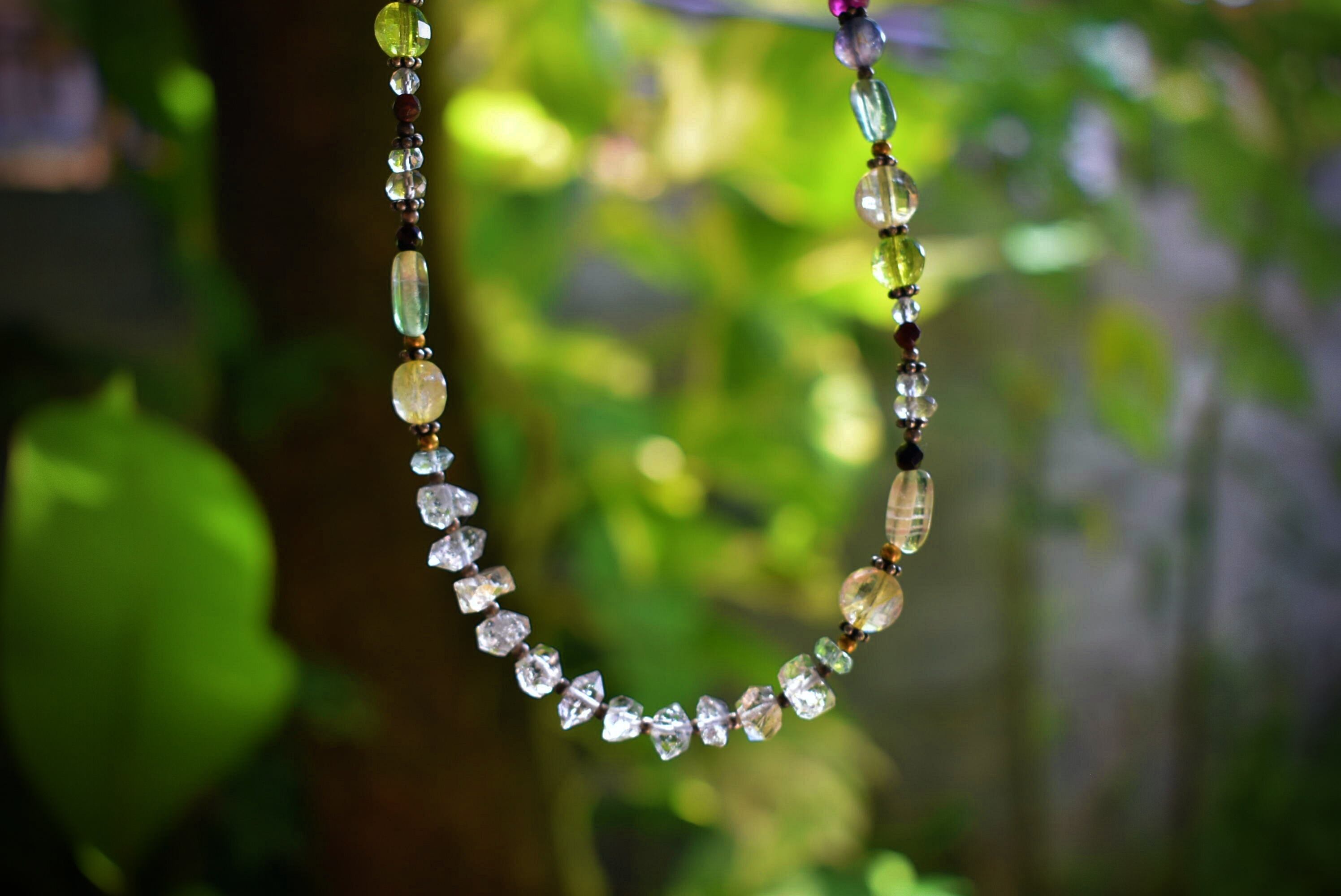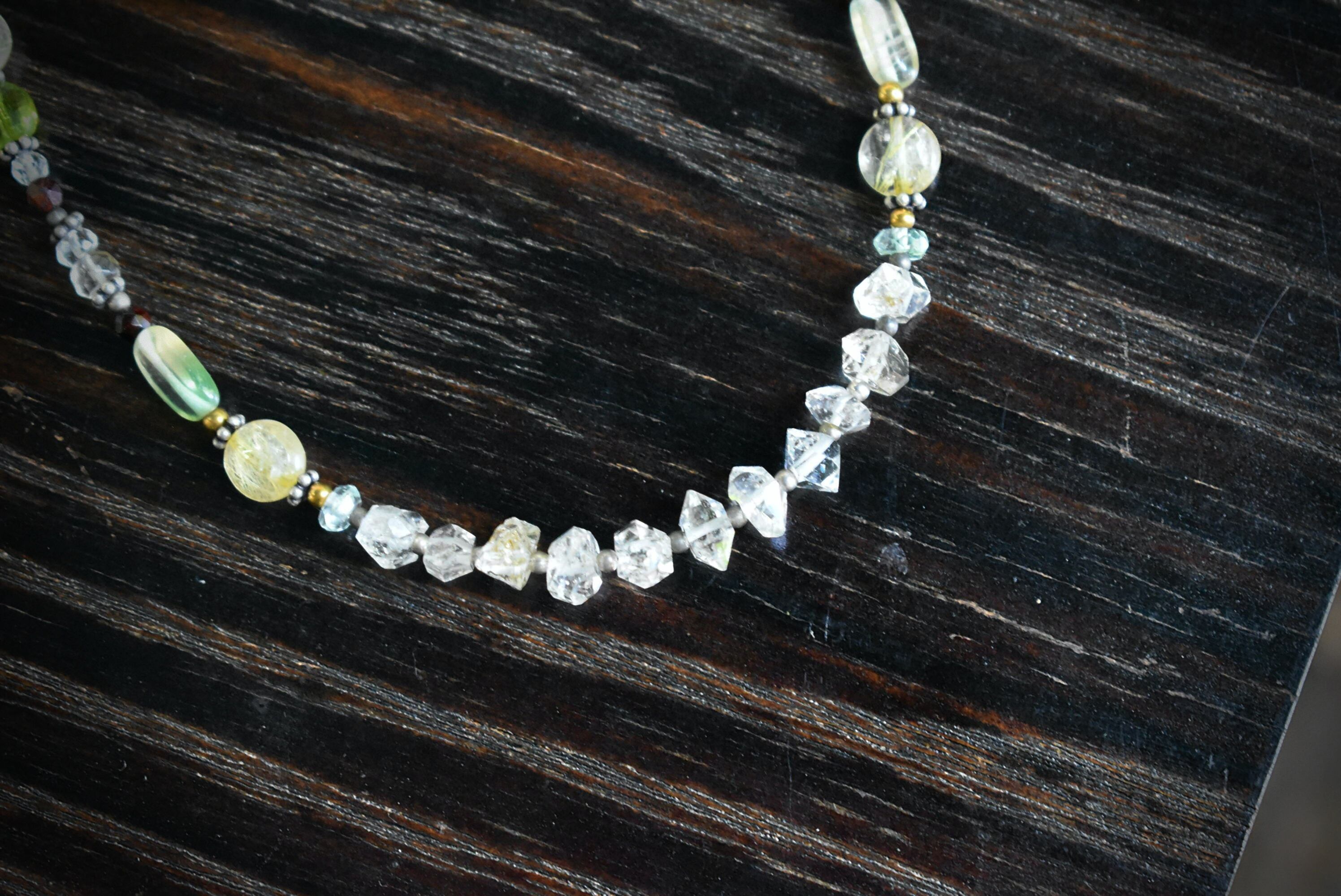 ひとつひとつが生きているかのように輝きがある原石型ハーキマー水晶(オイルインクォーツ)と宝石質の天然石ビーズを組み合わせ、シルバー92.5パーツそしてビーズを組み合わせてアンティークスタイルネックレスを制作しました。