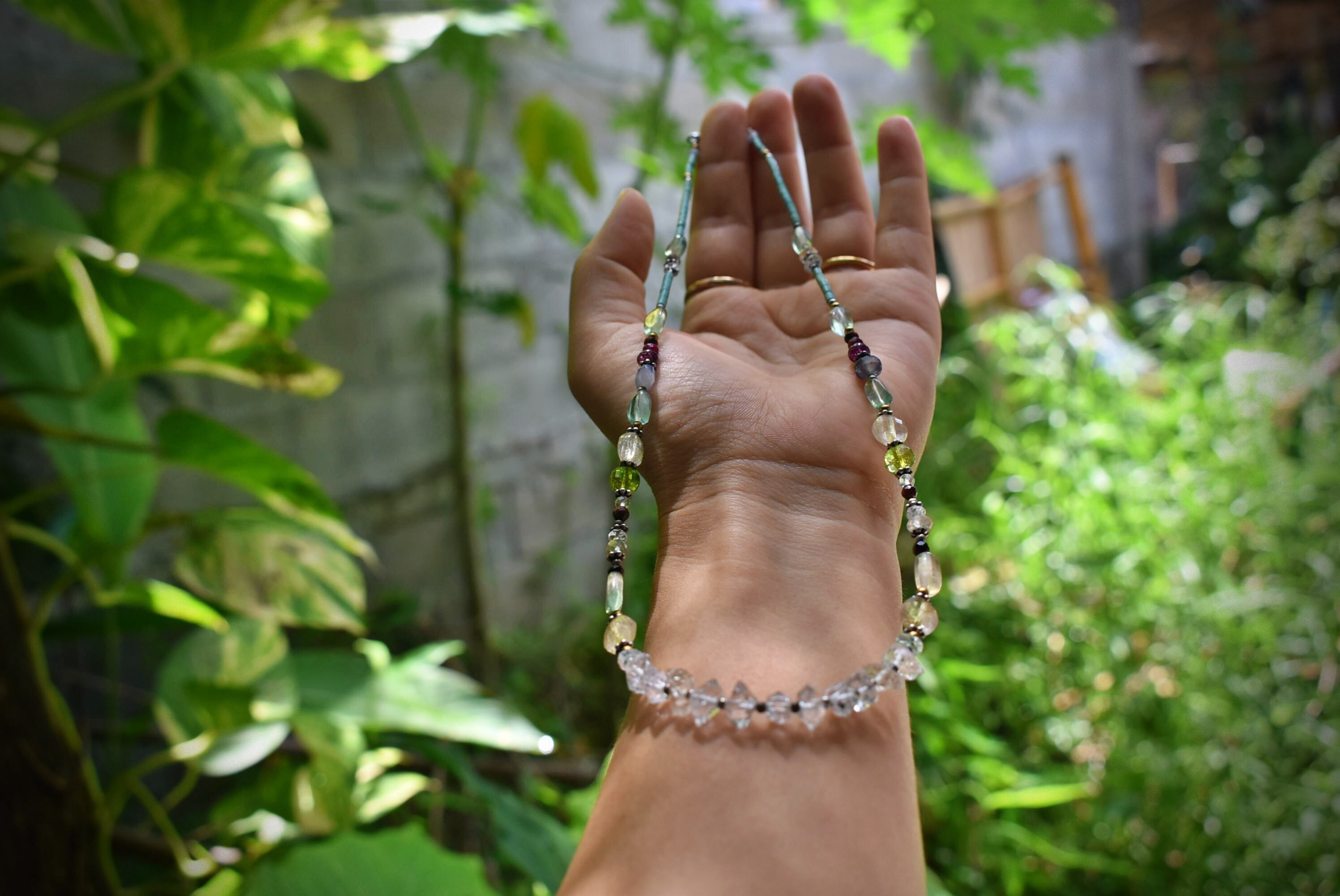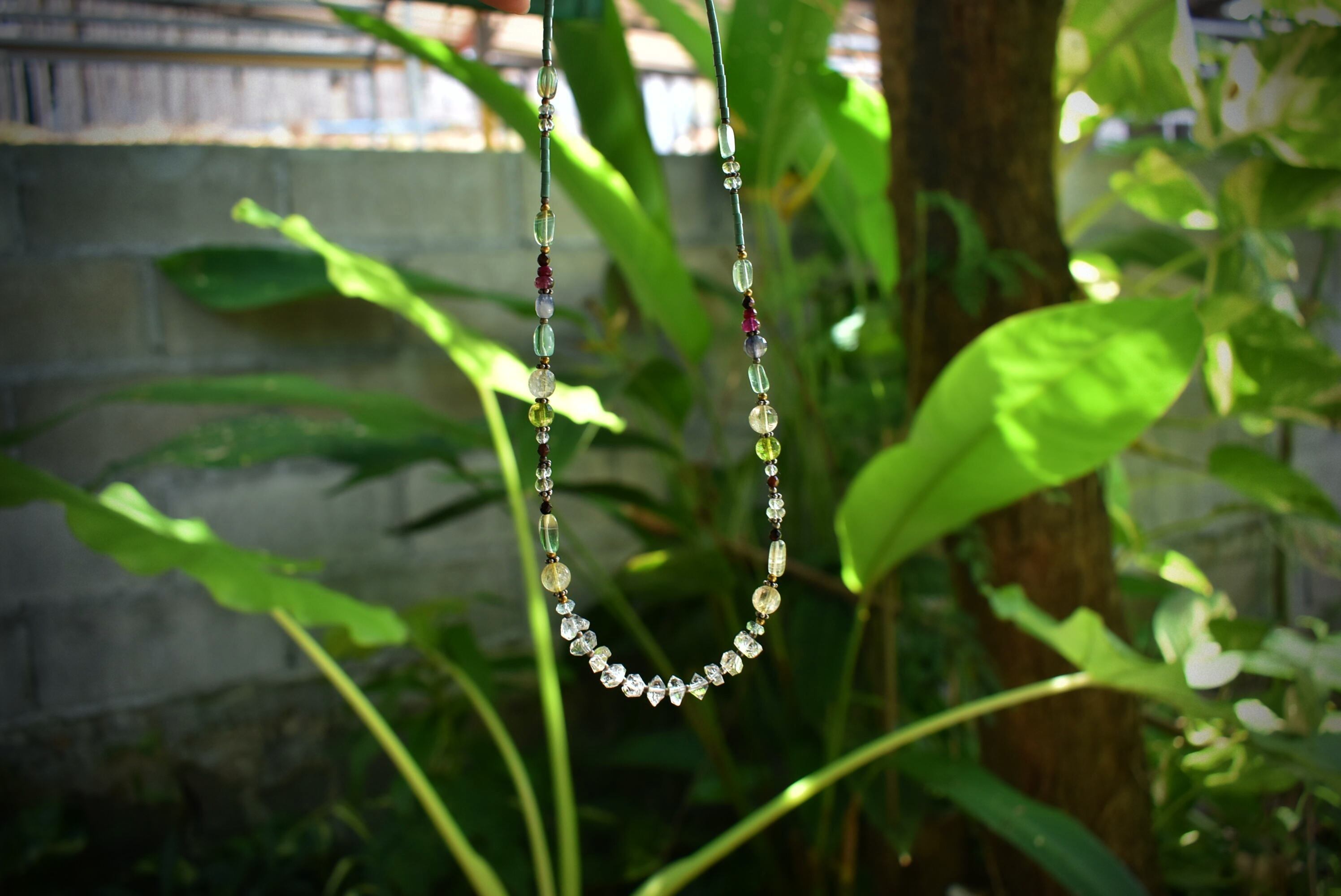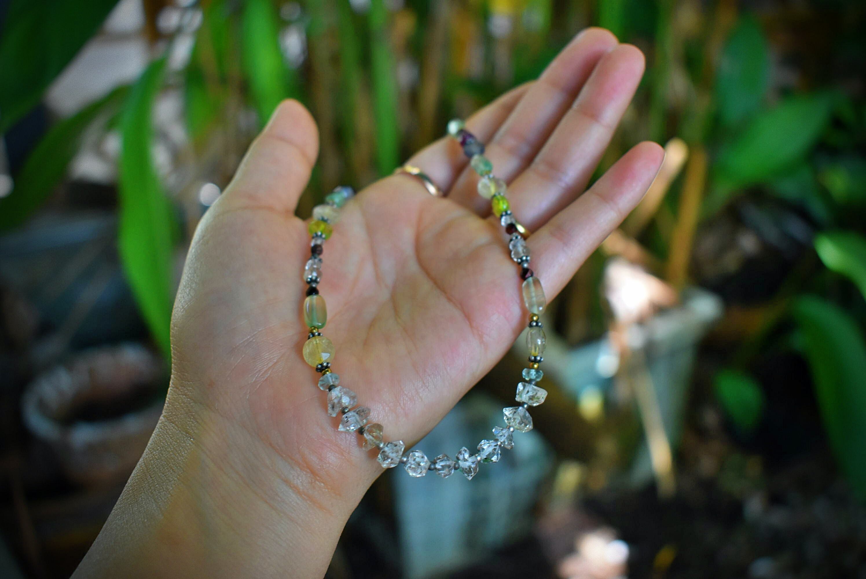 ひとつひとつが生きているかのように輝きがある原石型ハーキマー水晶(オイルインクォーツ)と宝石質の天然石ビーズを組み合わせ、シルバー92.5パーツそしてビーズを組み合わせてアンティークスタイルネックレスを制作しました。