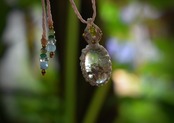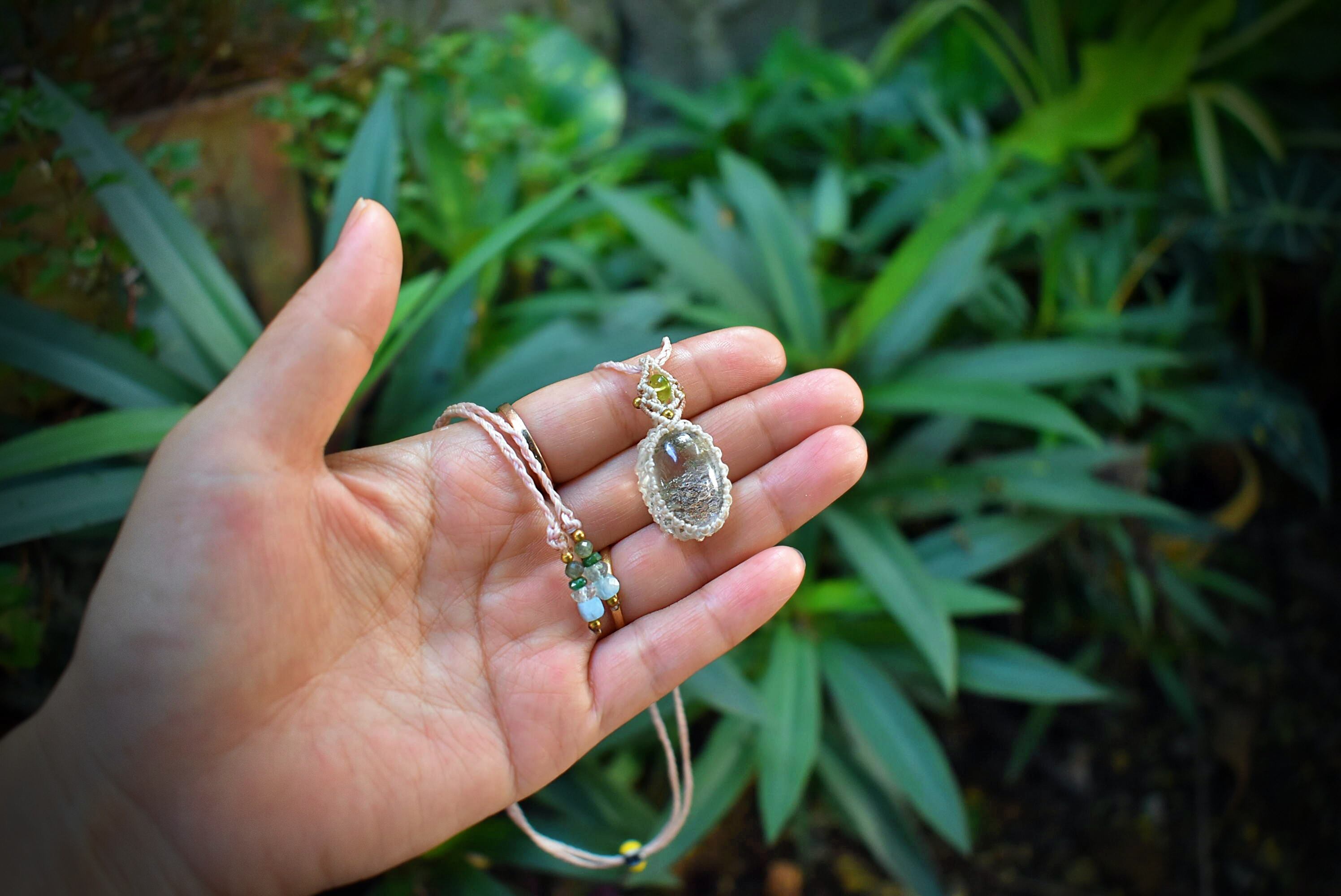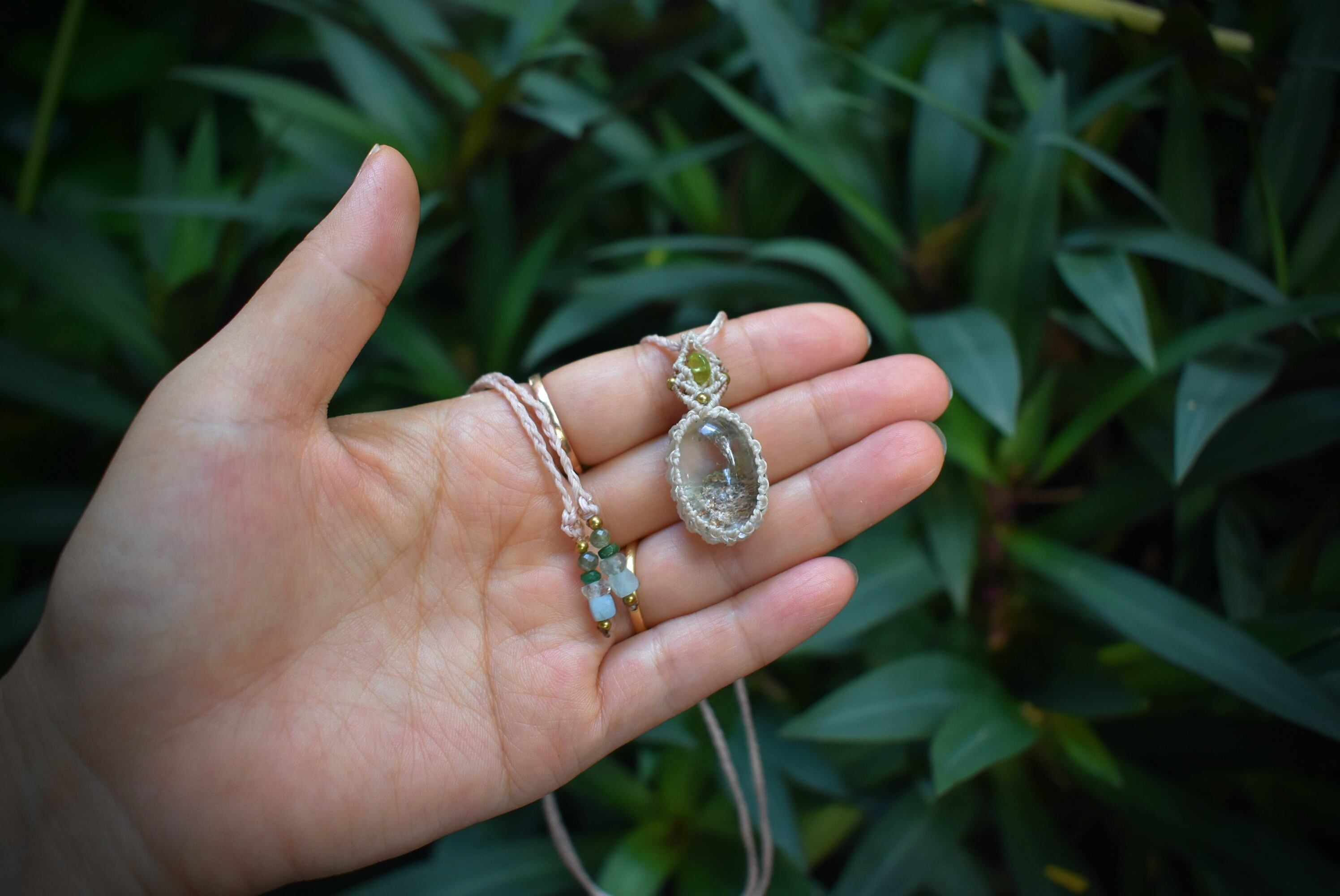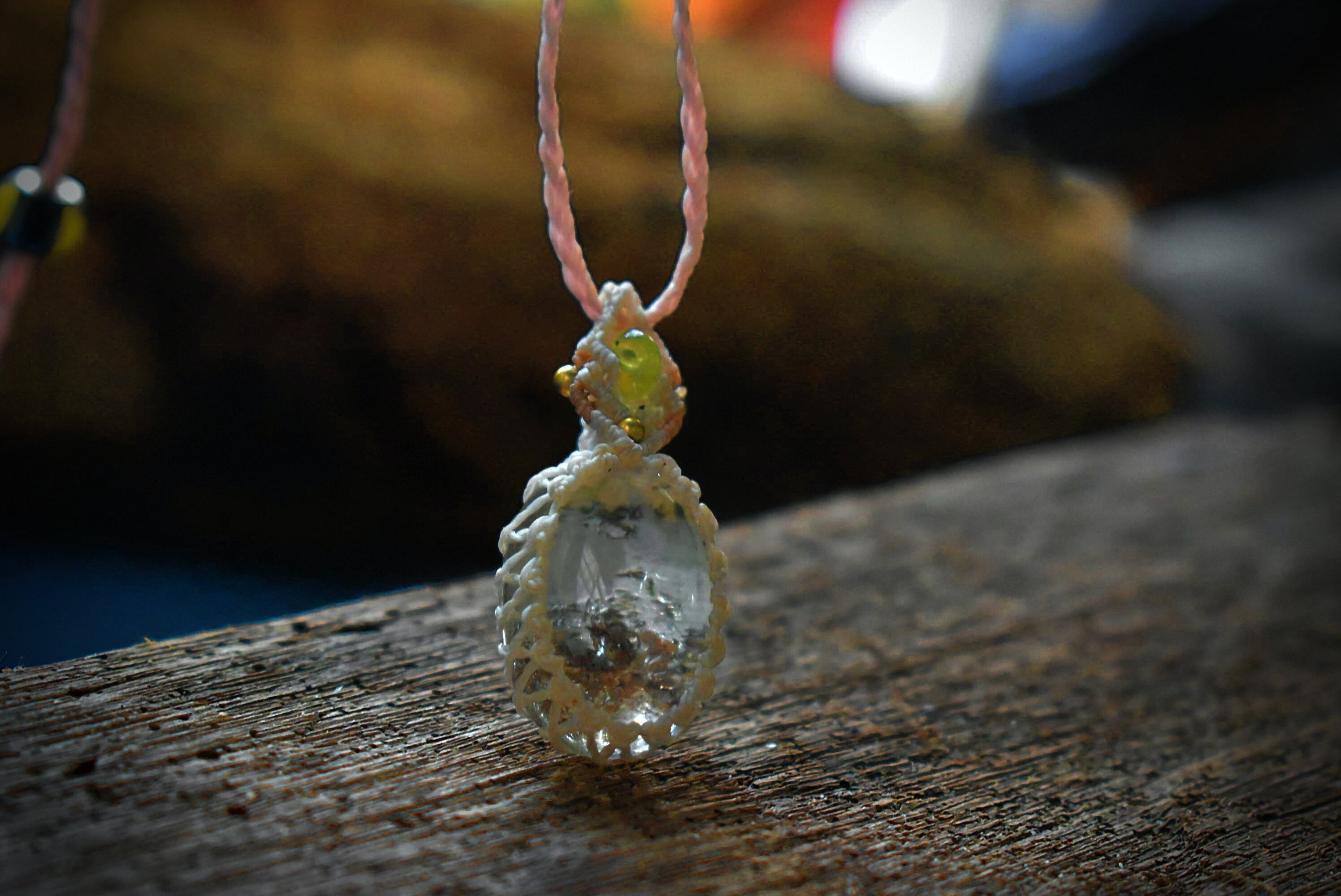 トップにはおなじみのペリドットビーズを使用してマクラメ編み装飾をちょっぴりとあしらいました。小さくても良質な水晶をお楽しみください。