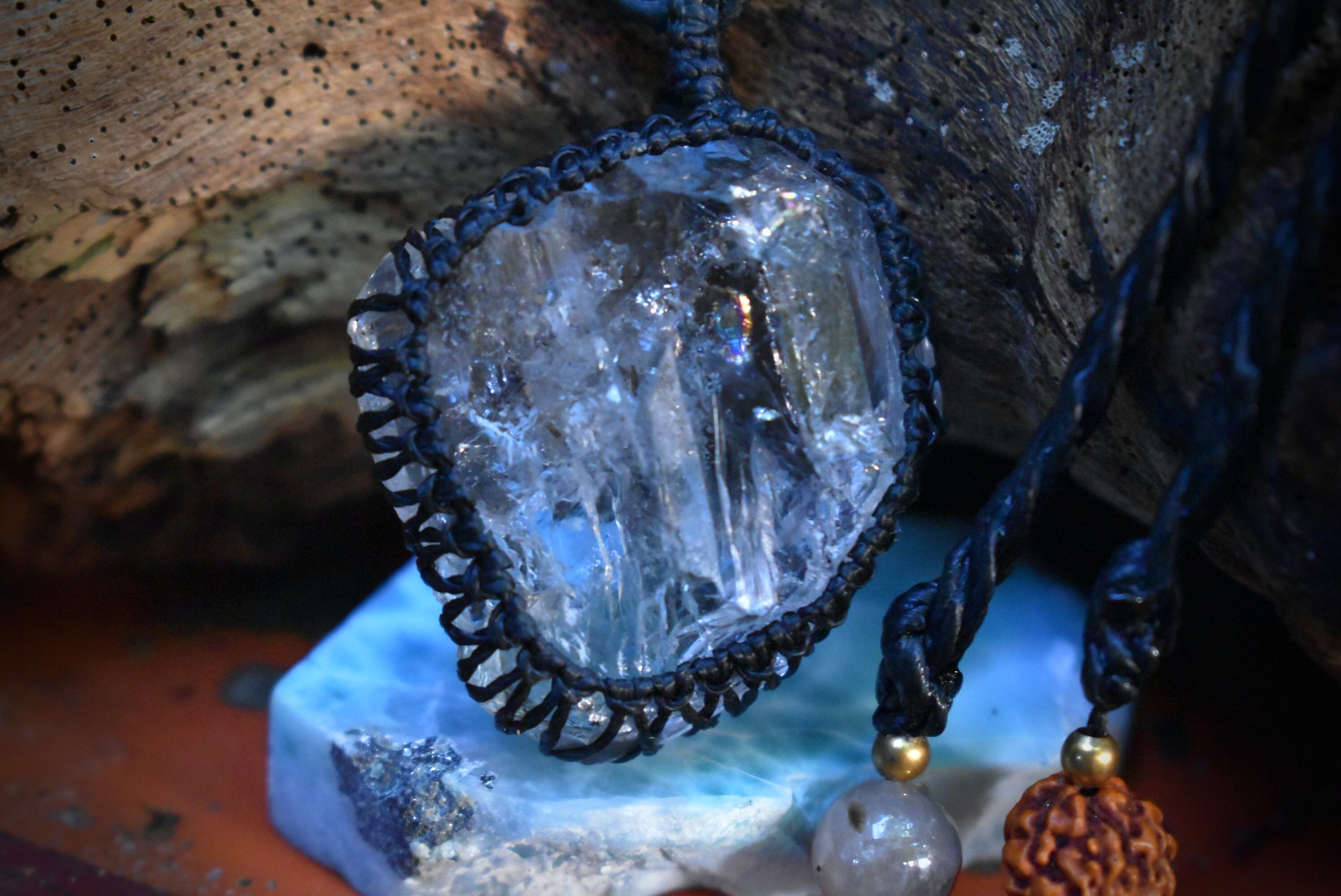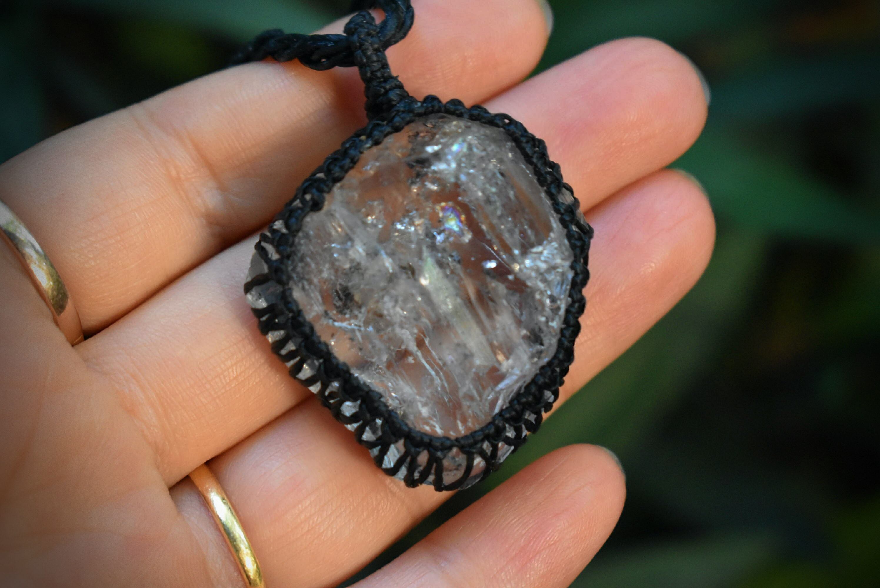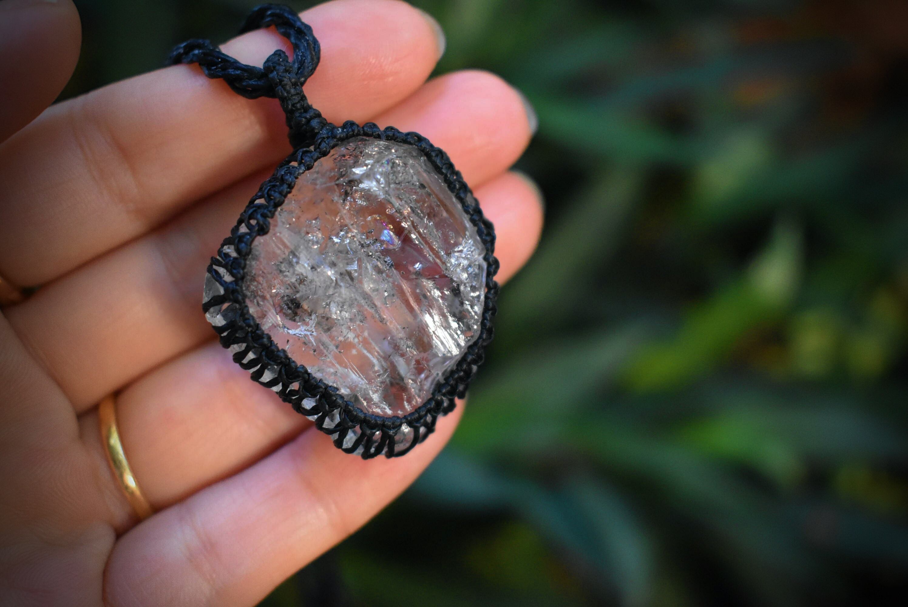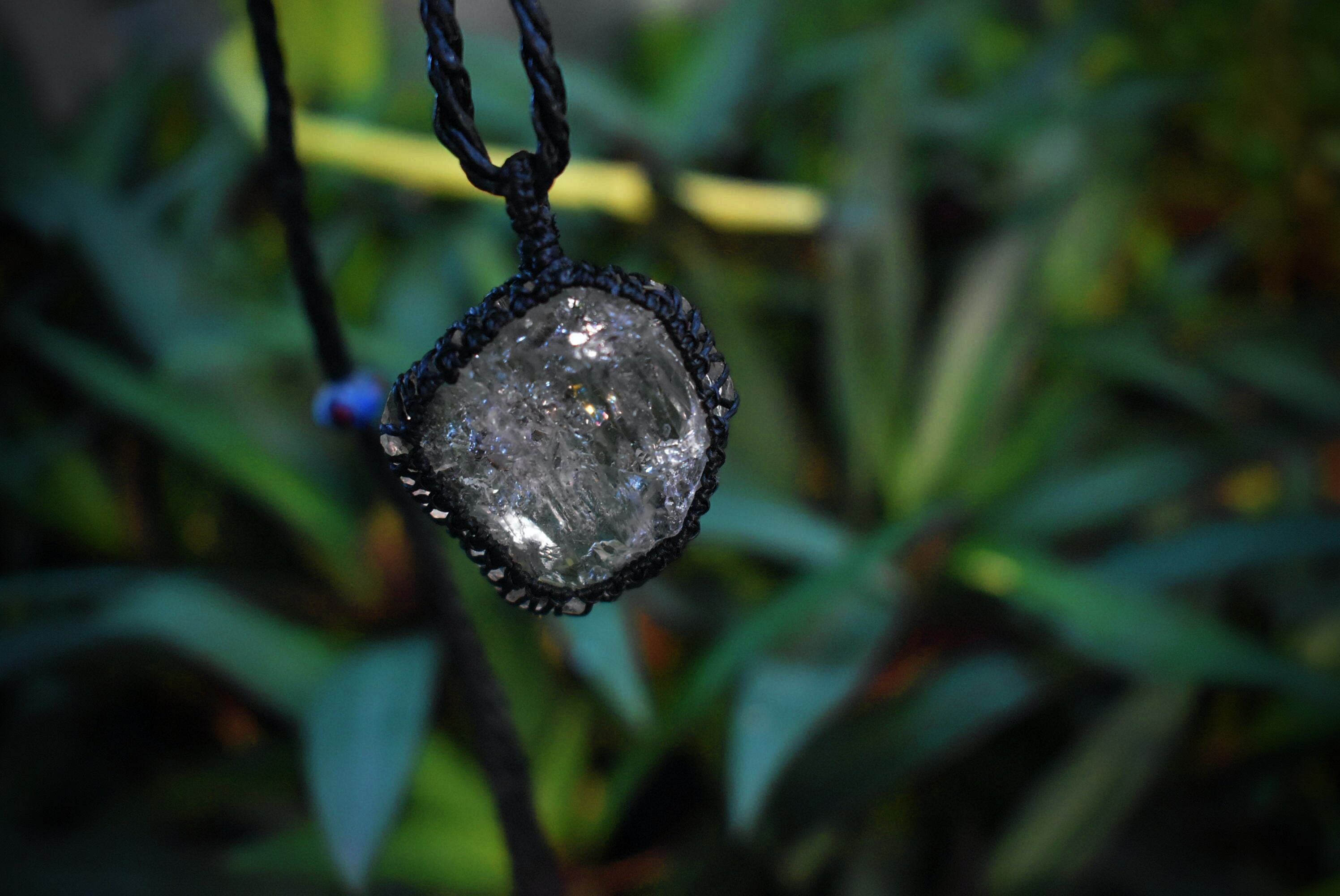 トップの部分にガッツリと虹を見てとることのできるハーキマーダイヤモンドをしっかりと蝋引き編みを使用してマクラメ編み装飾を施してペンダントに仕上げました。