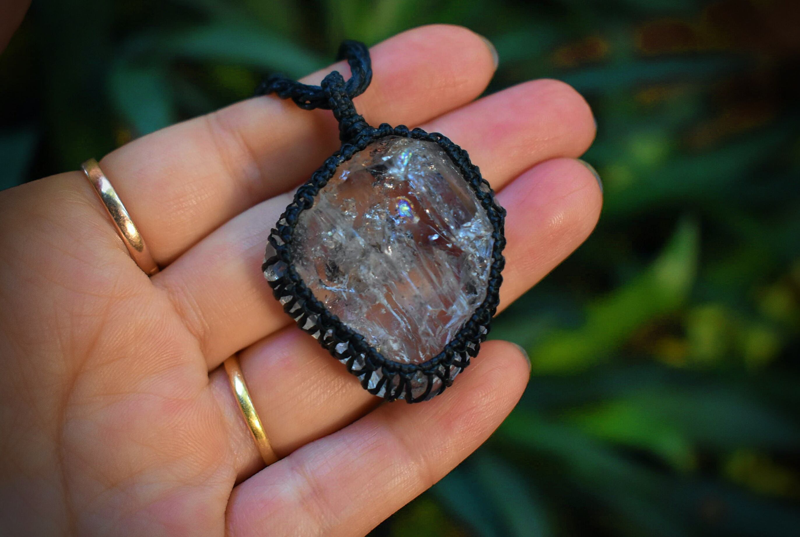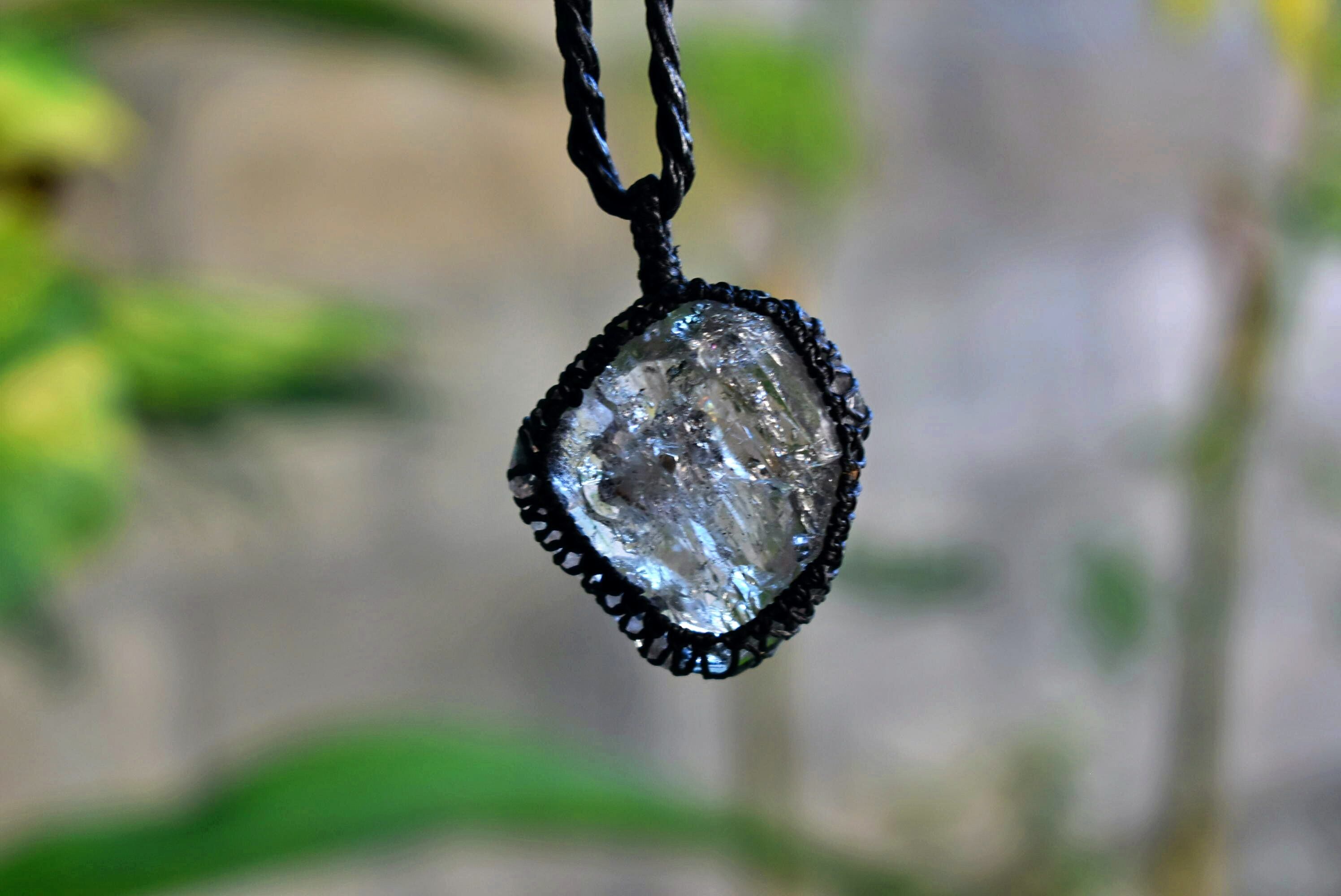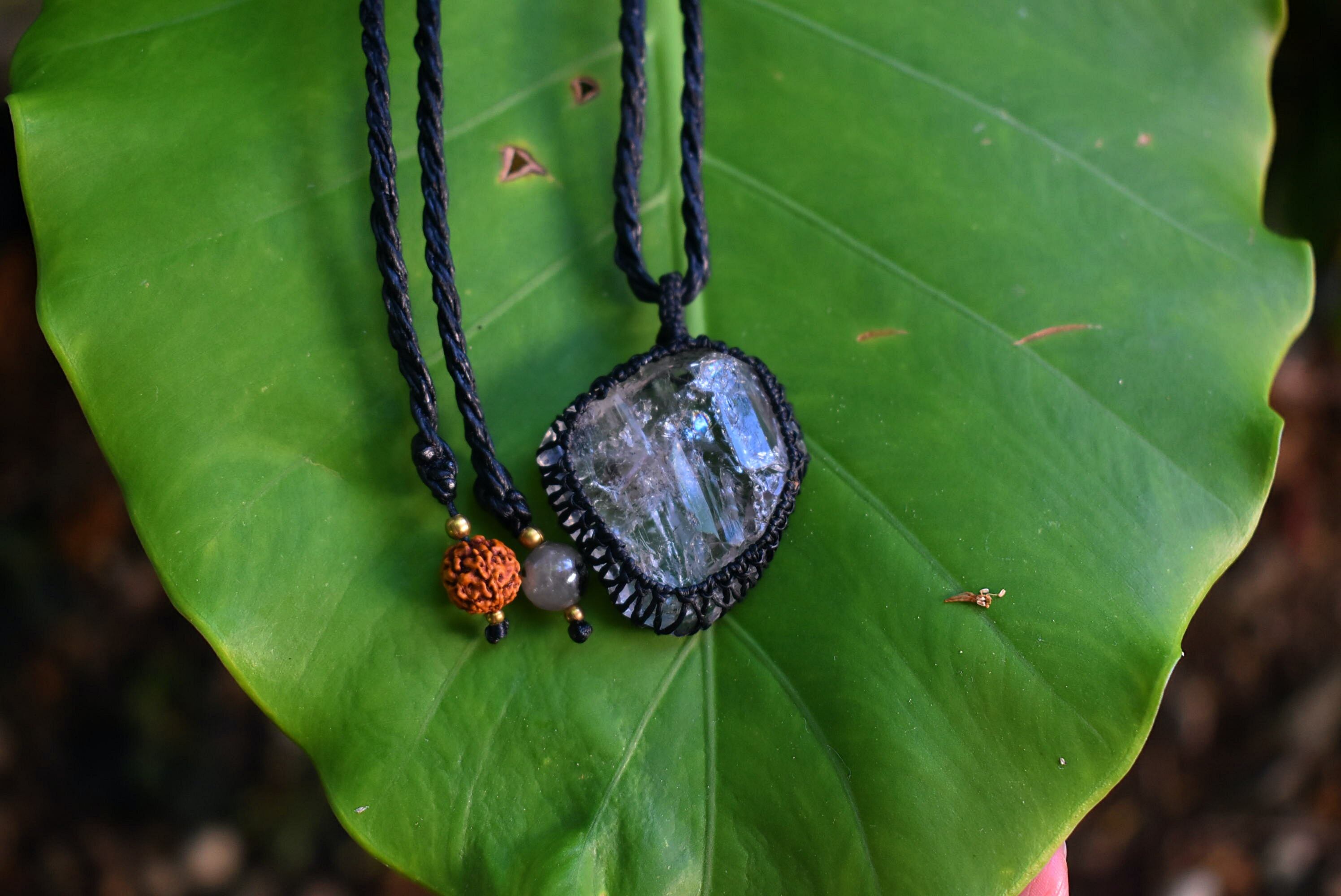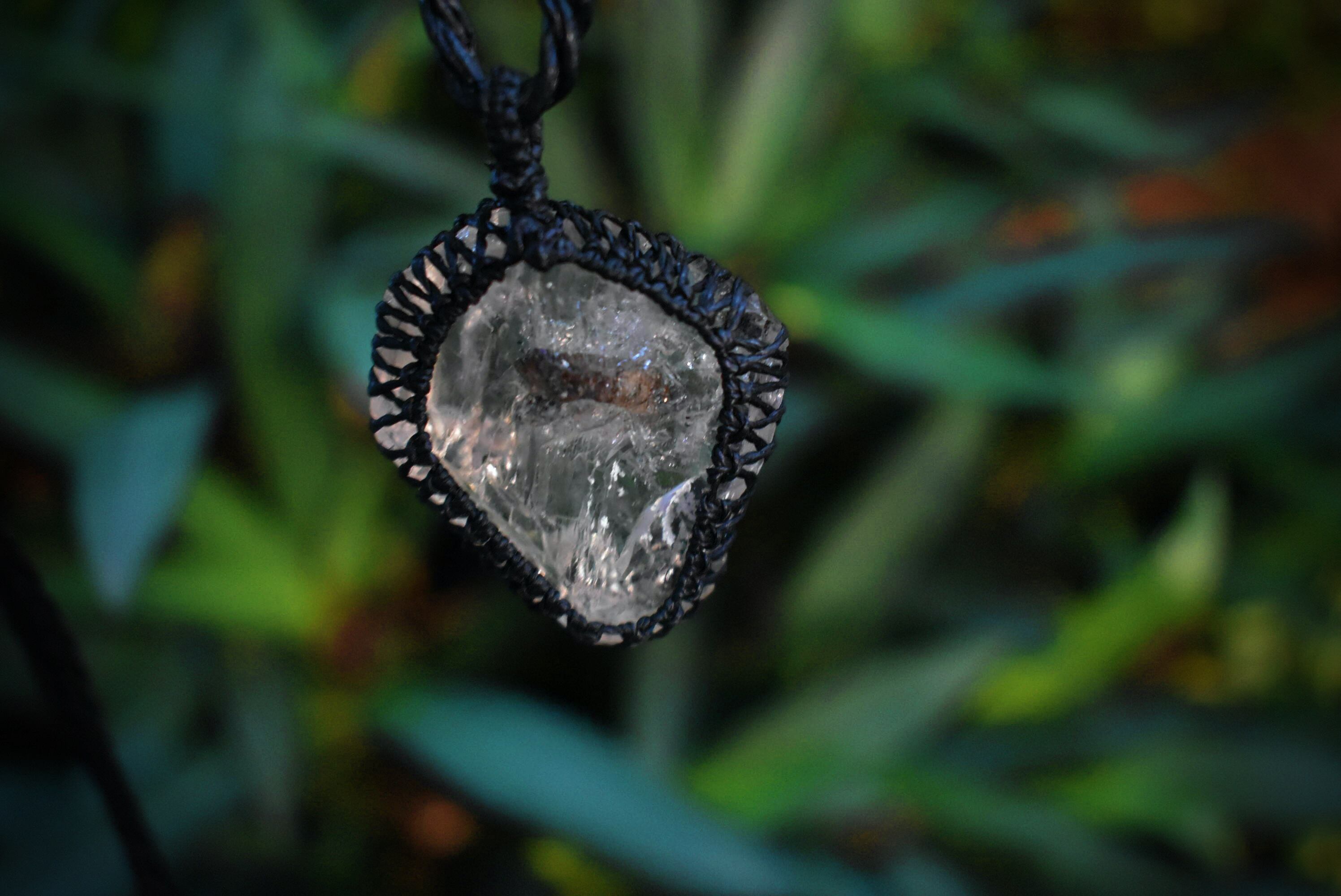 トップの部分にガッツリと虹を見てとることのできるハーキマーダイヤモンドをしっかりと蝋引き編みを使用してマクラメ編み装飾を施してペンダントに仕上げました。