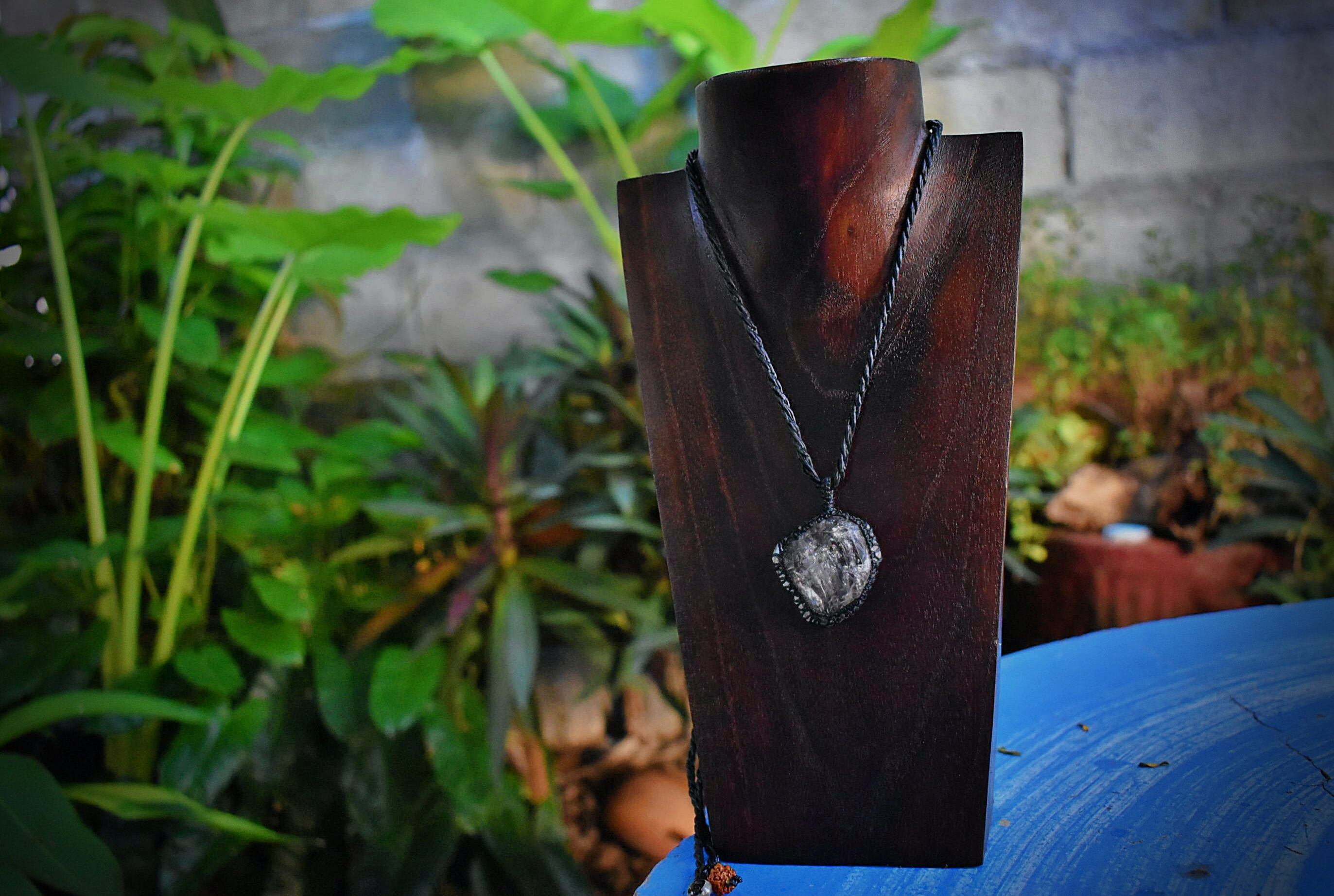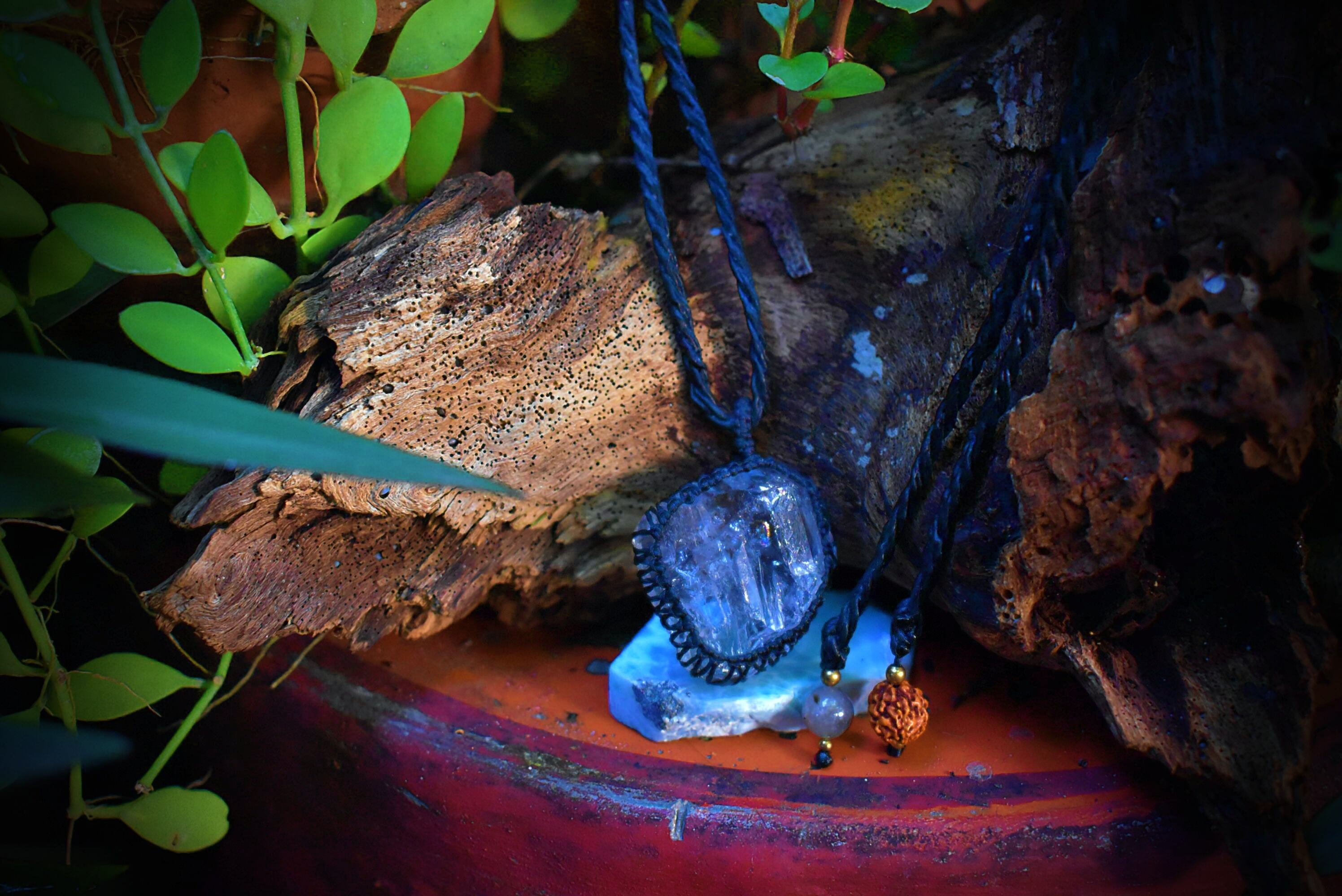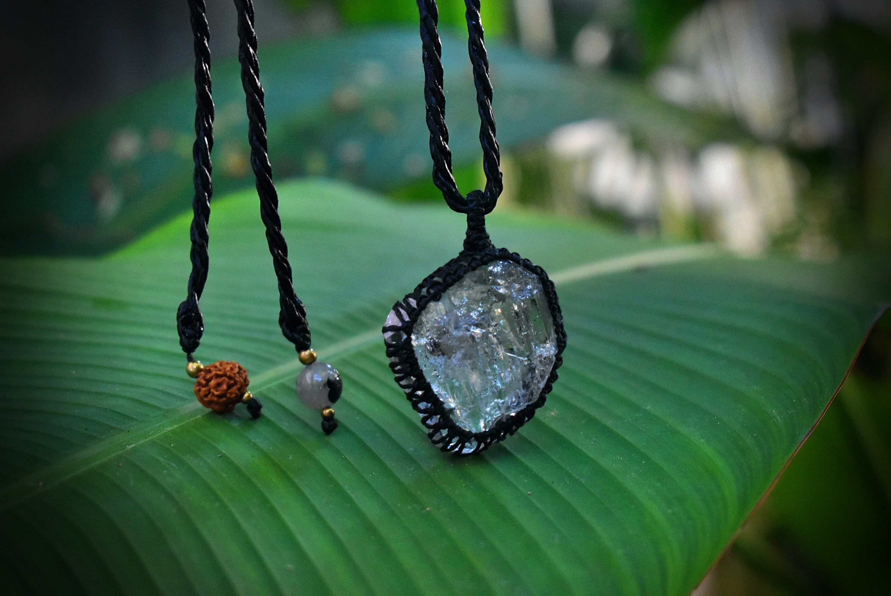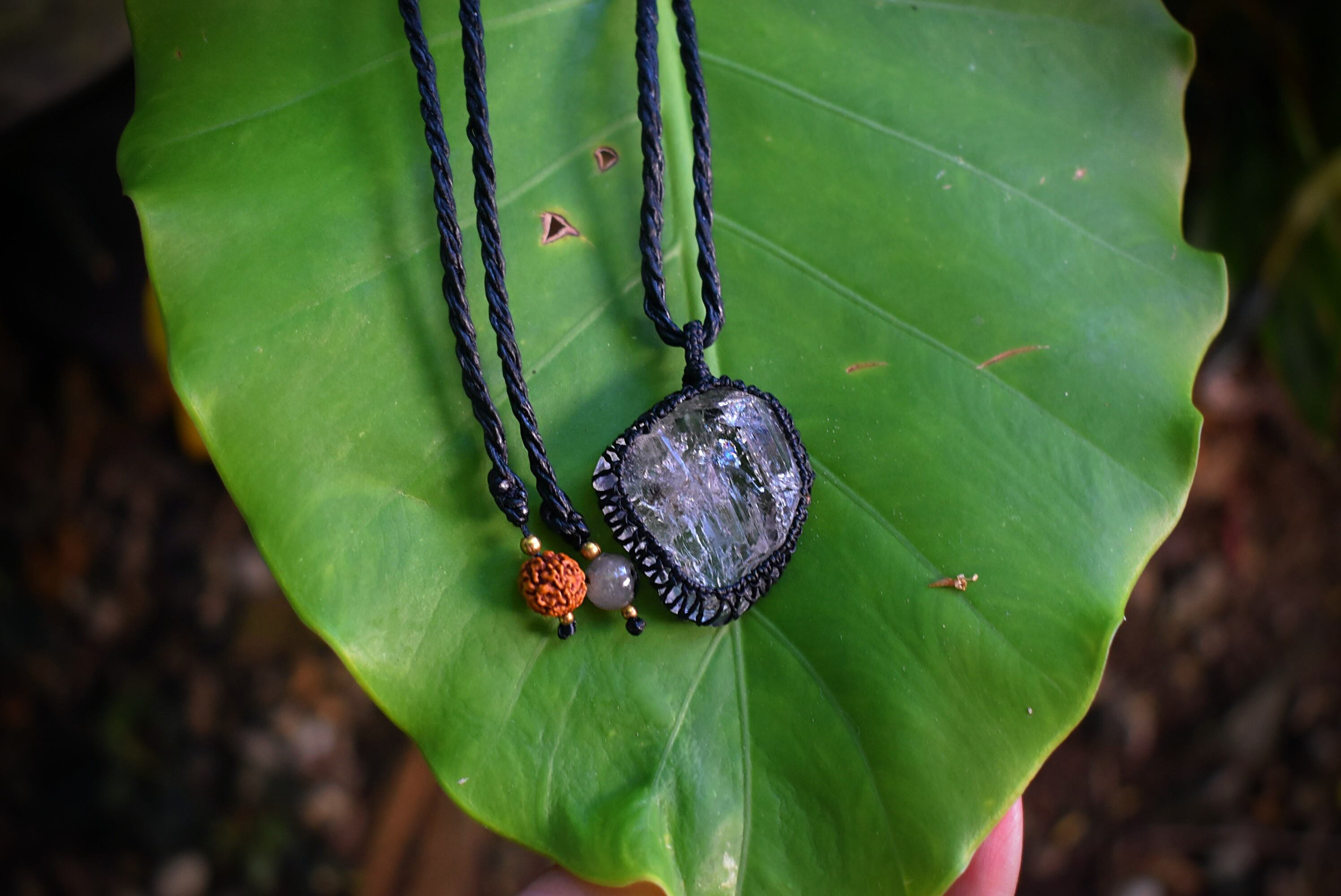 トップの部分にガッツリと虹を見てとることのできるハーキマーダイヤモンドをしっかりと蝋引き編みを使用してマクラメ編み装飾を施してペンダントに仕上げました。