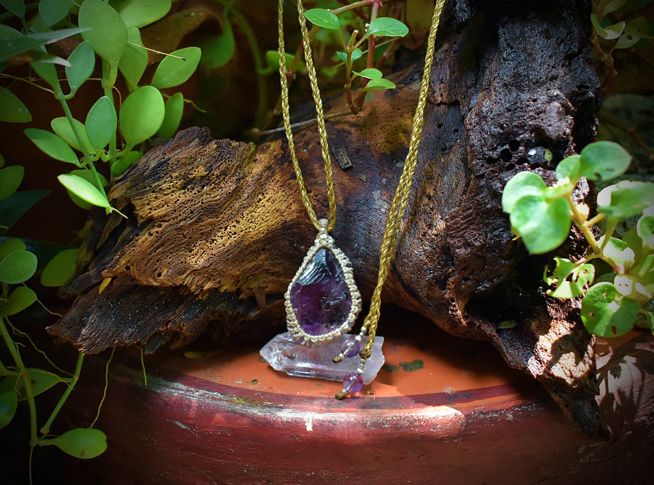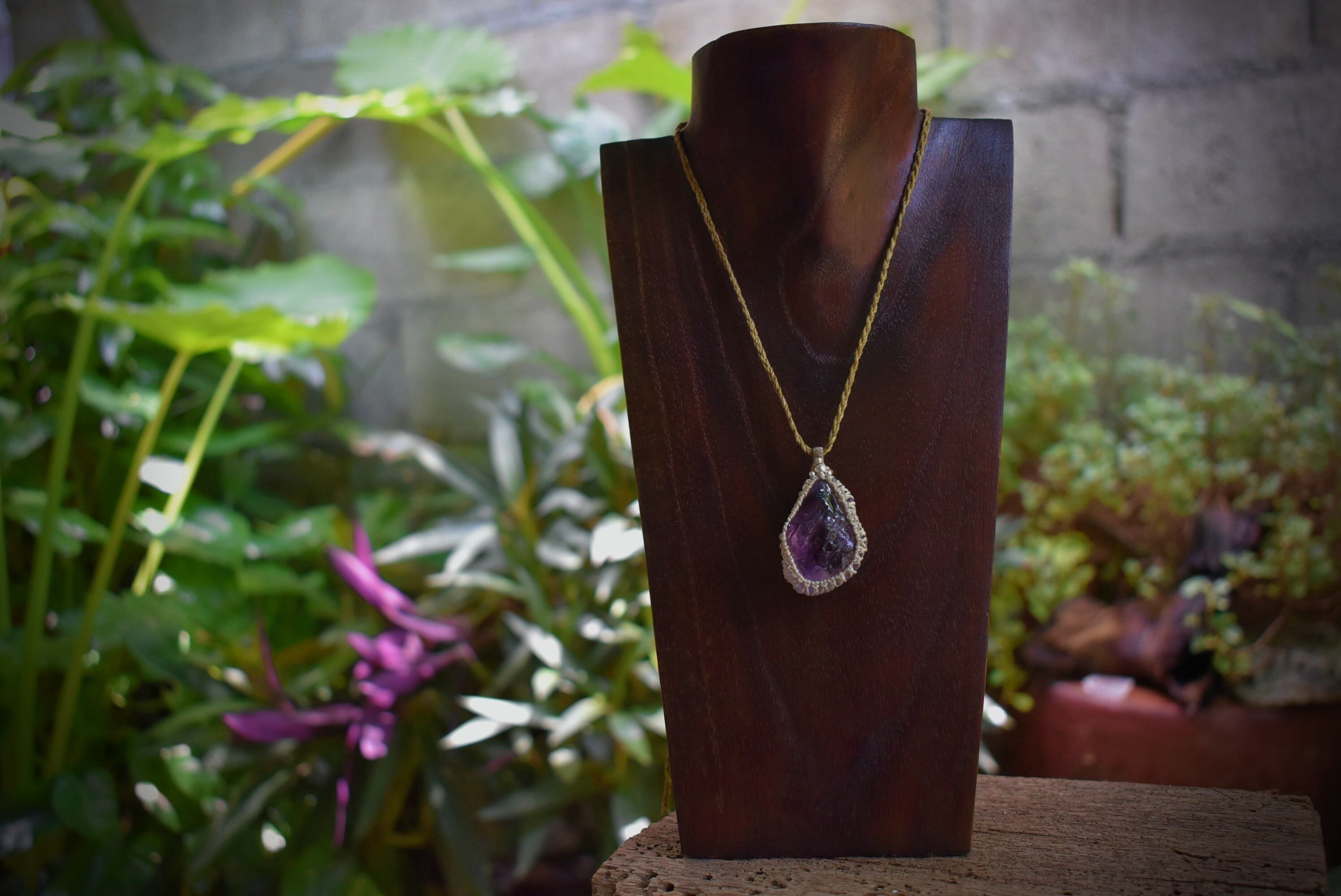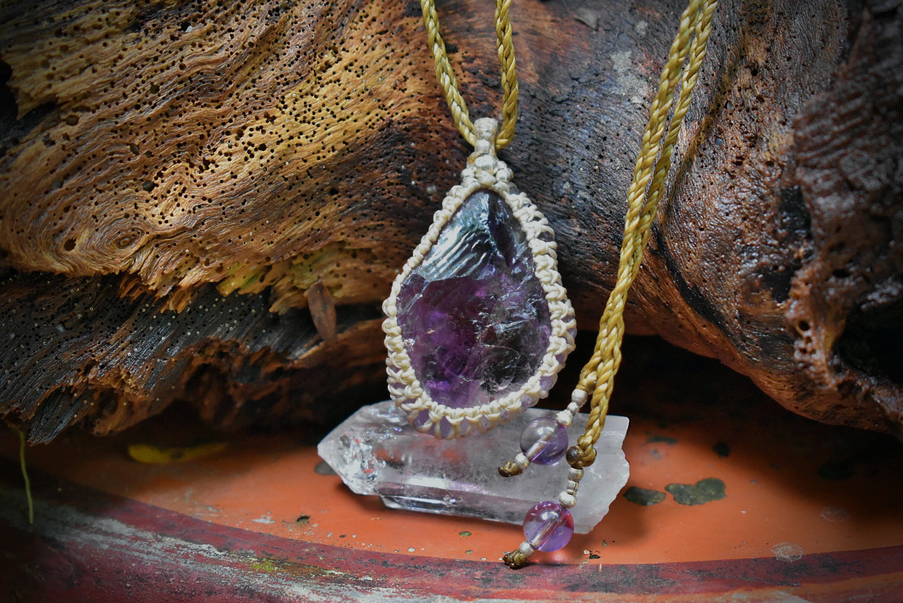 このたびのアメジスト、色味の少ない透明感ある部分とアメジストらしいパープルカラーがミックスされた、曇りのない透明感ある原石を使用してマクラメ編み装飾を施し、ペンダントに仕上げました。ペンダントのトップには大小と刻印が施されたカレンシルバー92.5ビーズをあしらいました。シンプルですがシャープなデザインでペンダントが誕生しました。