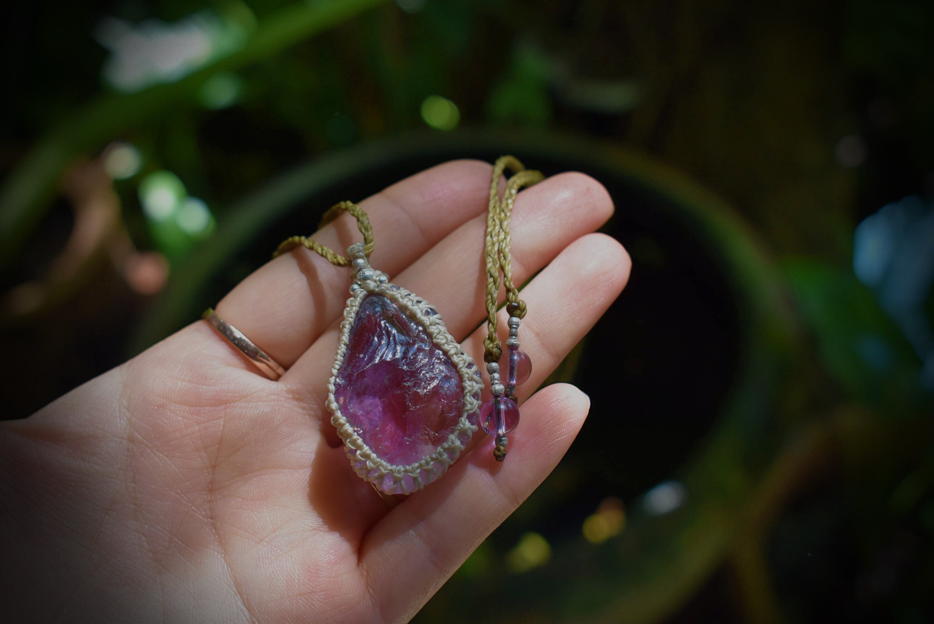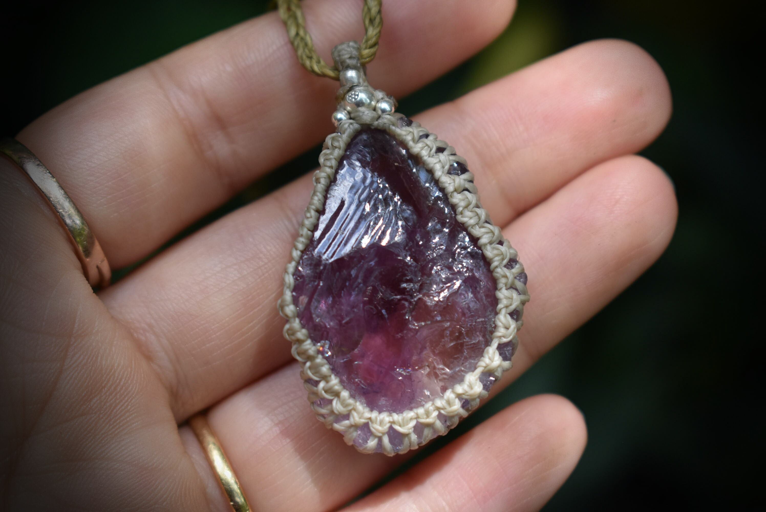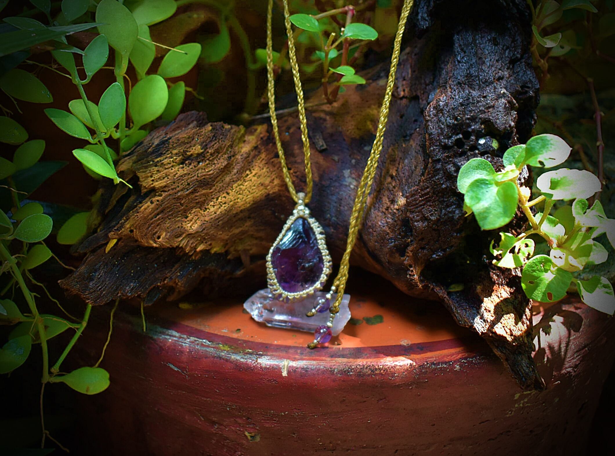 このたびのアメジスト、色味の少ない透明感ある部分とアメジストらしいパープルカラーがミックスされた、曇りのない透明感ある原石を使用してマクラメ編み装飾を施し、ペンダントに仕上げました。ペンダントのトップには大小と刻印が施されたカレンシルバー92.5ビーズをあしらいました。シンプルですがシャープなデザインでペンダントが誕生しました。