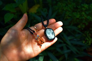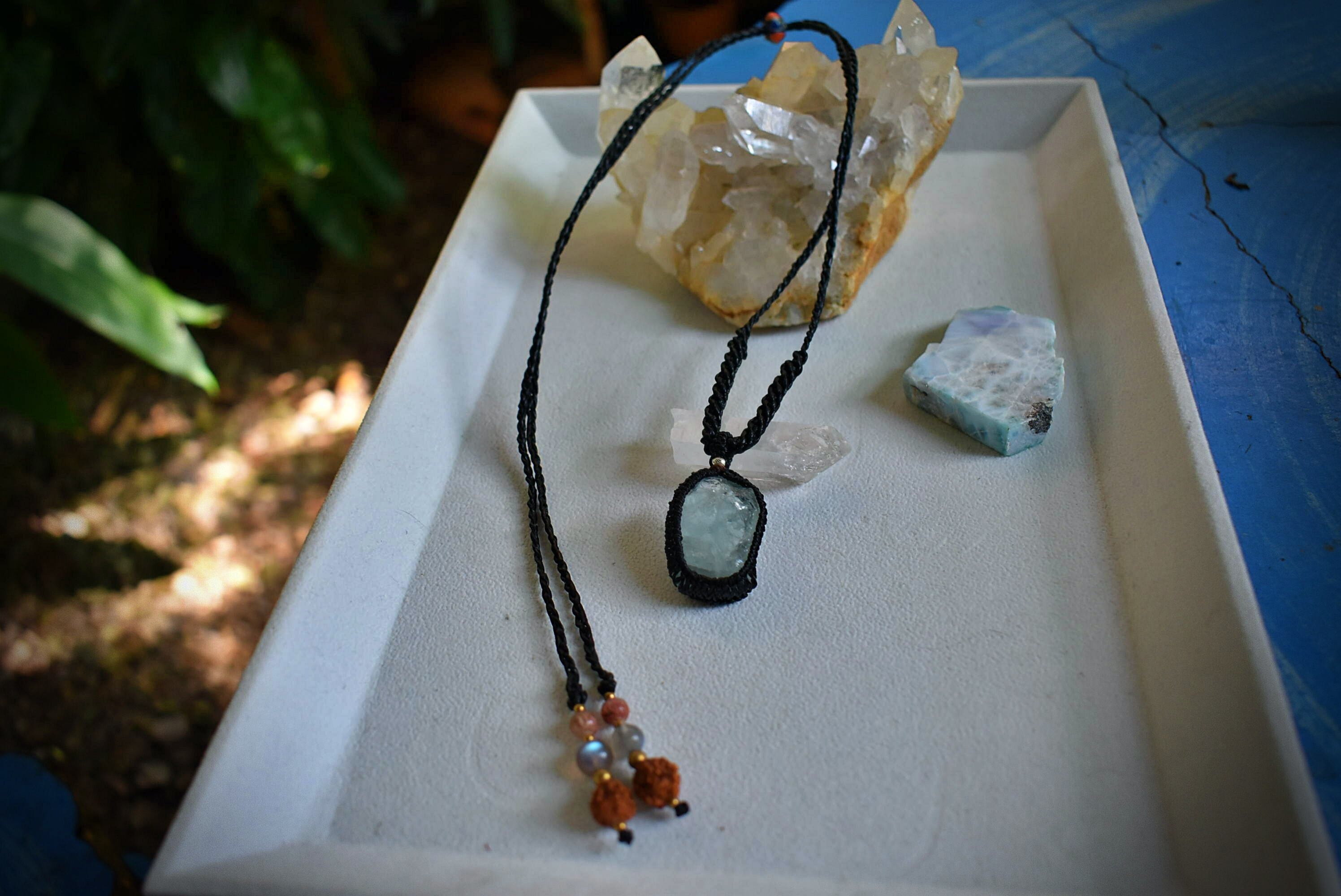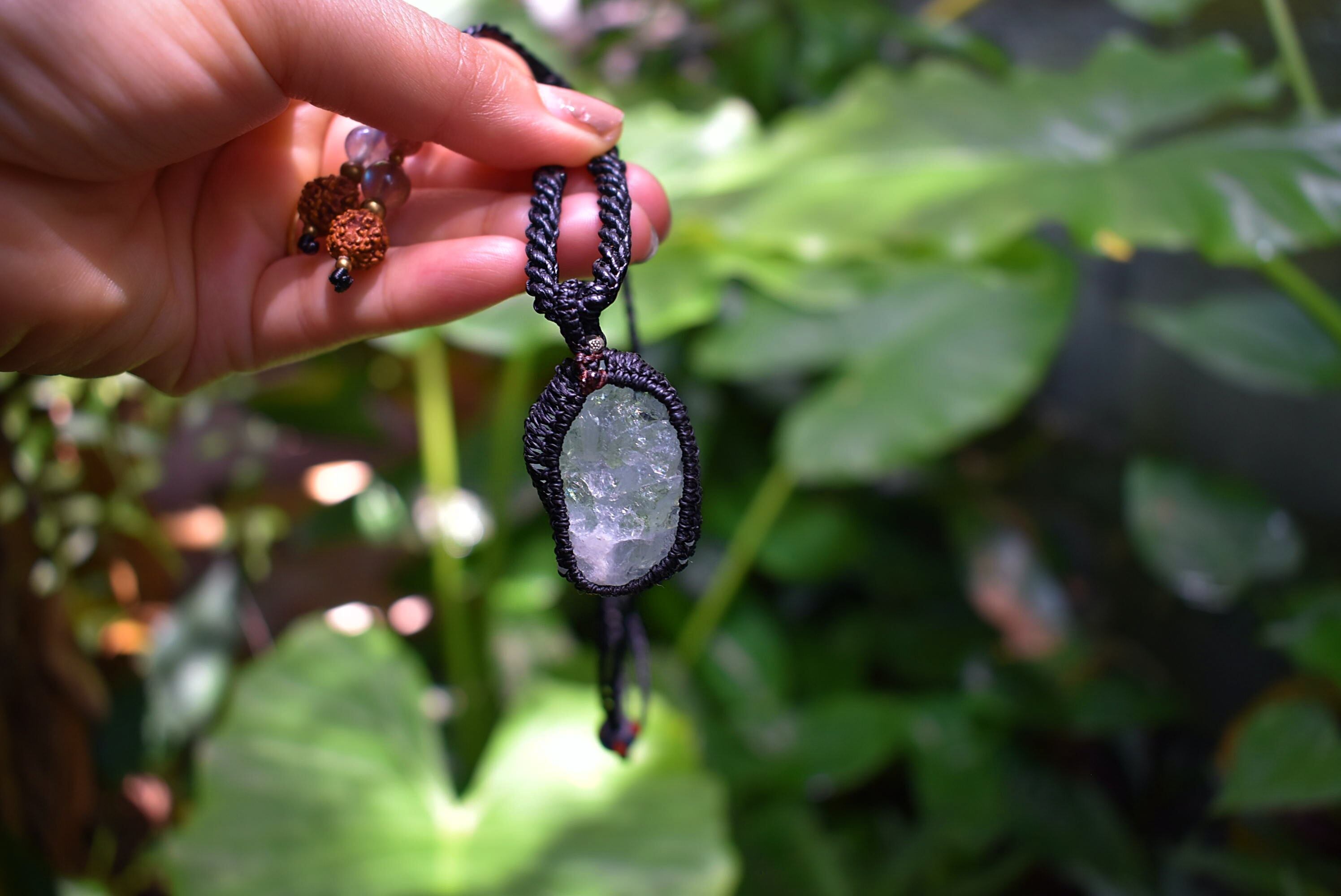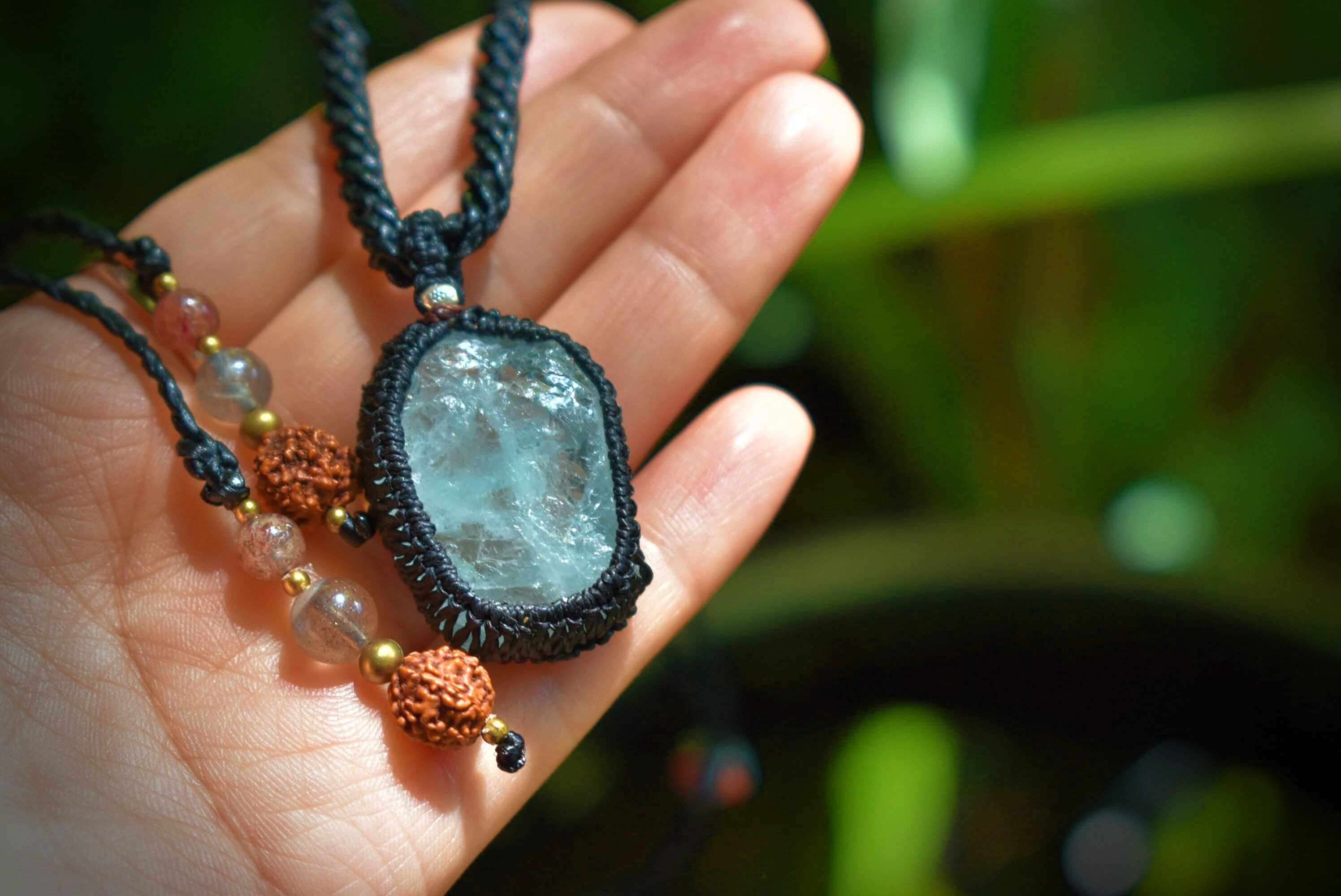 このたびのアクアマリン原石はミルキーな色合いと透明感が混ざり合う表面がキラキラと瞬きをするかのような原石の形をそのままマクラメ編み装飾を施してペンダントに仕上げました。