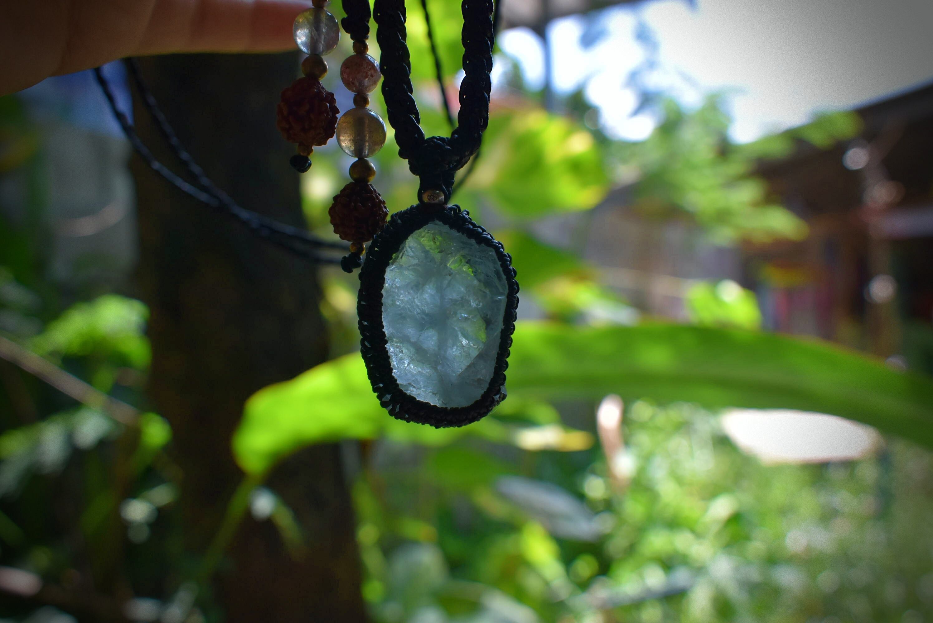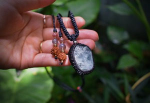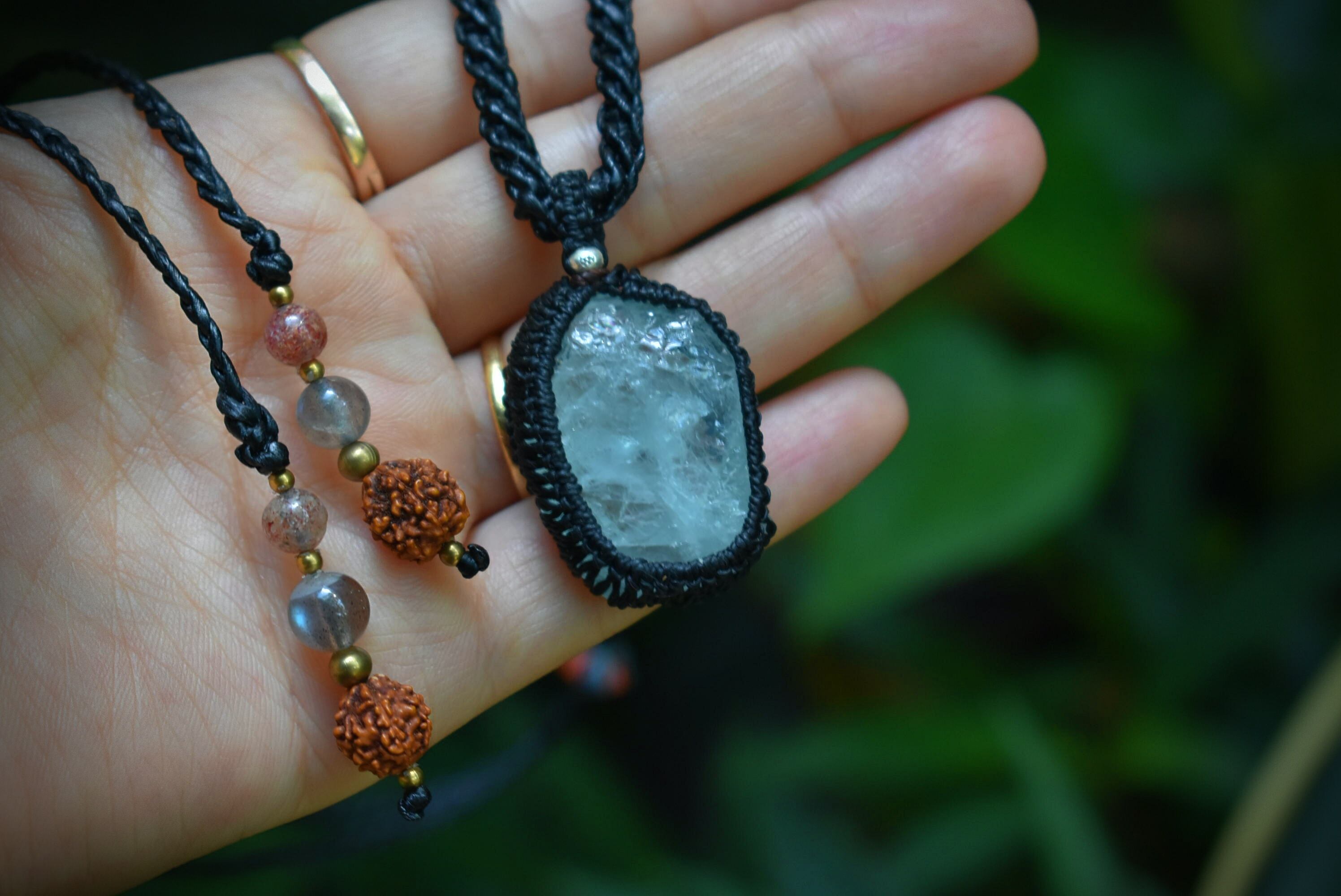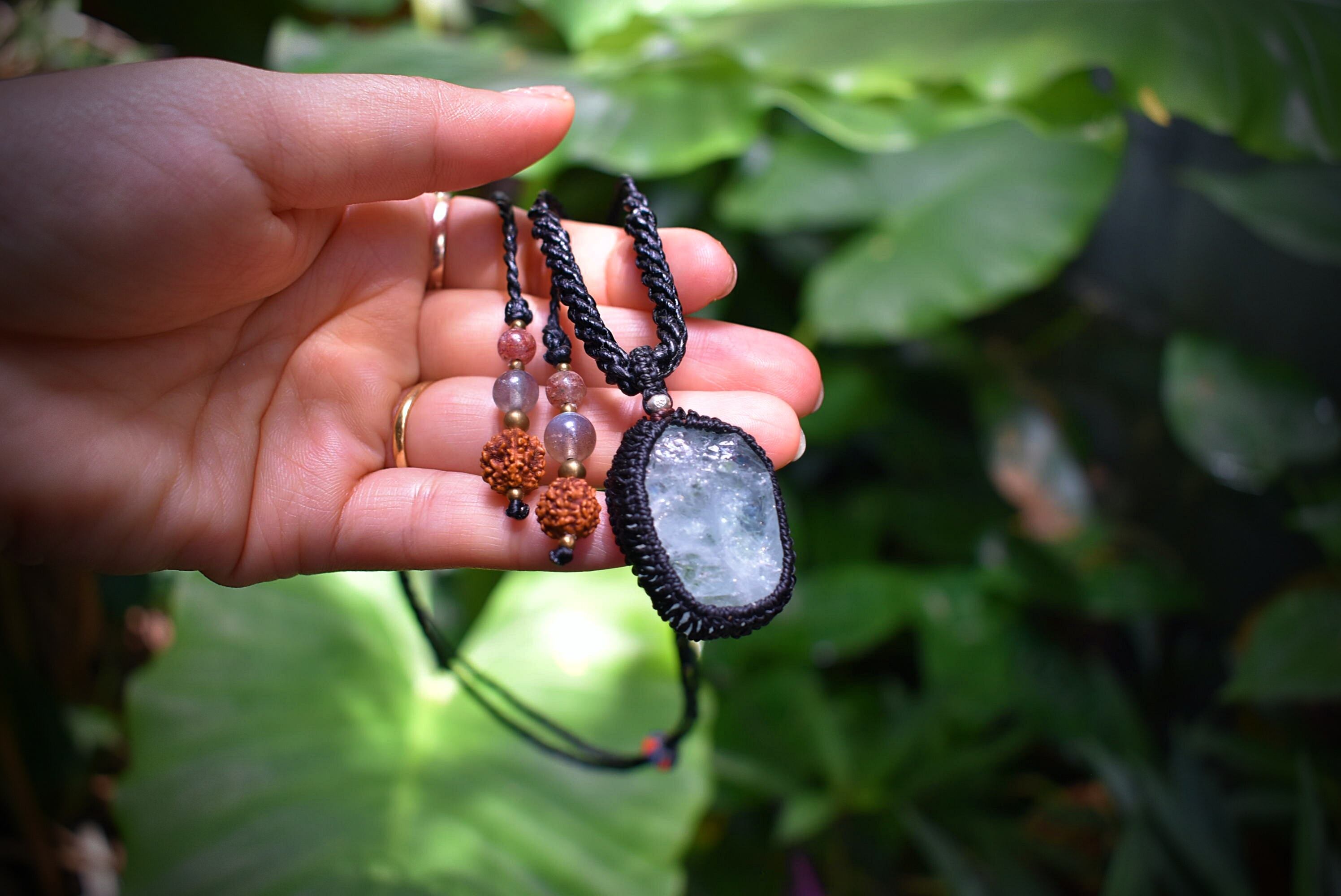 このたびのアクアマリン原石はミルキーな色合いと透明感が混ざり合う表面がキラキラと瞬きをするかのような原石の形をそのままマクラメ編み装飾を施してペンダントに仕上げました。