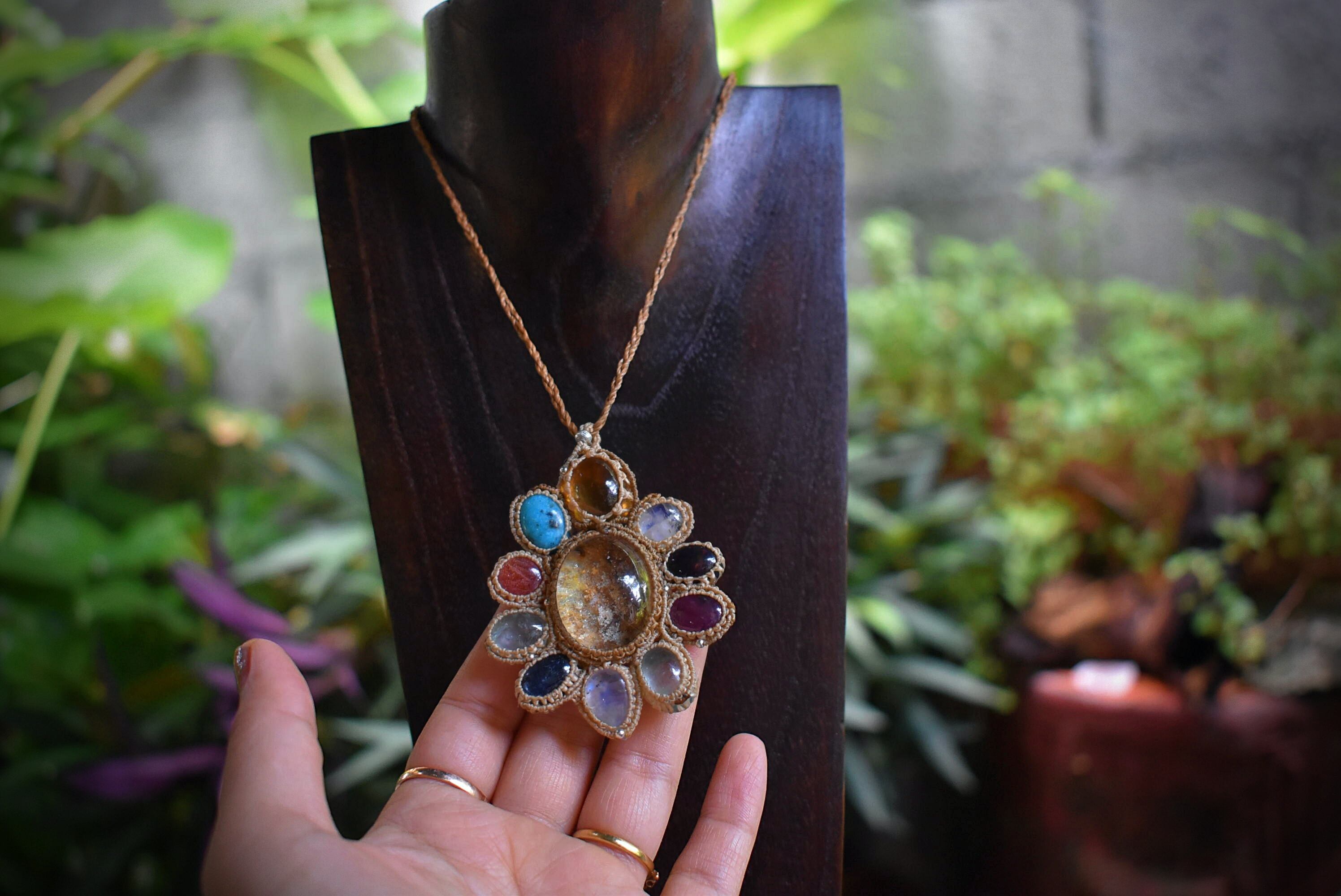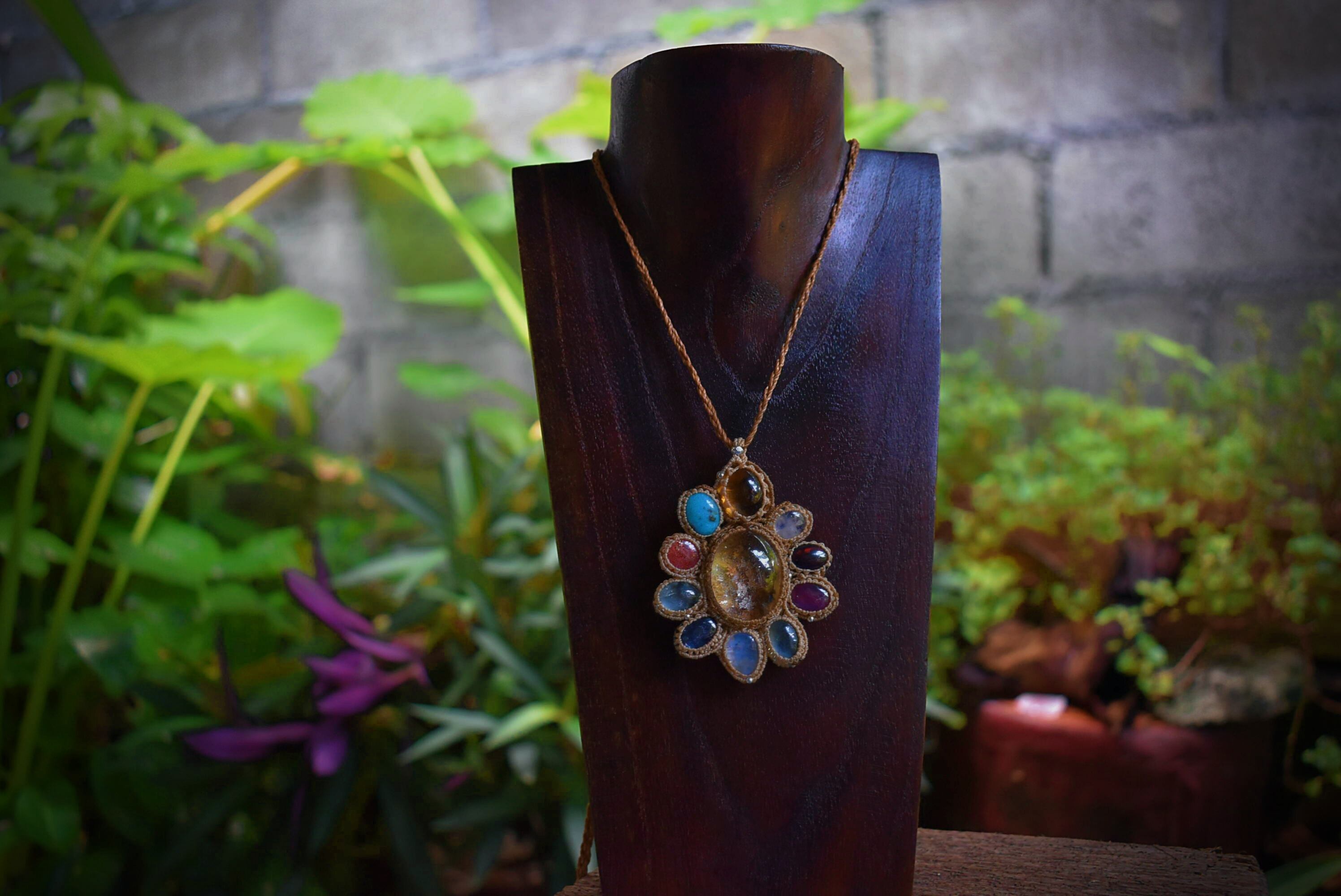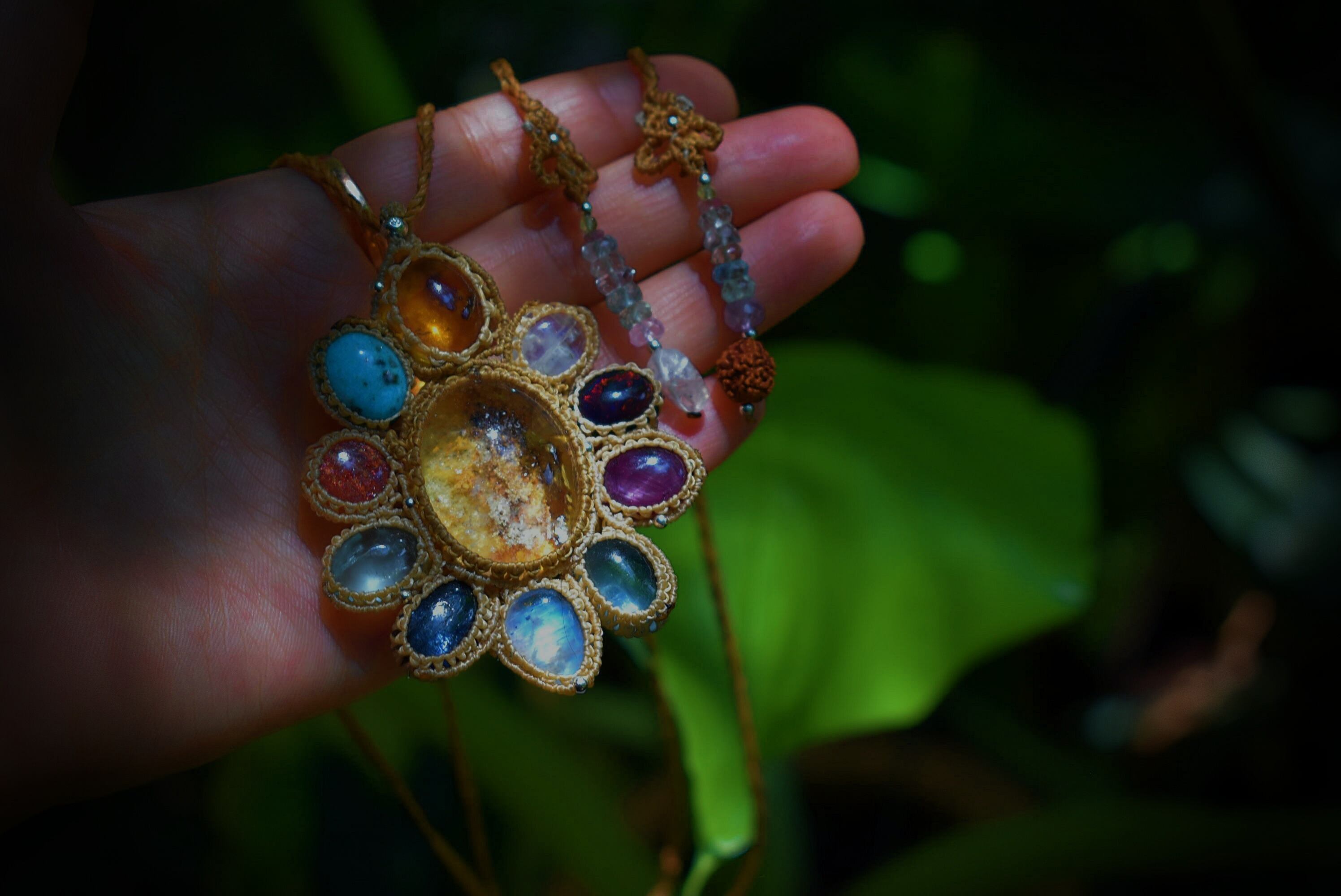 色味が重なるグリーン・レッドファイヤーオパール、ルビー、ターコイズ、アクアマリン、シトリン、カイヤナイト、サンストーン..10種類の高品質なジェムストーンを思う存分使用して特別なフラワーペンダントが仕上がりました。
