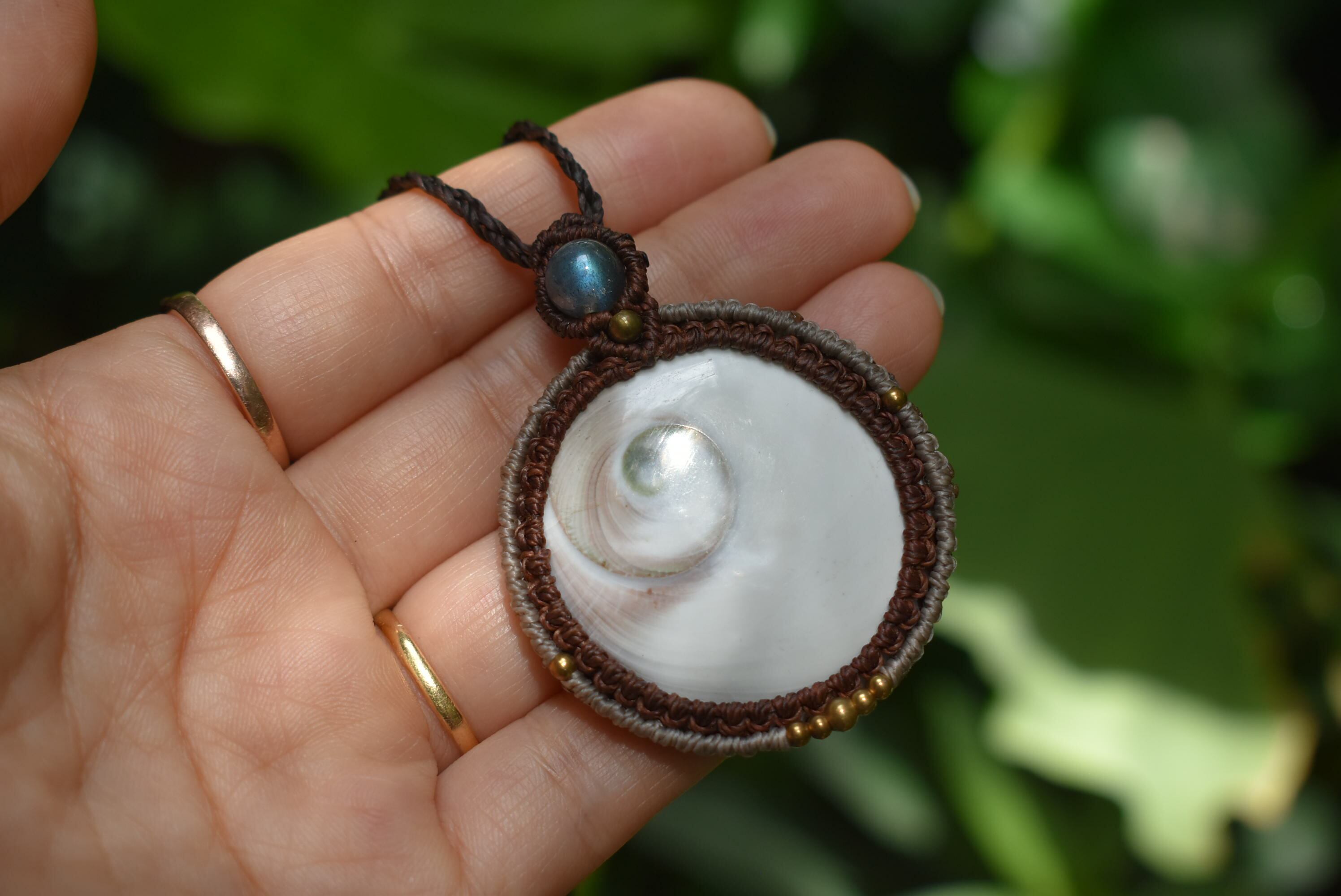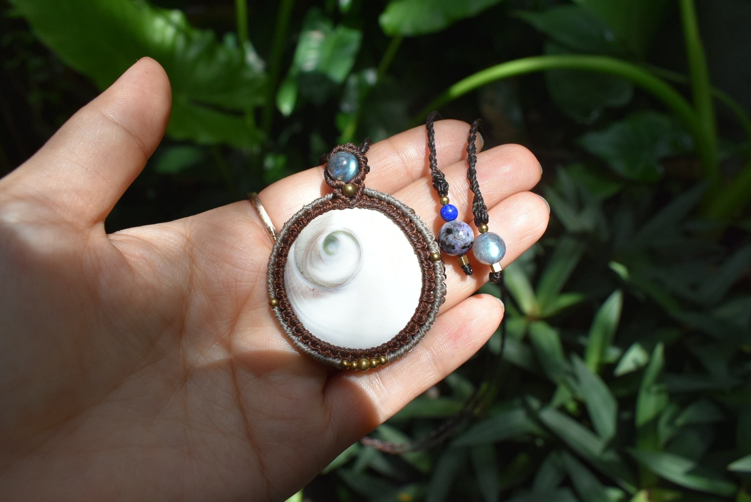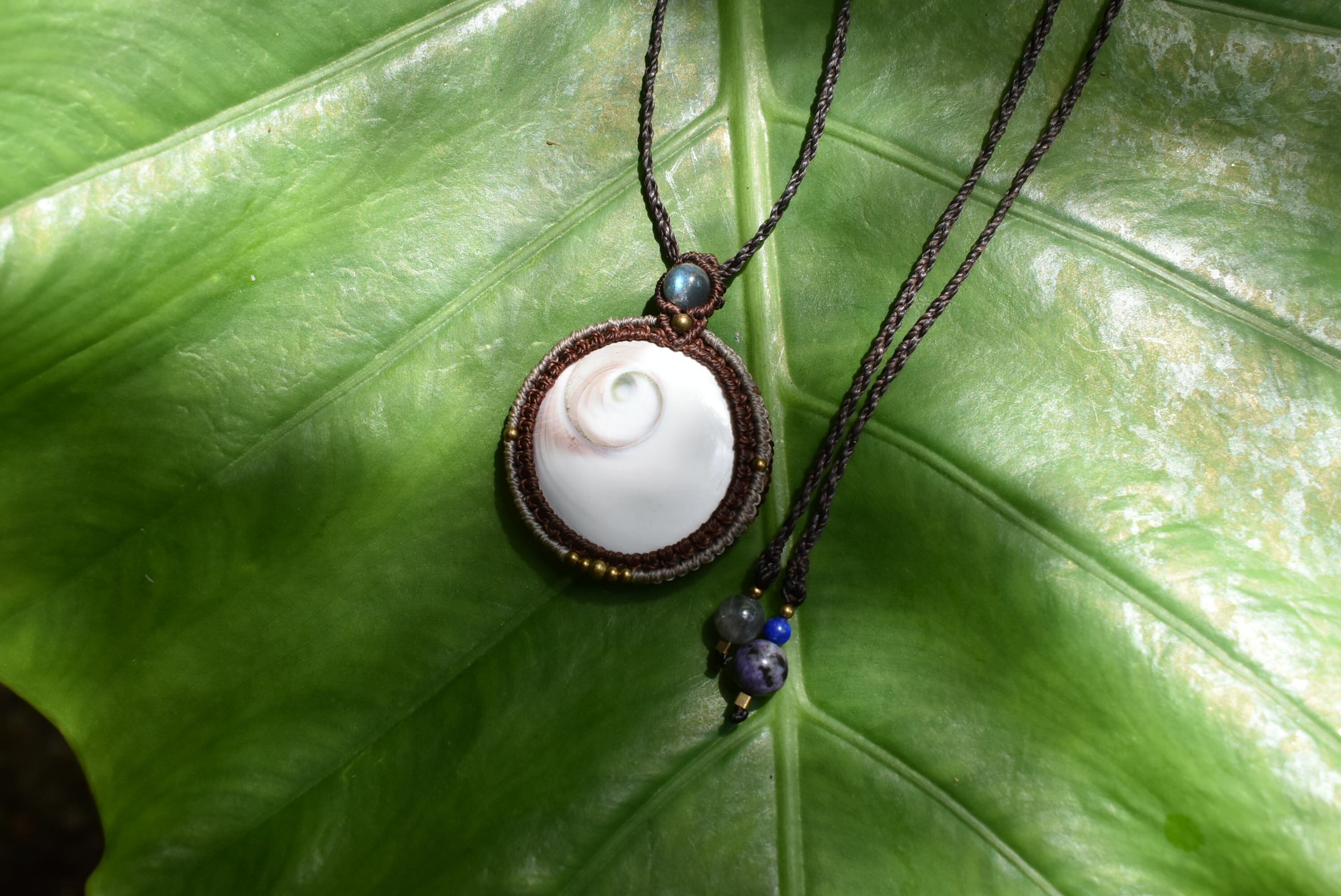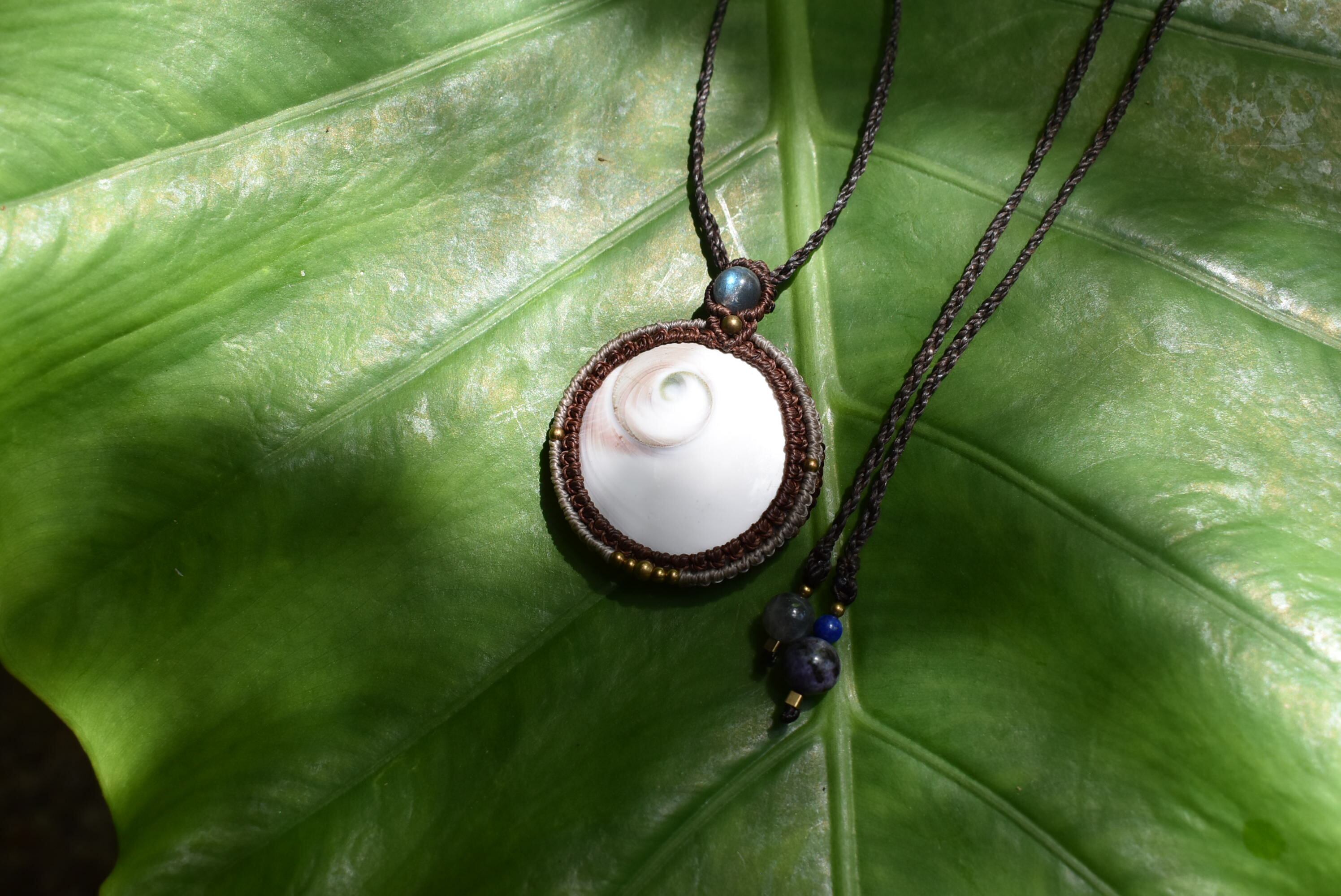 トップにブルーラブラドライトを使用して大振りのシヴァアイを丁寧にしっかりとマクラメ編み装飾を施したネックレスを制作しました。
