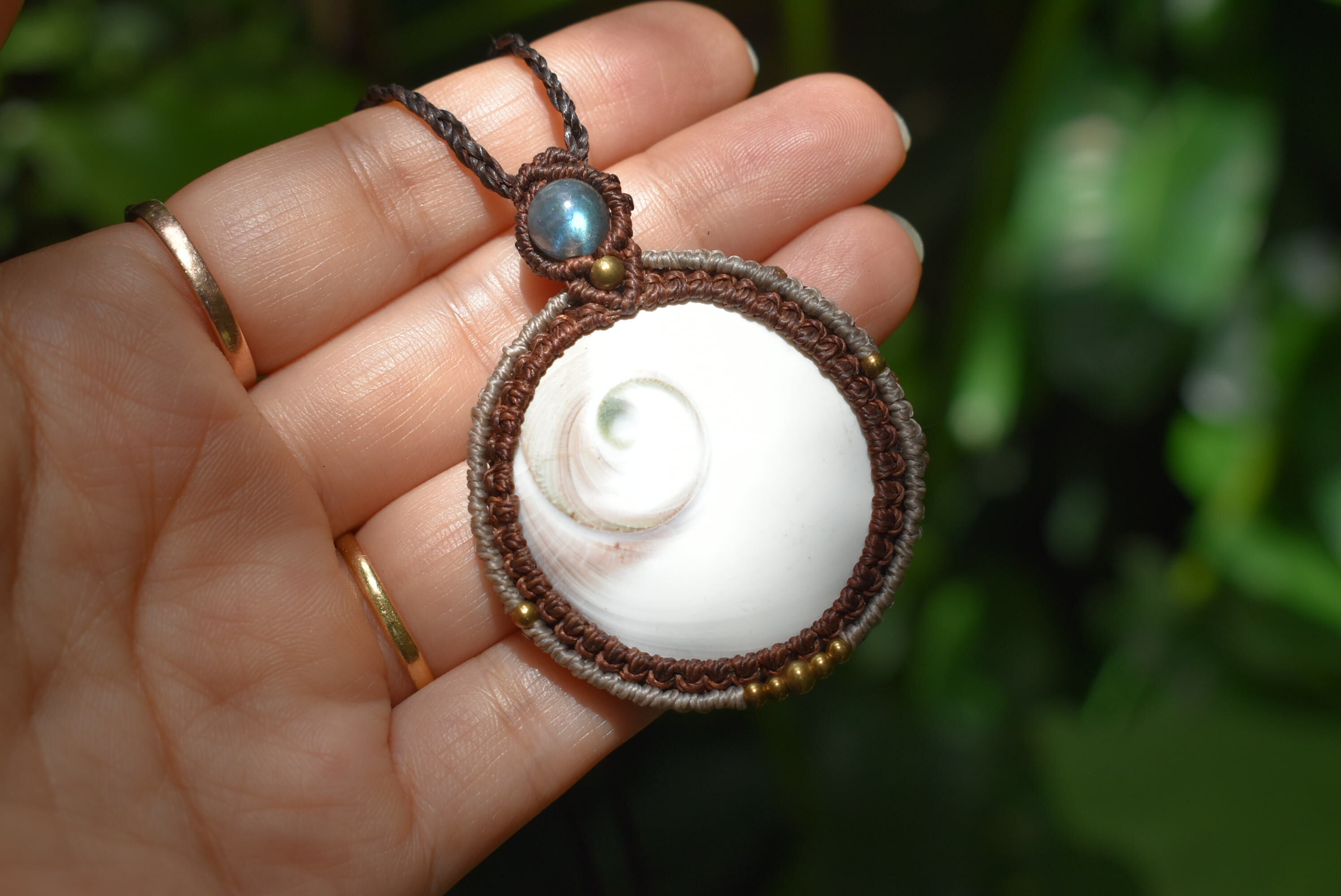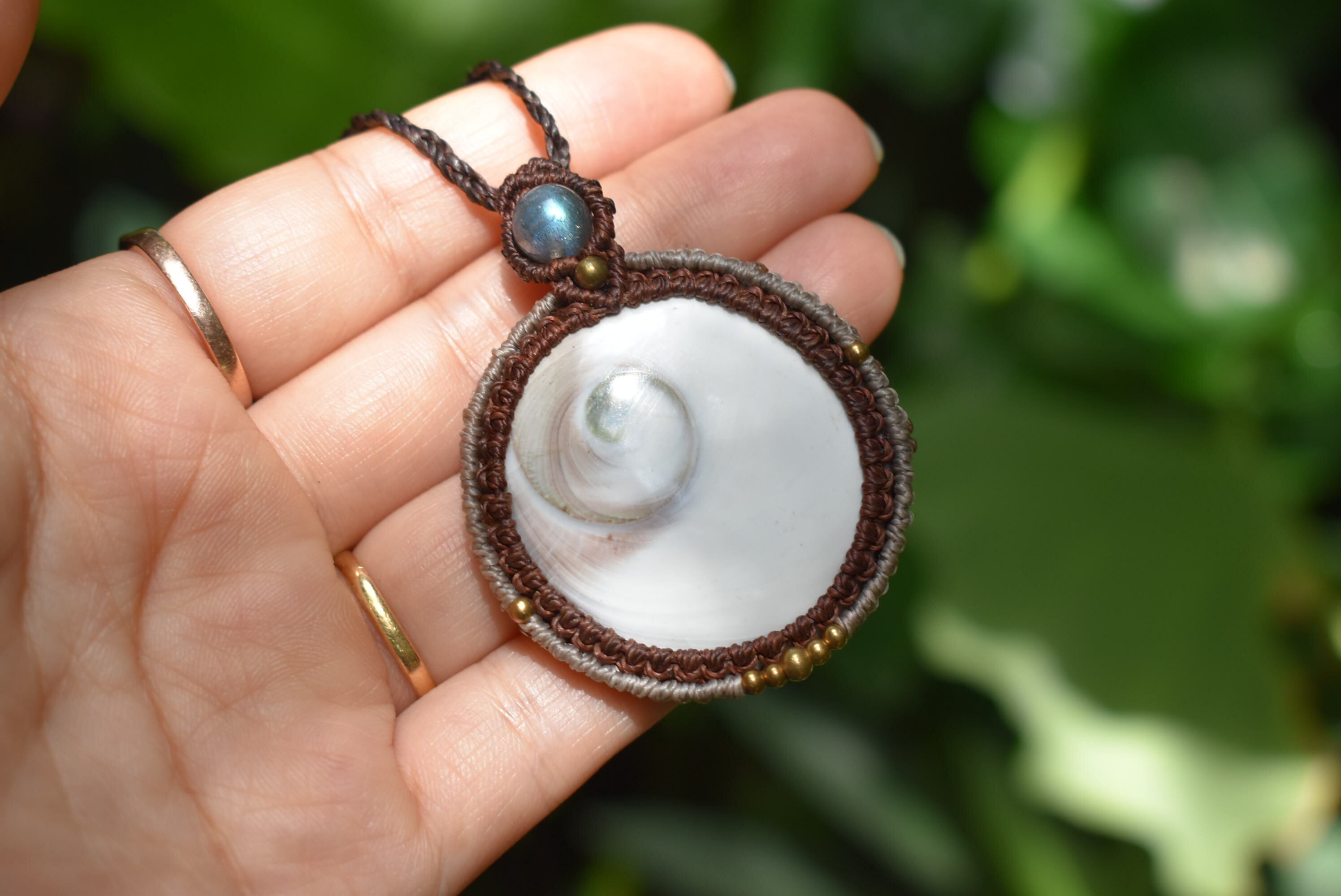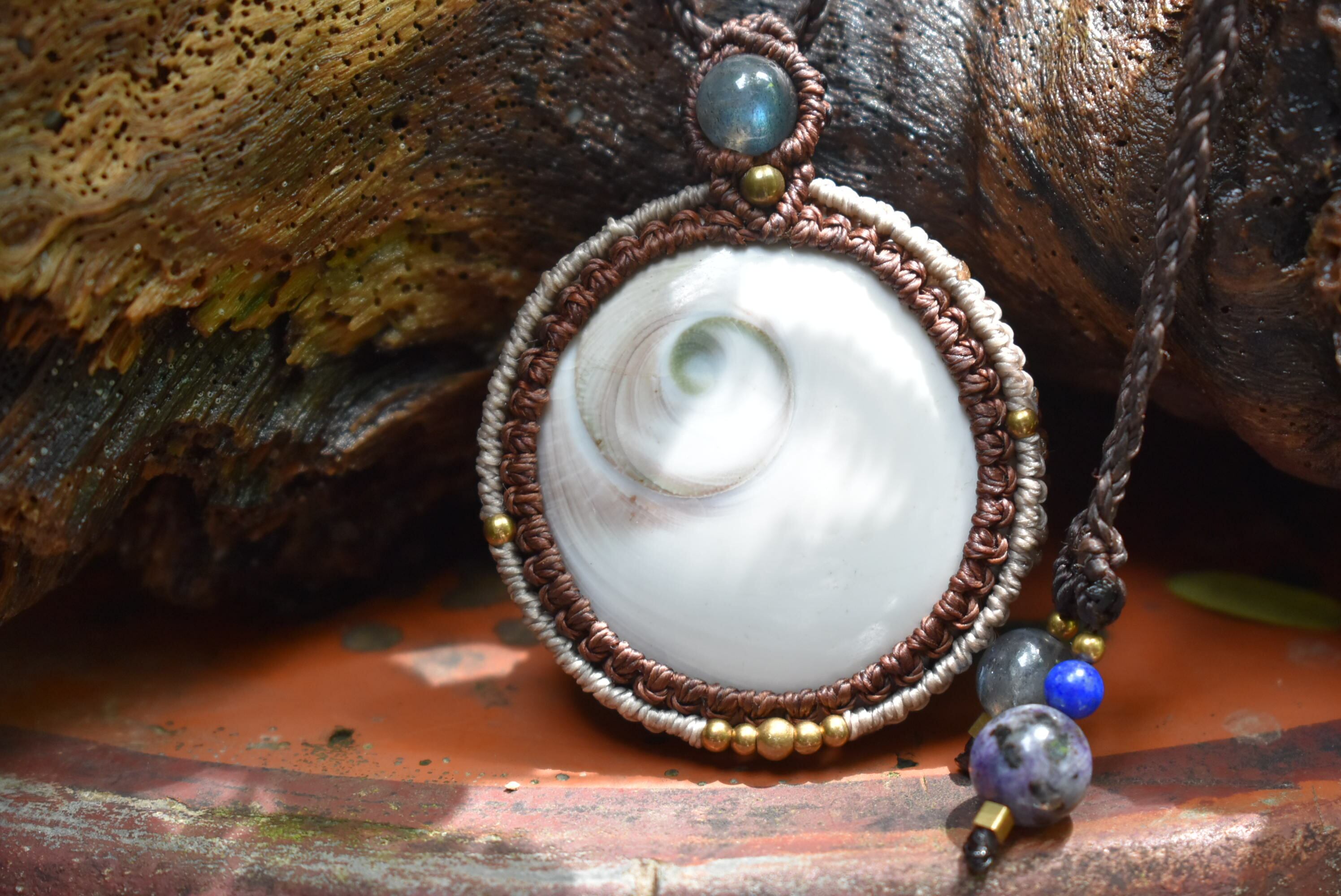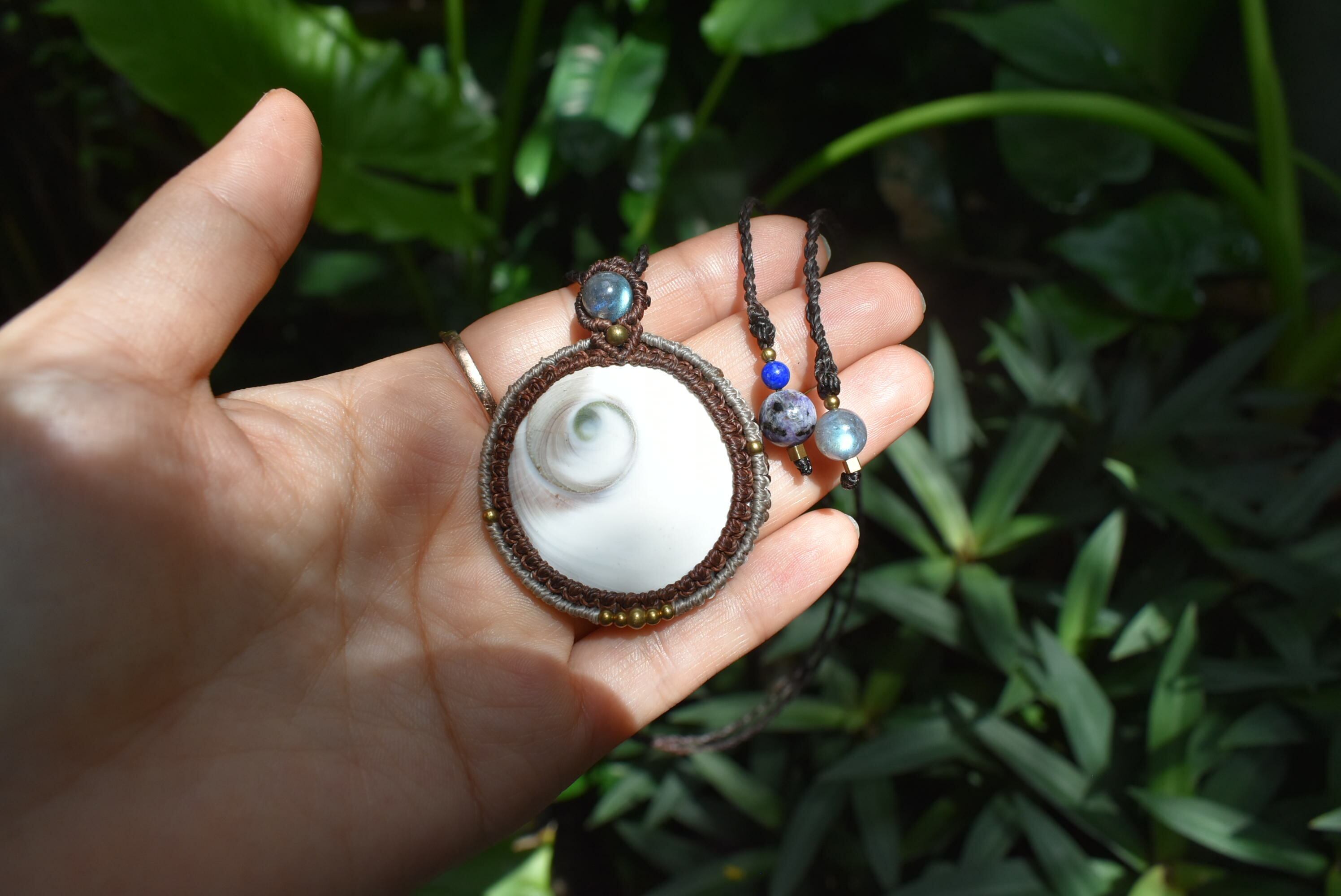 トップにブルーラブラドライトを使用して大振りのシヴァアイを丁寧にしっかりとマクラメ編み装飾を施したネックレスを制作しました。