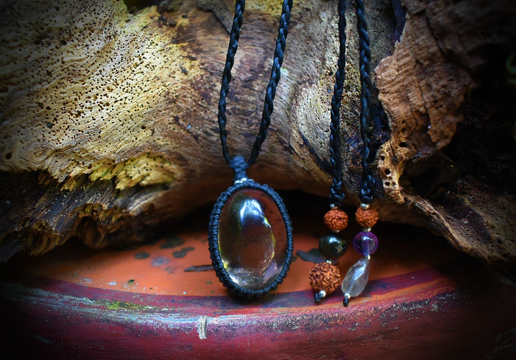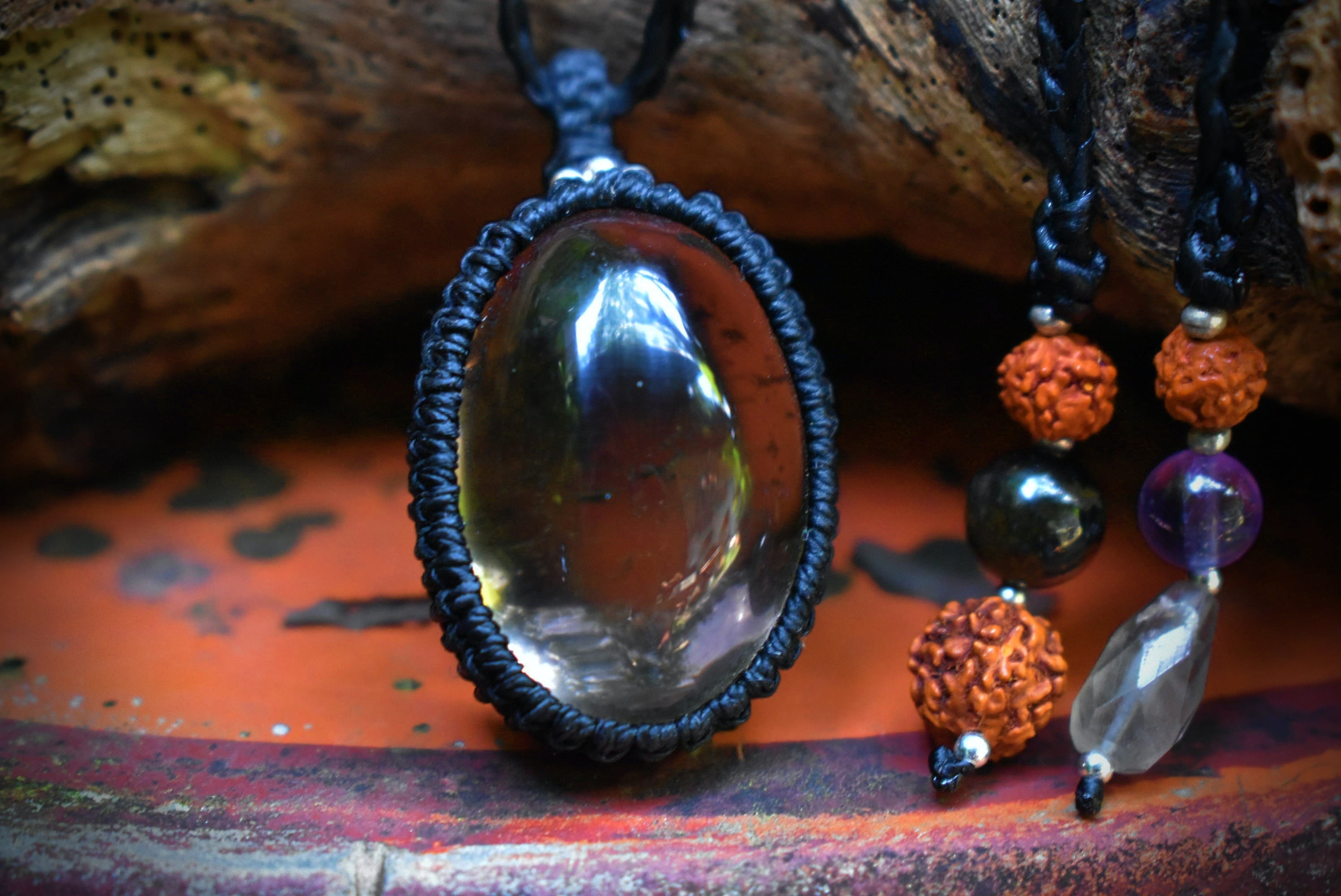ぷっくりとボリュームあるスモーキークォーツにカレンシルバービーズをあしらって、シンプルにマクラメ編みペンダントを制作しました。スモーキークォーツ自体は透明感と奥ゆき、ちょっとした内包物がぱらついており、良質なもの。魅了する輝きはまさしく”黒水晶”そのもの。お探しの方に。。
