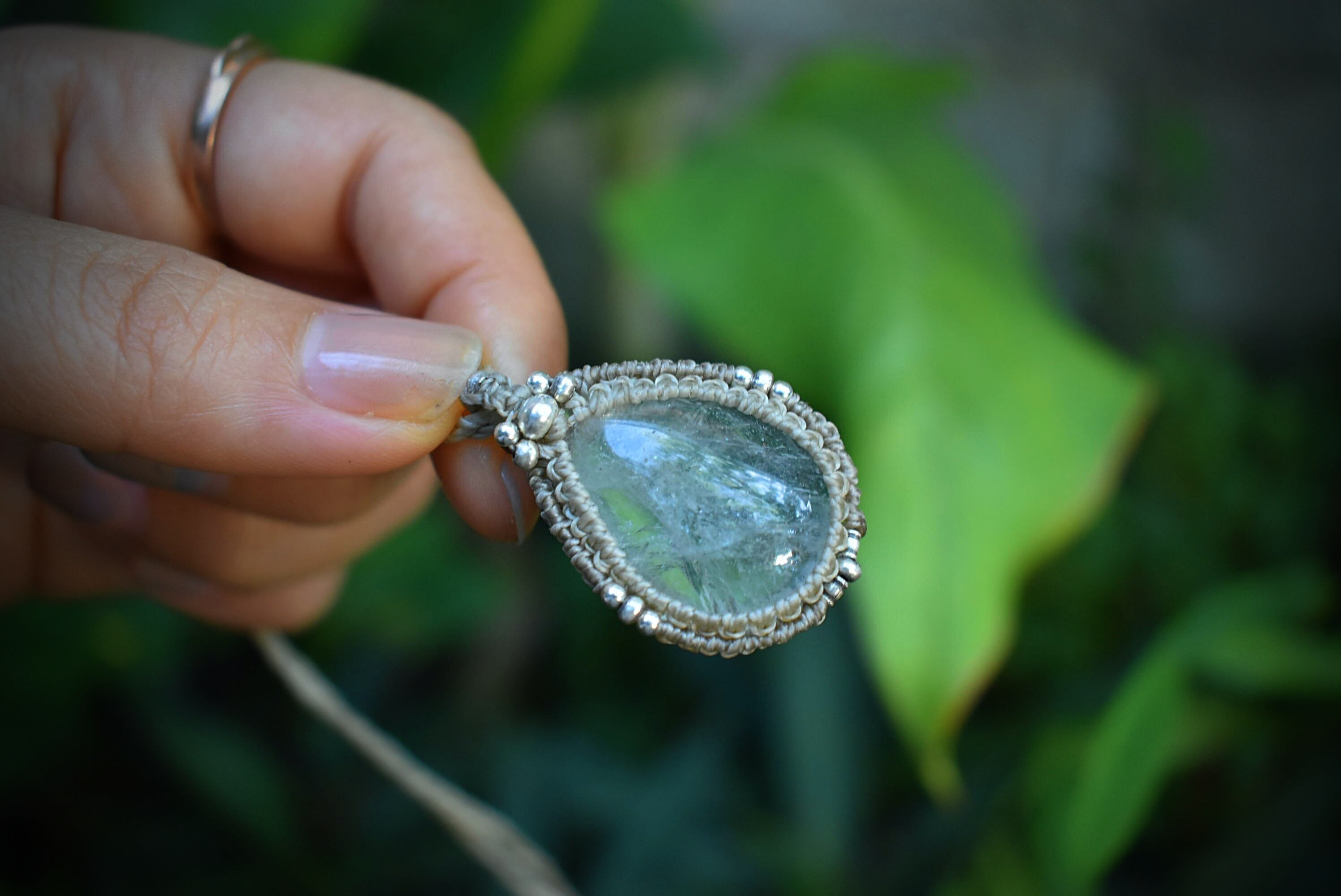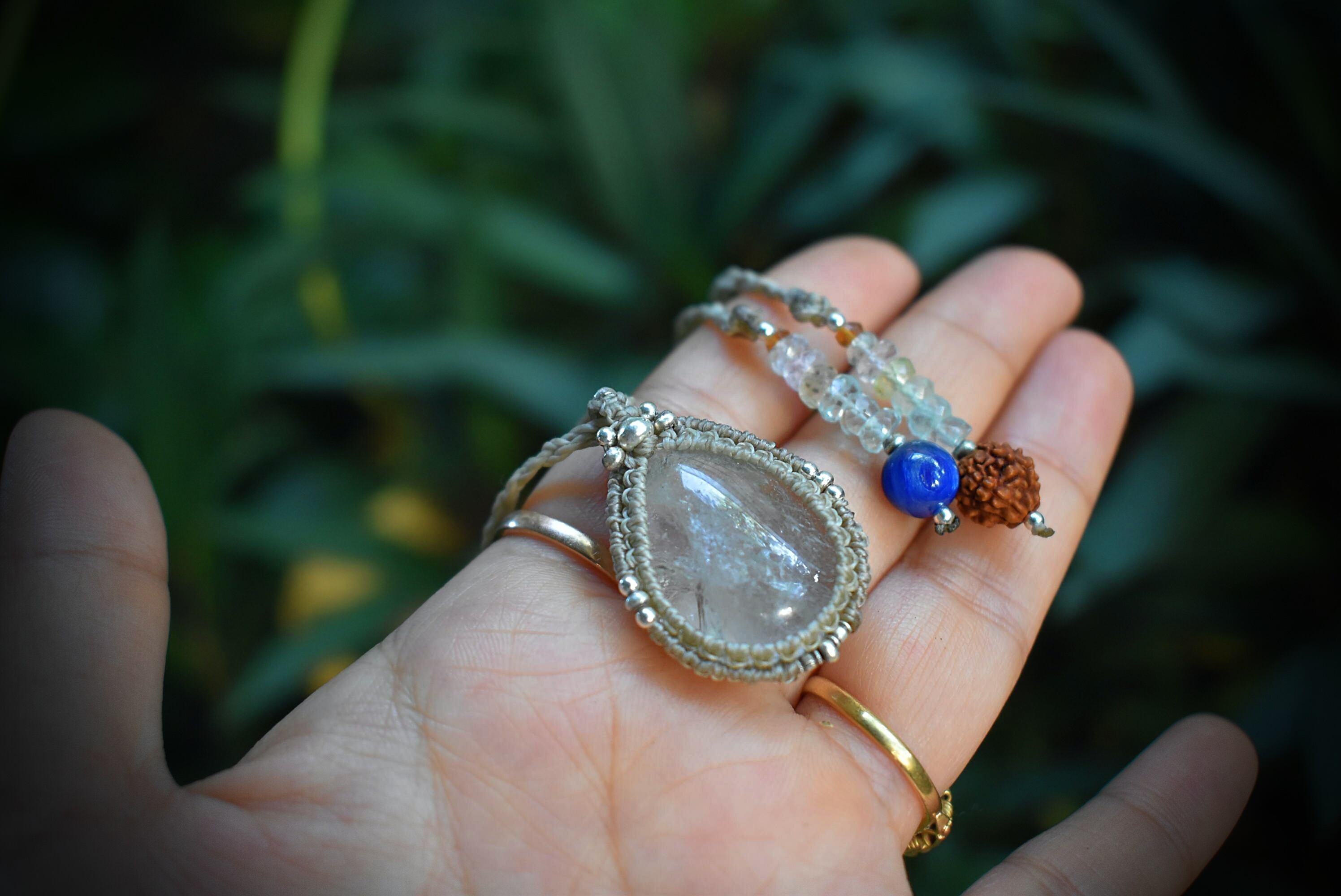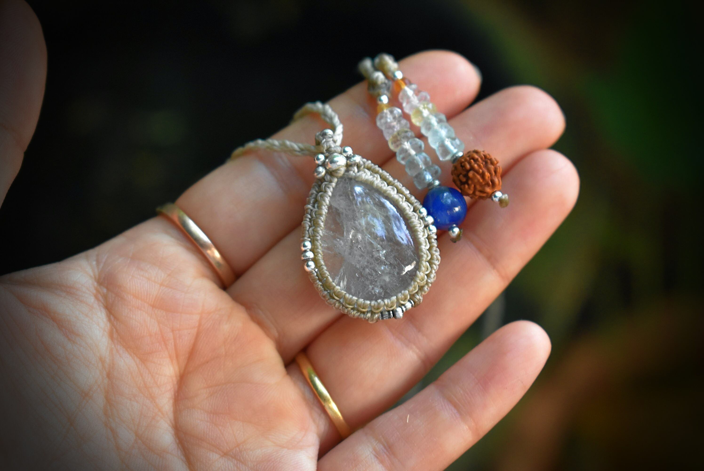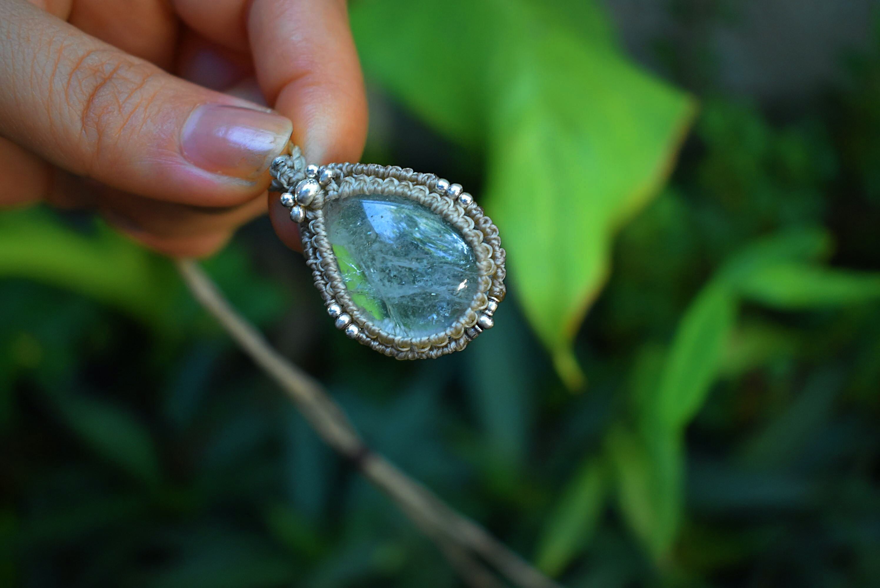 透明感あるクリアな宝石質のアクアマリンをカレンシルバー92.5ビーズと共にマクラメ編み装飾を施してペンダントに仕上げました。かすかに見えるインクルージョンとシラーがとびっきりの宝物のひとつとして胸元を照らします。