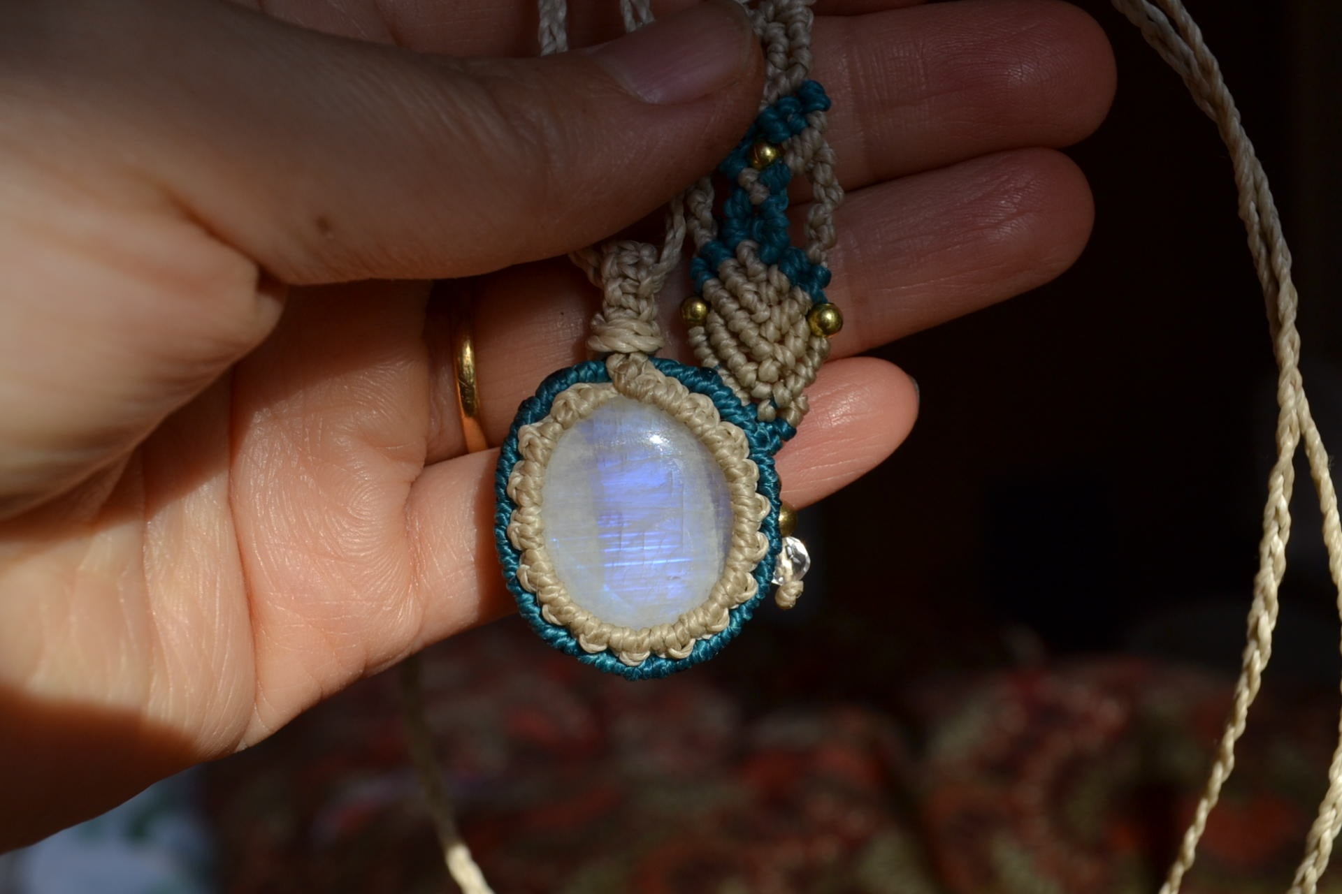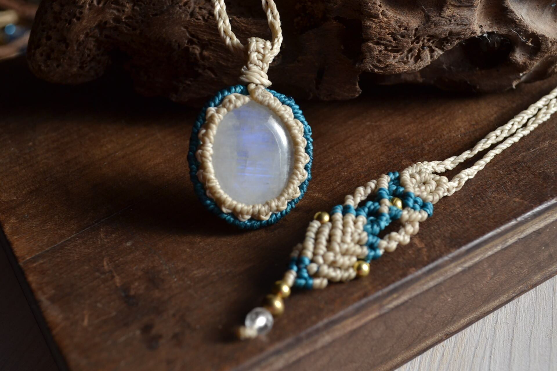 女性に優しく、見た目も可愛いブルームーンストーンをこの度はシンプルにマクラメ編み装飾を施し、ペンダントに仕上げました。