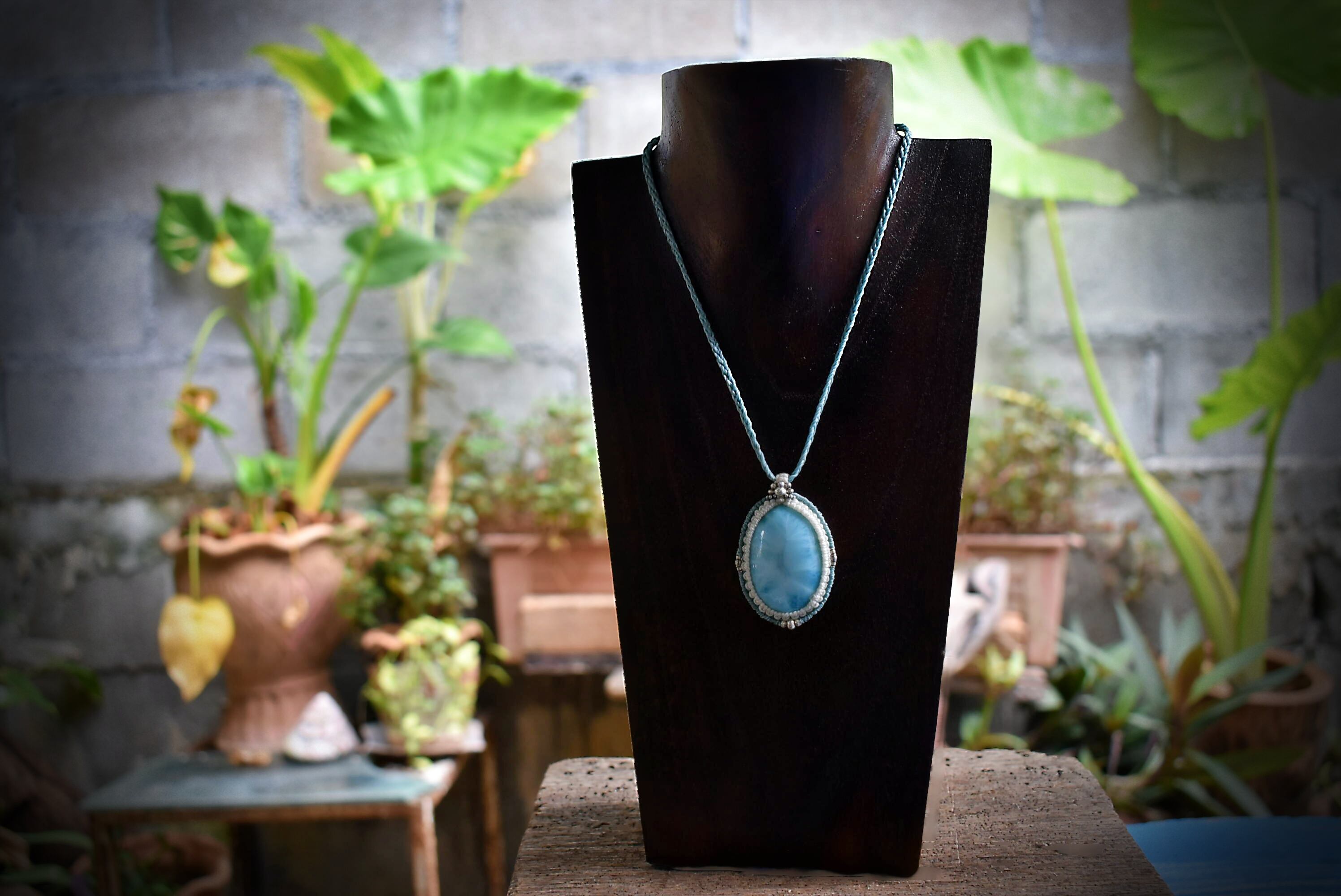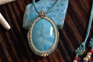 ◆このたびはスカイブルー、差し色としてホワイトの2色の蝋引き糸を使用しマクラメ編み装飾を施しました。