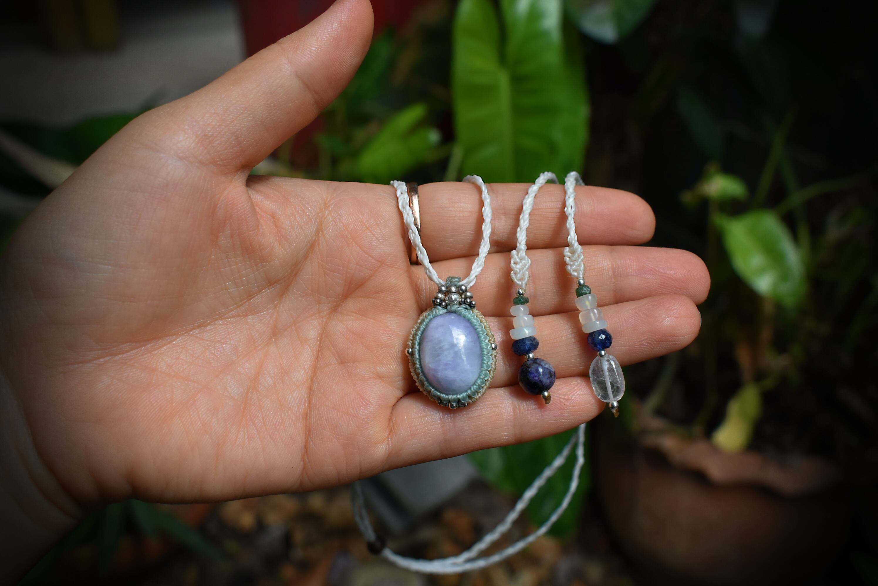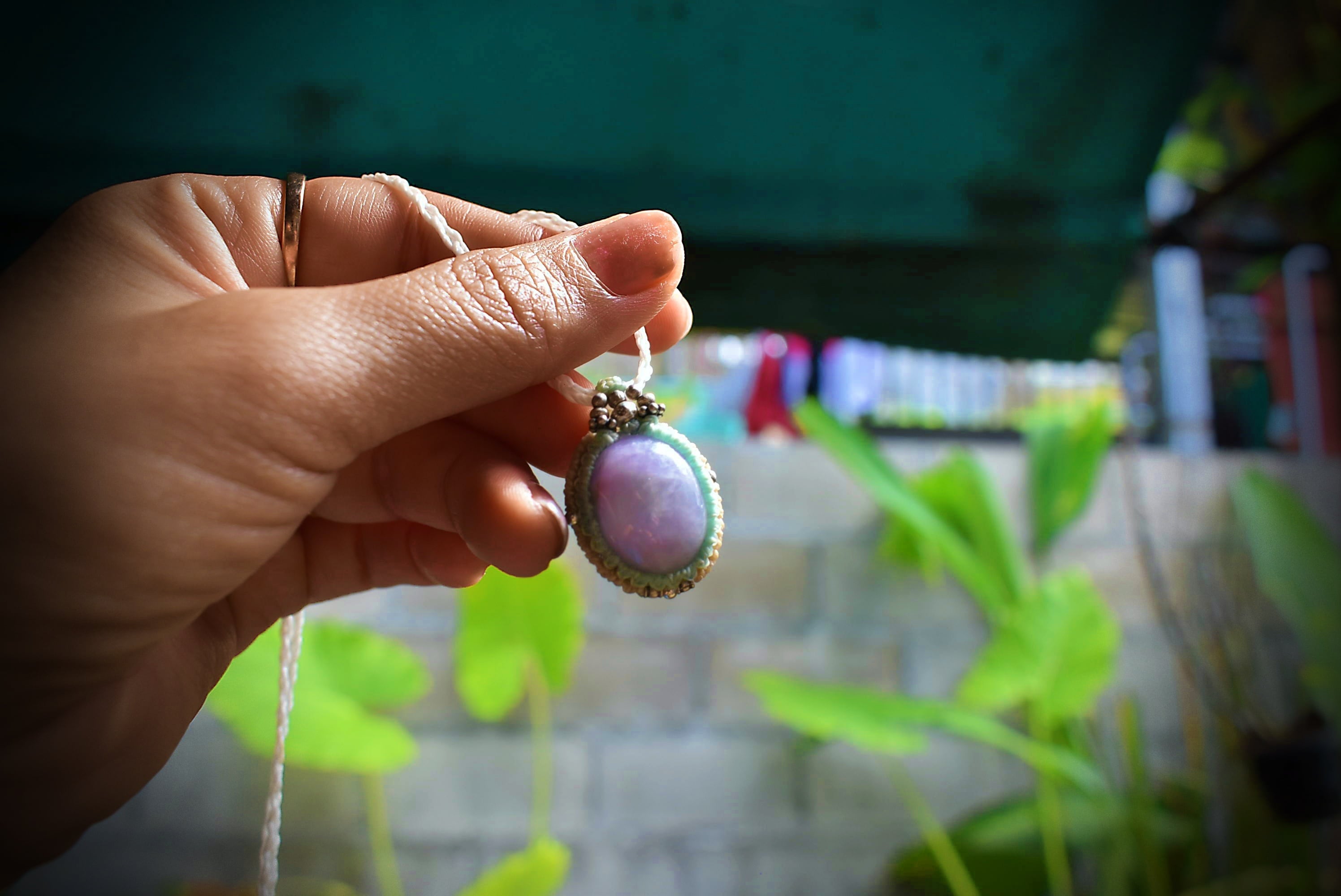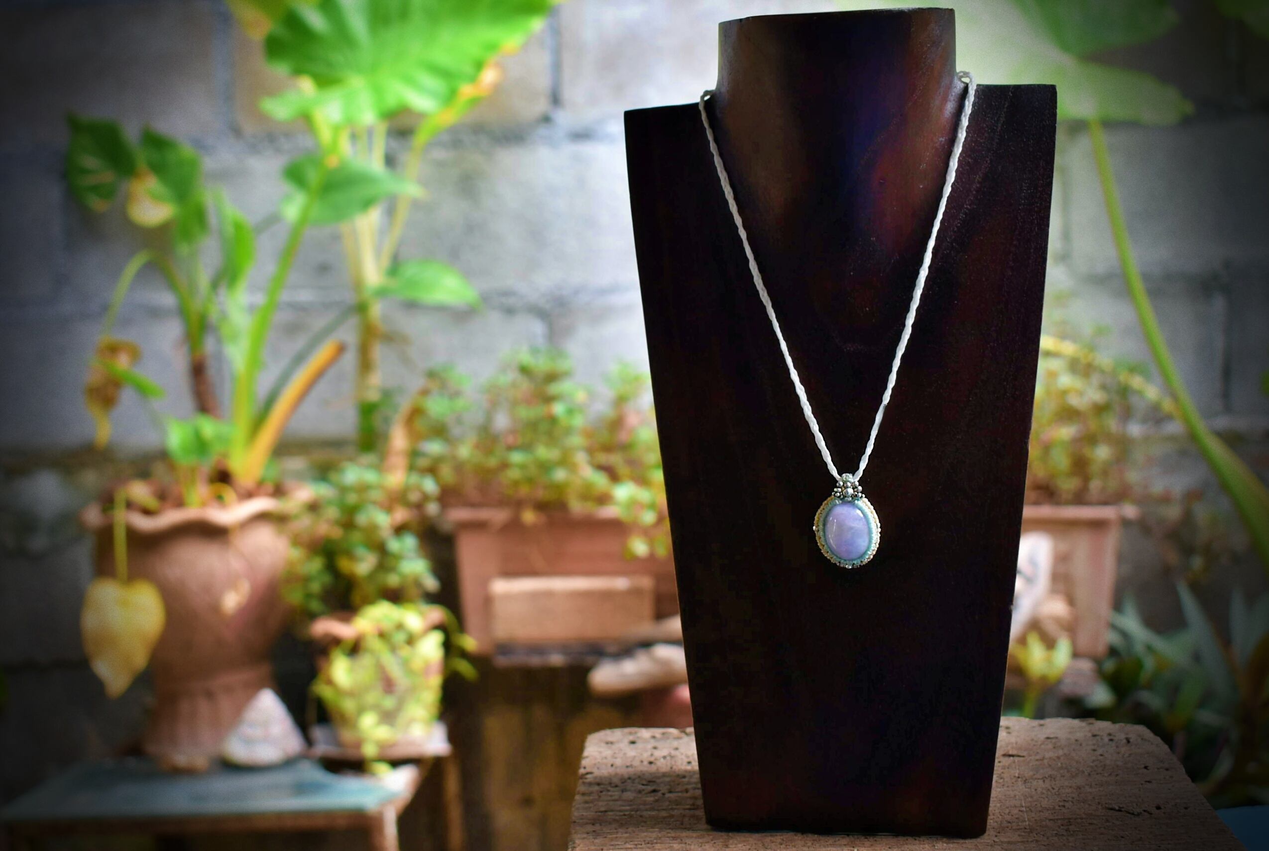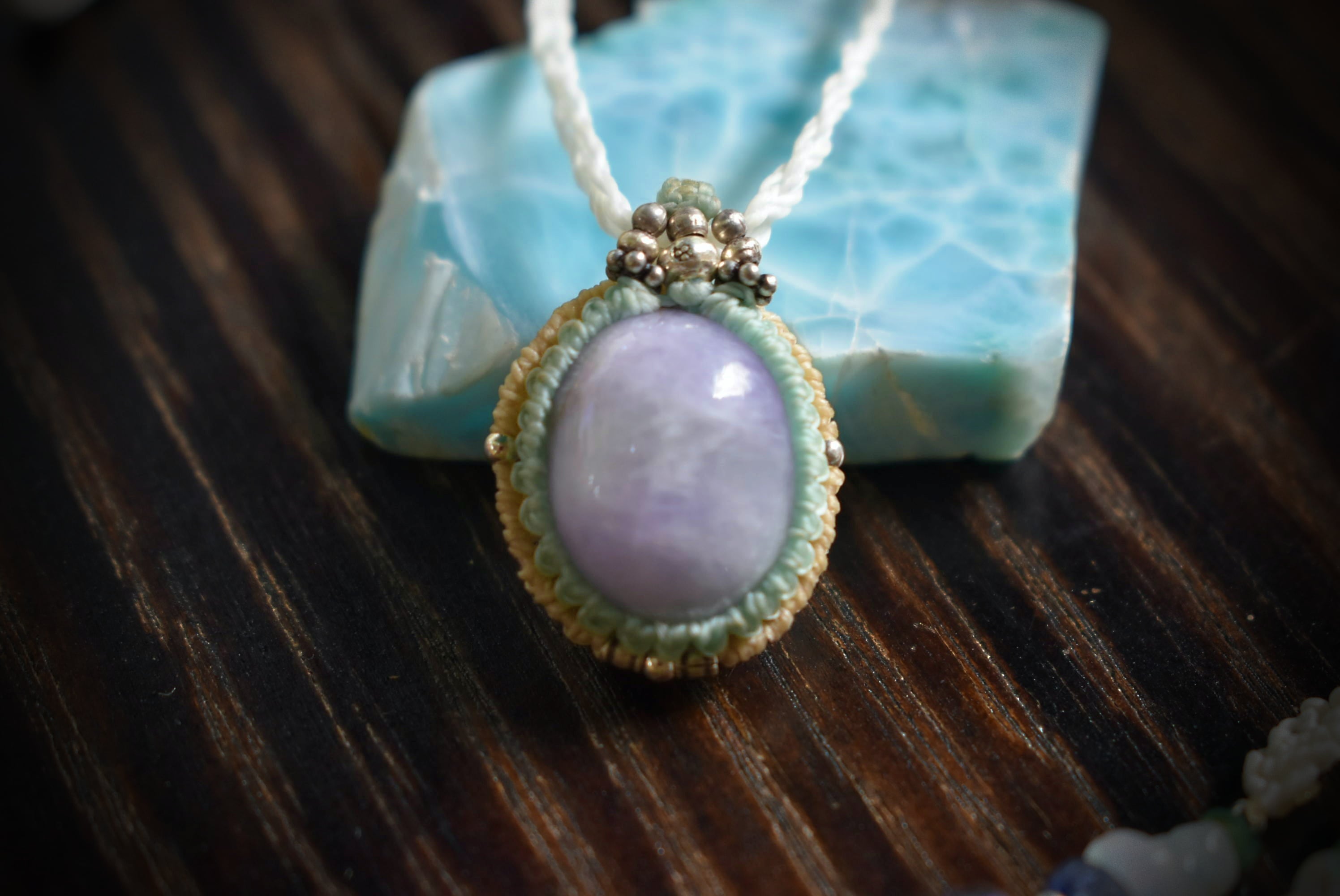 ほんのり薄紫の色味がレースのようにかかった優しい石ラベンダージェイド(翡翠)。天然石ルースとしては市場に出ることがあまりない、希少なジェイドをこのたび手にしましたので、さっそくマクラメペンダントに仕上げました。昔から人気の天然石とされるミャンマー産ラベンダージェイド。