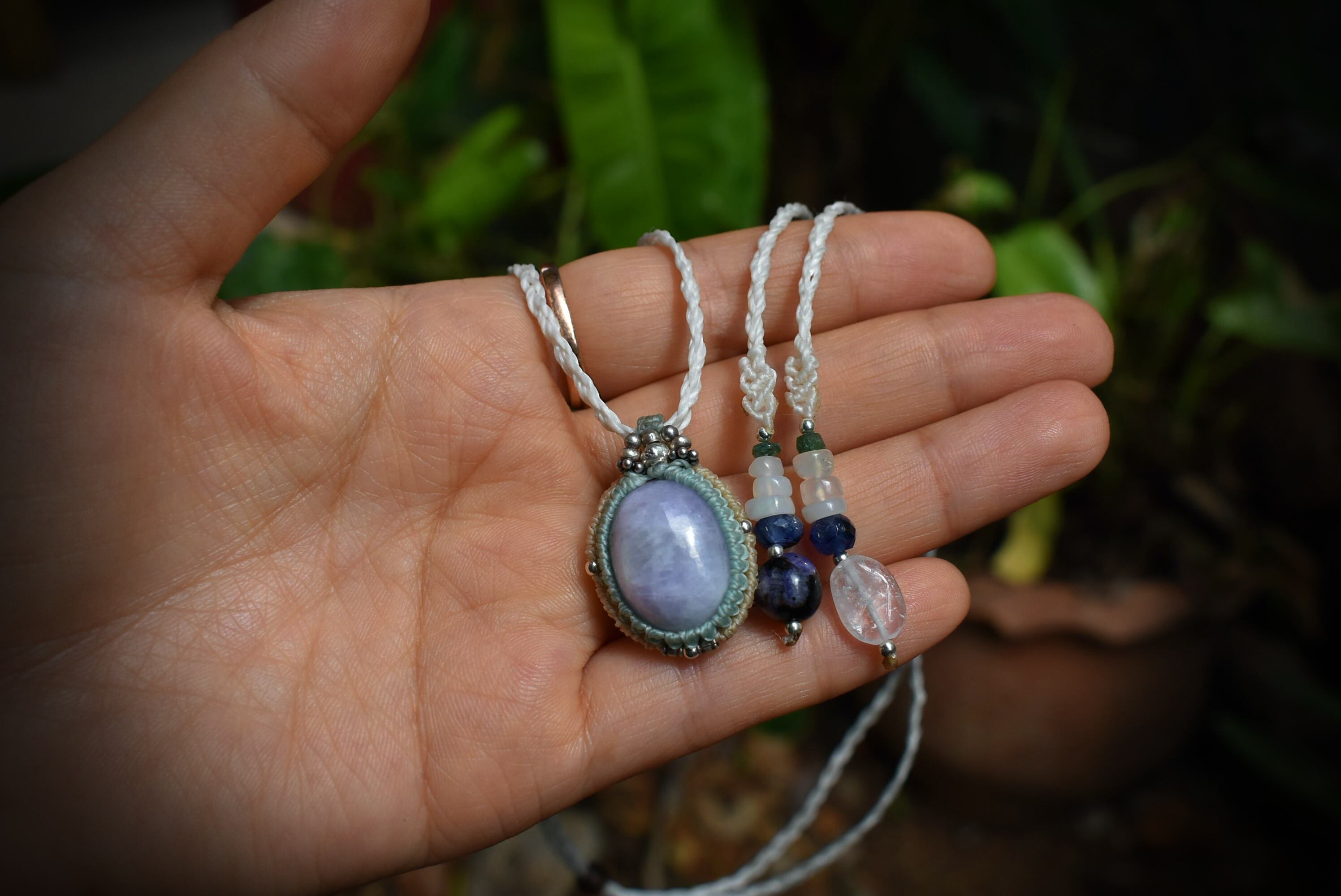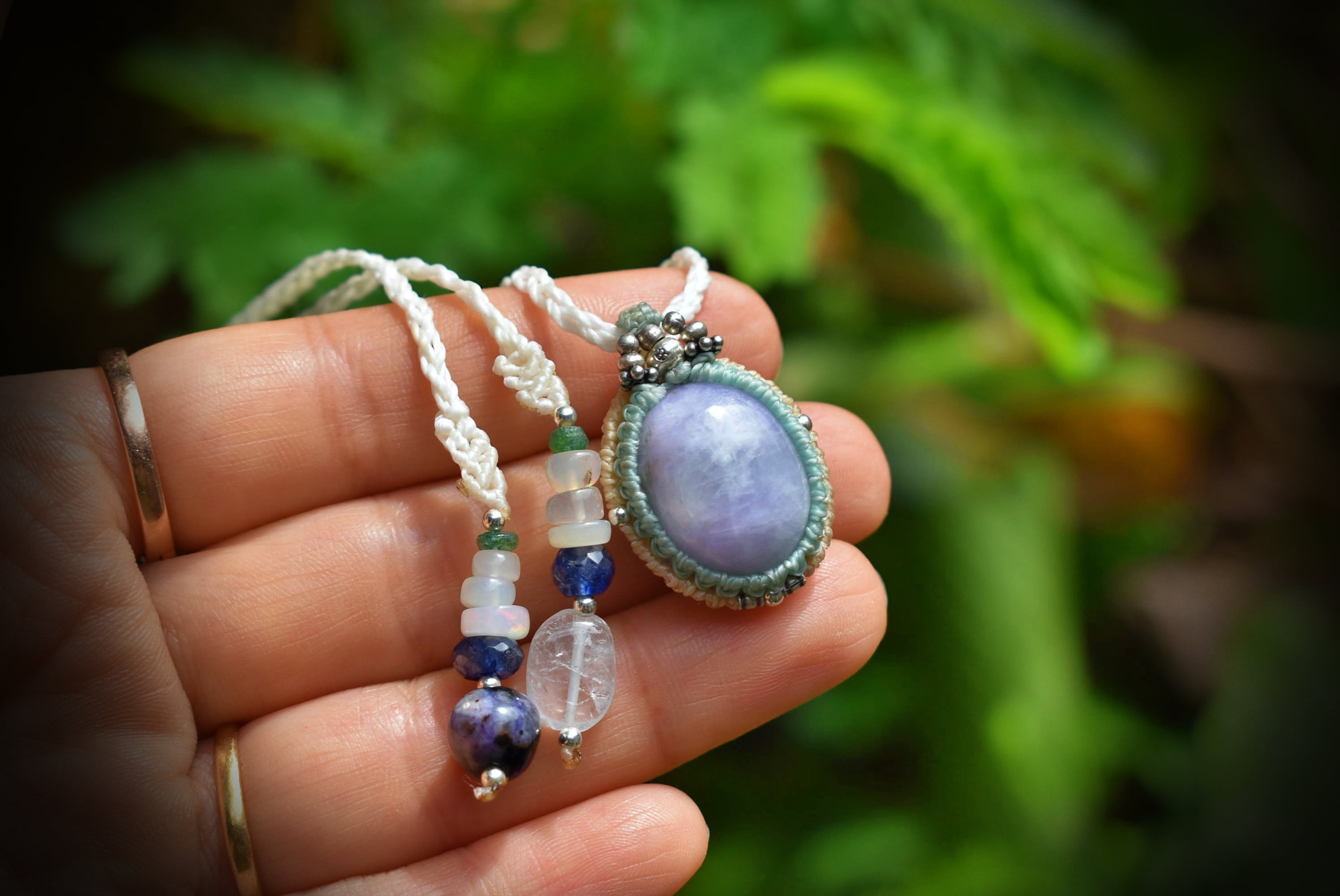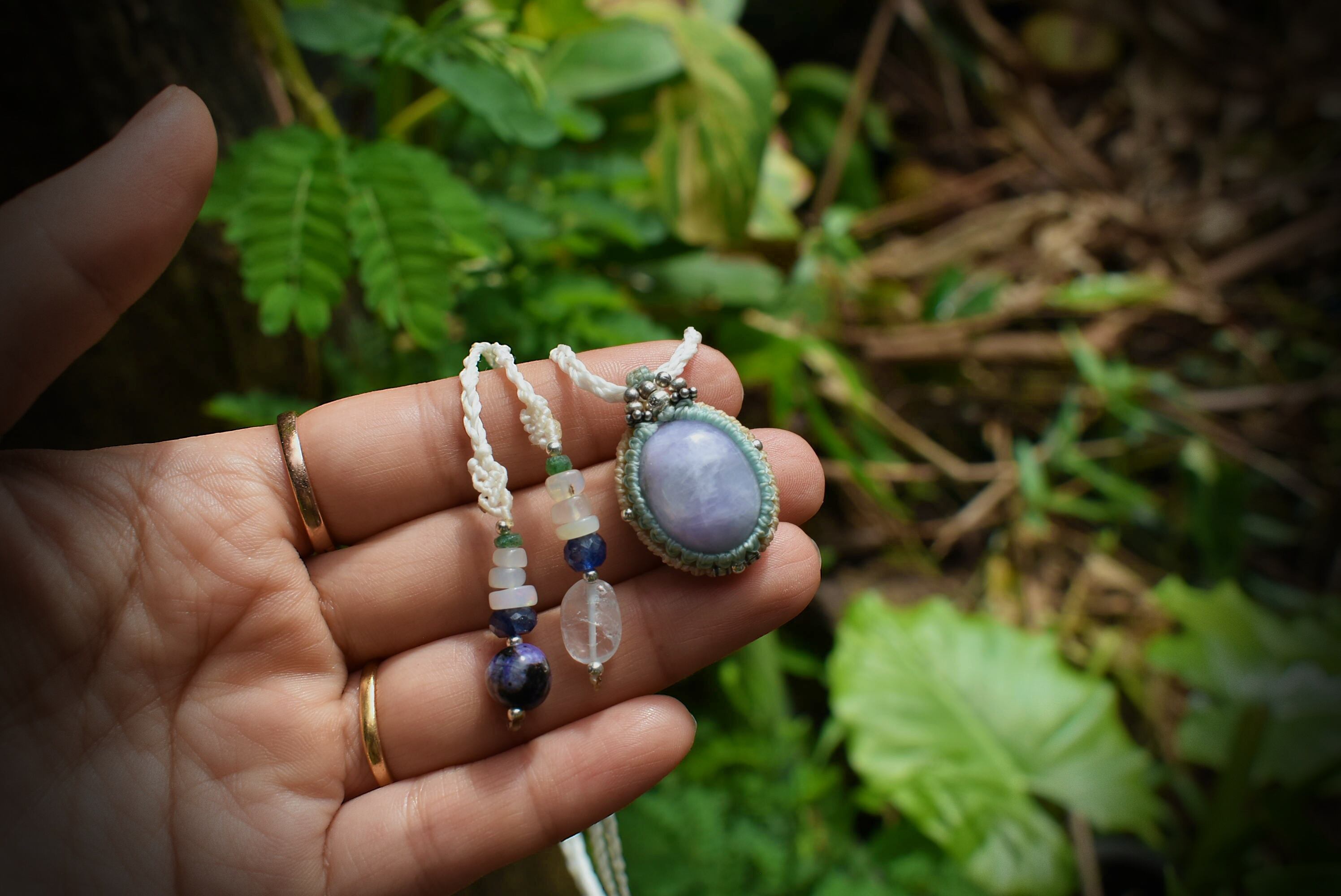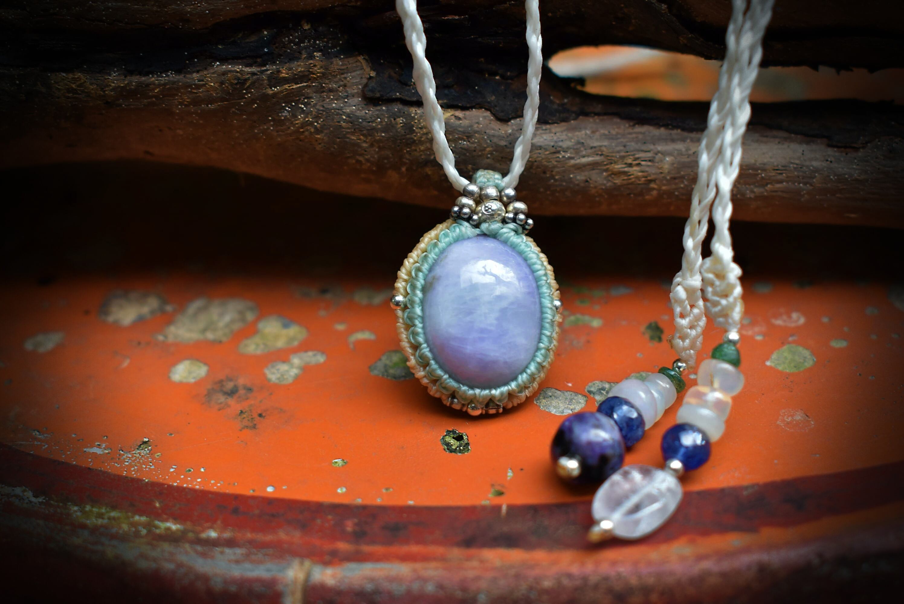 ほんのり薄紫の色味がレースのようにかかった優しい石ラベンダージェイド(翡翠)。天然石ルースとしては市場に出ることがあまりない、希少なジェイドをこのたび手にしましたので、さっそくマクラメペンダントに仕上げました。昔から人気の天然石とされるミャンマー産ラベンダージェイド。