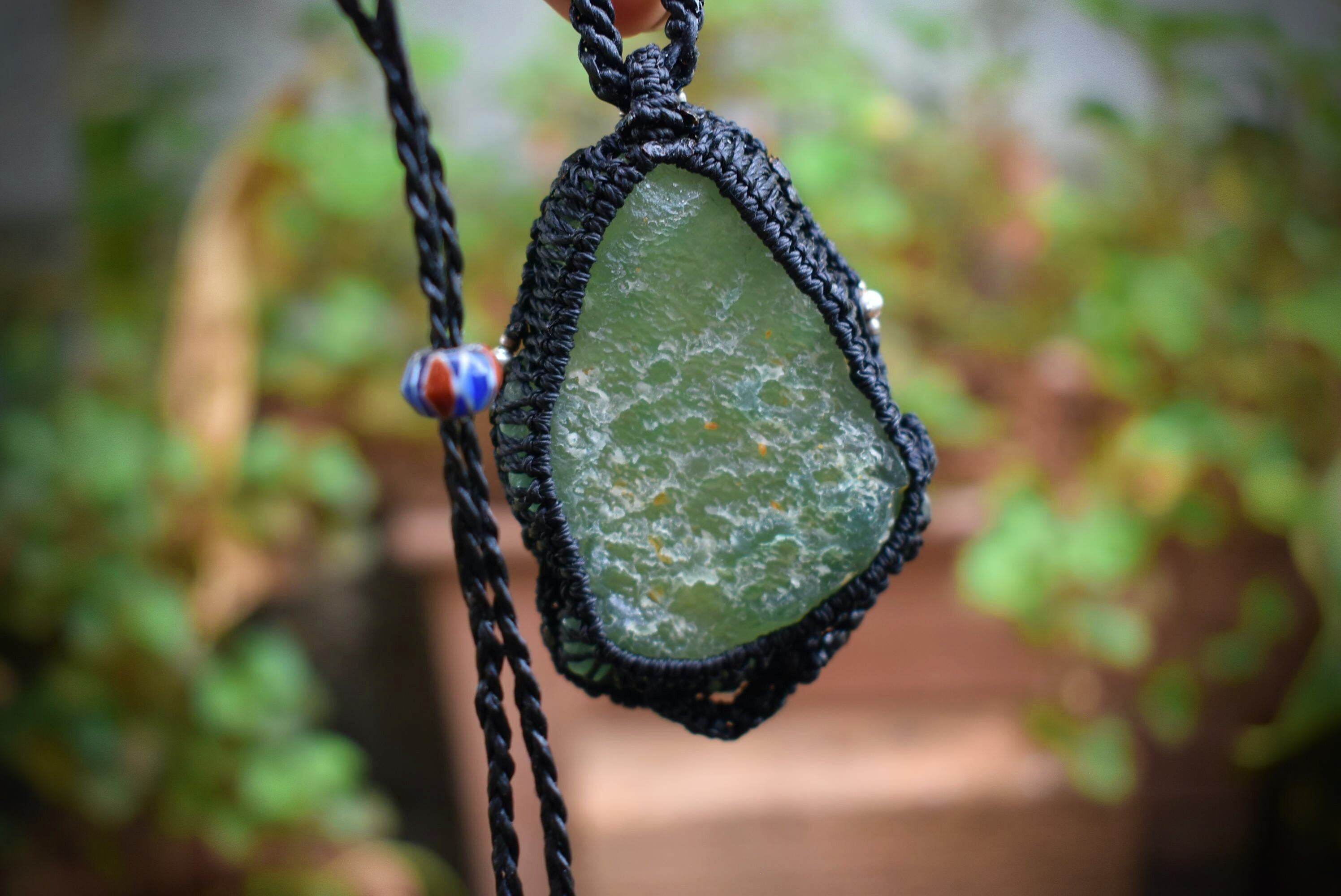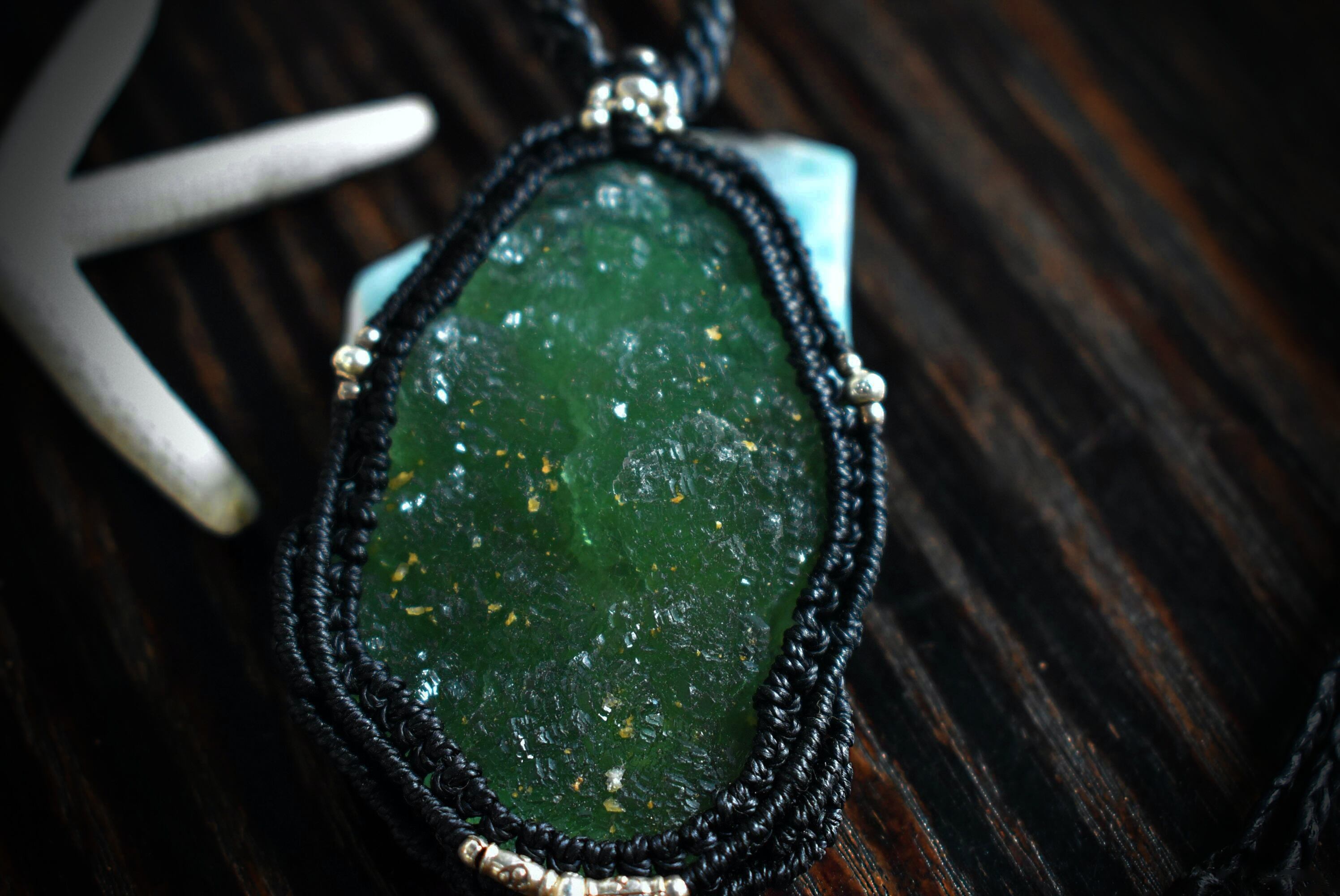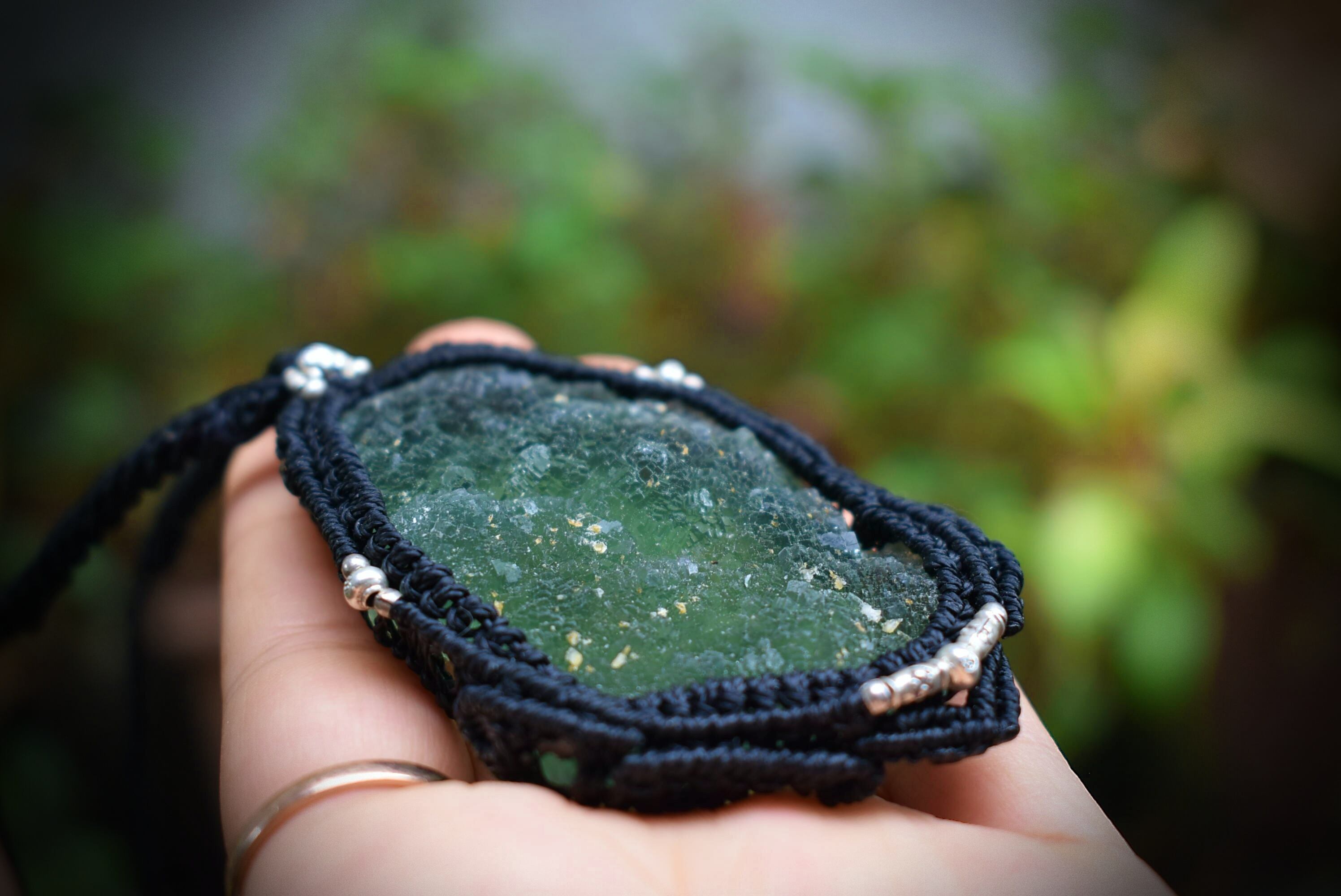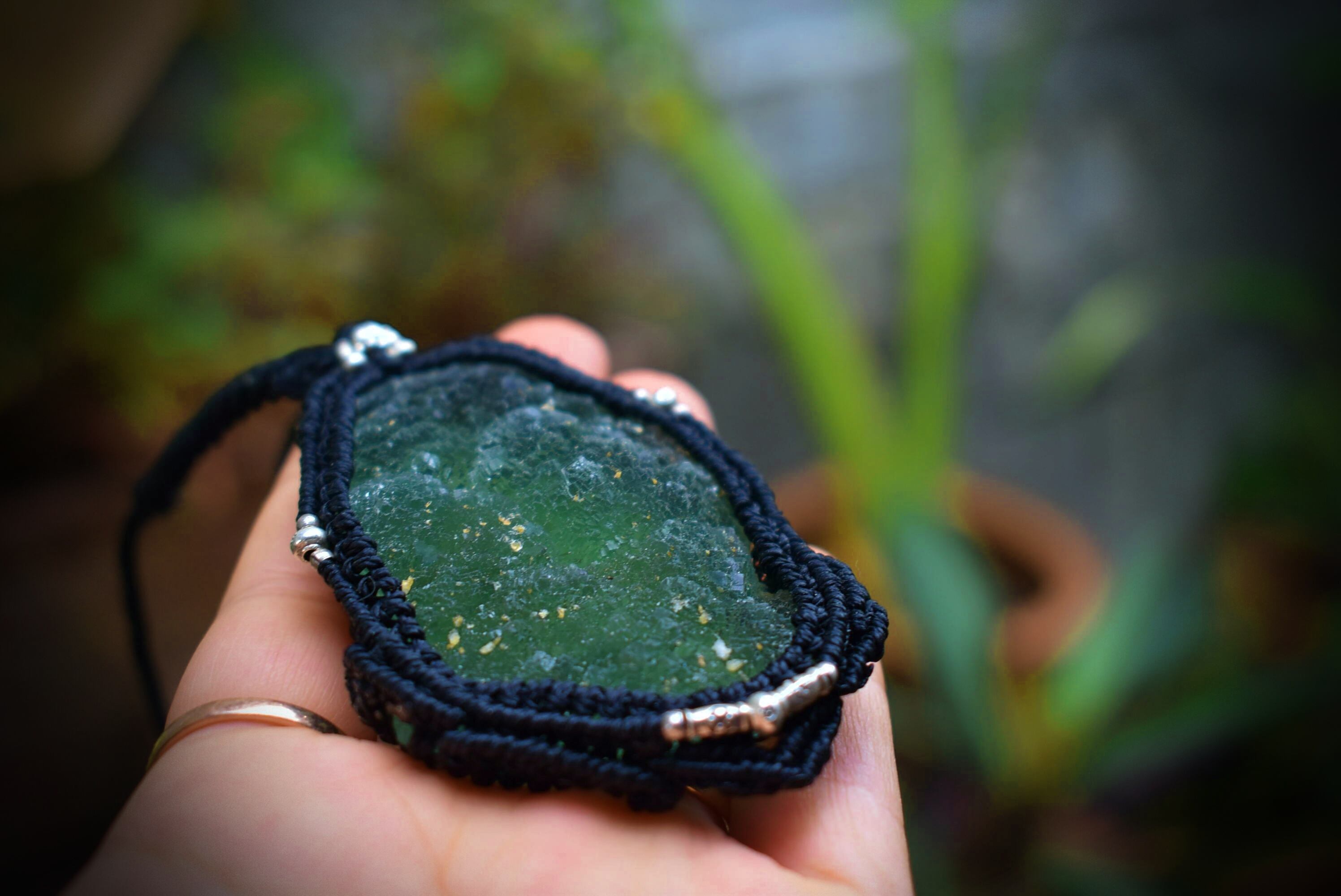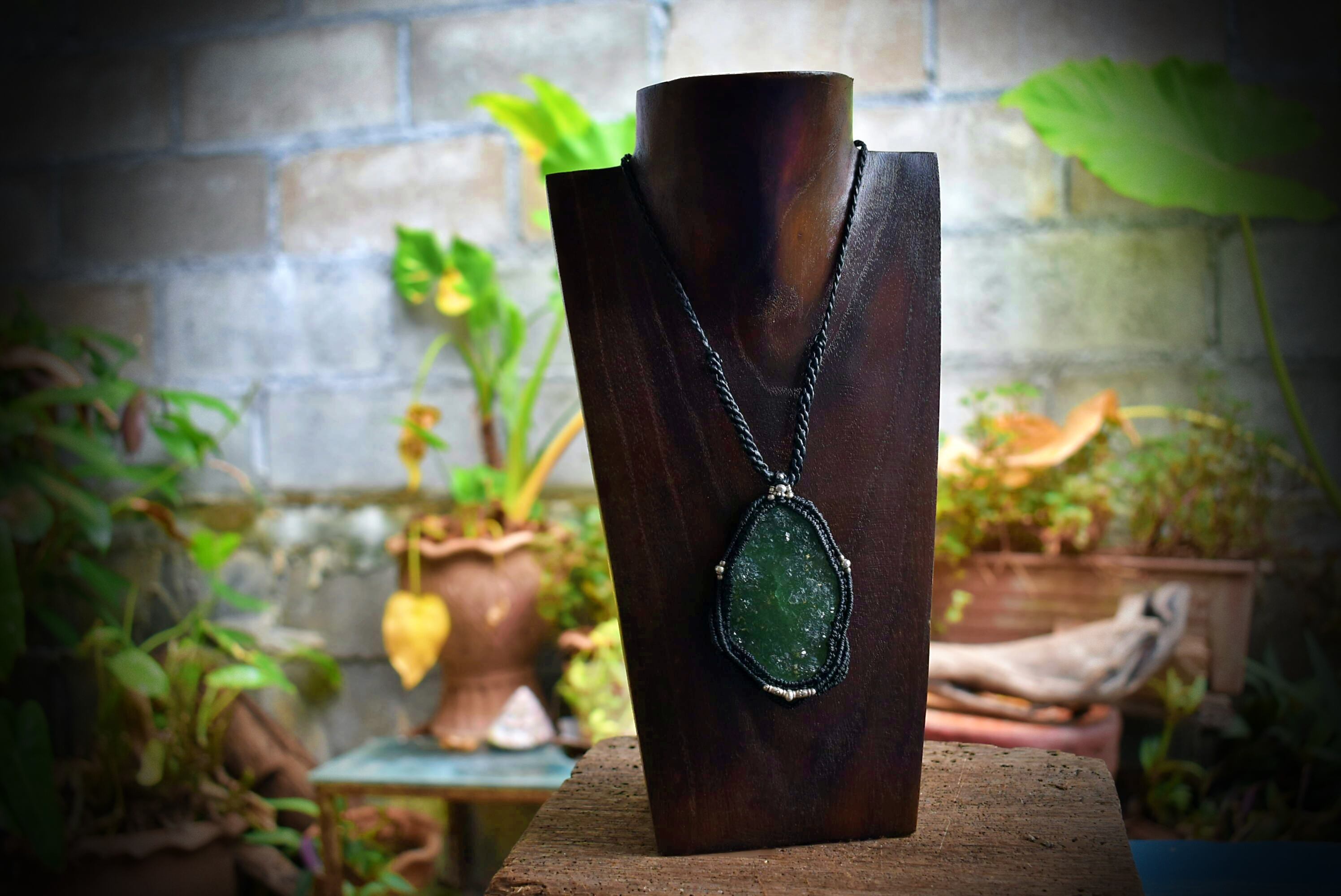 大きなドゥルージーでもある美しいグリーンフローライトそのままをシルバービーズ装飾を施しながら、マクラメ編み装飾を施してペンダントに仕上げました。トライバルなイメージでありながら、ダイナミックに着用していただける力強いイメージに仕上がりました。