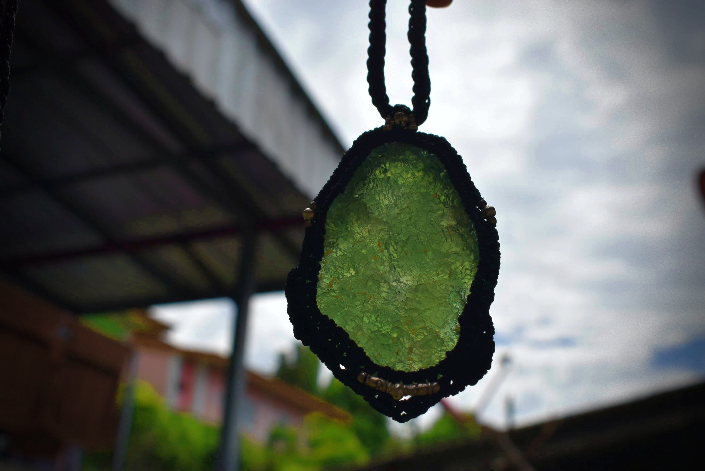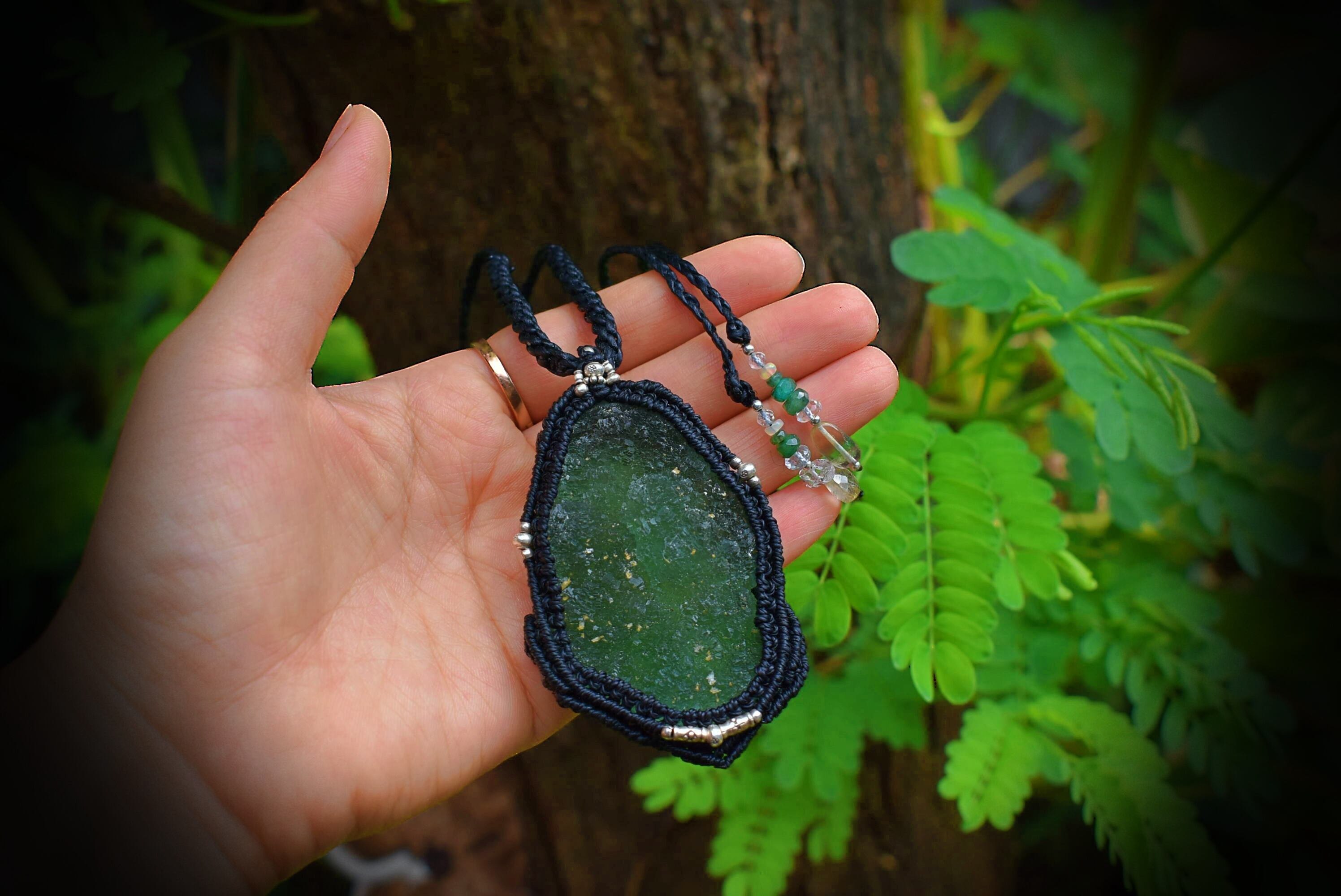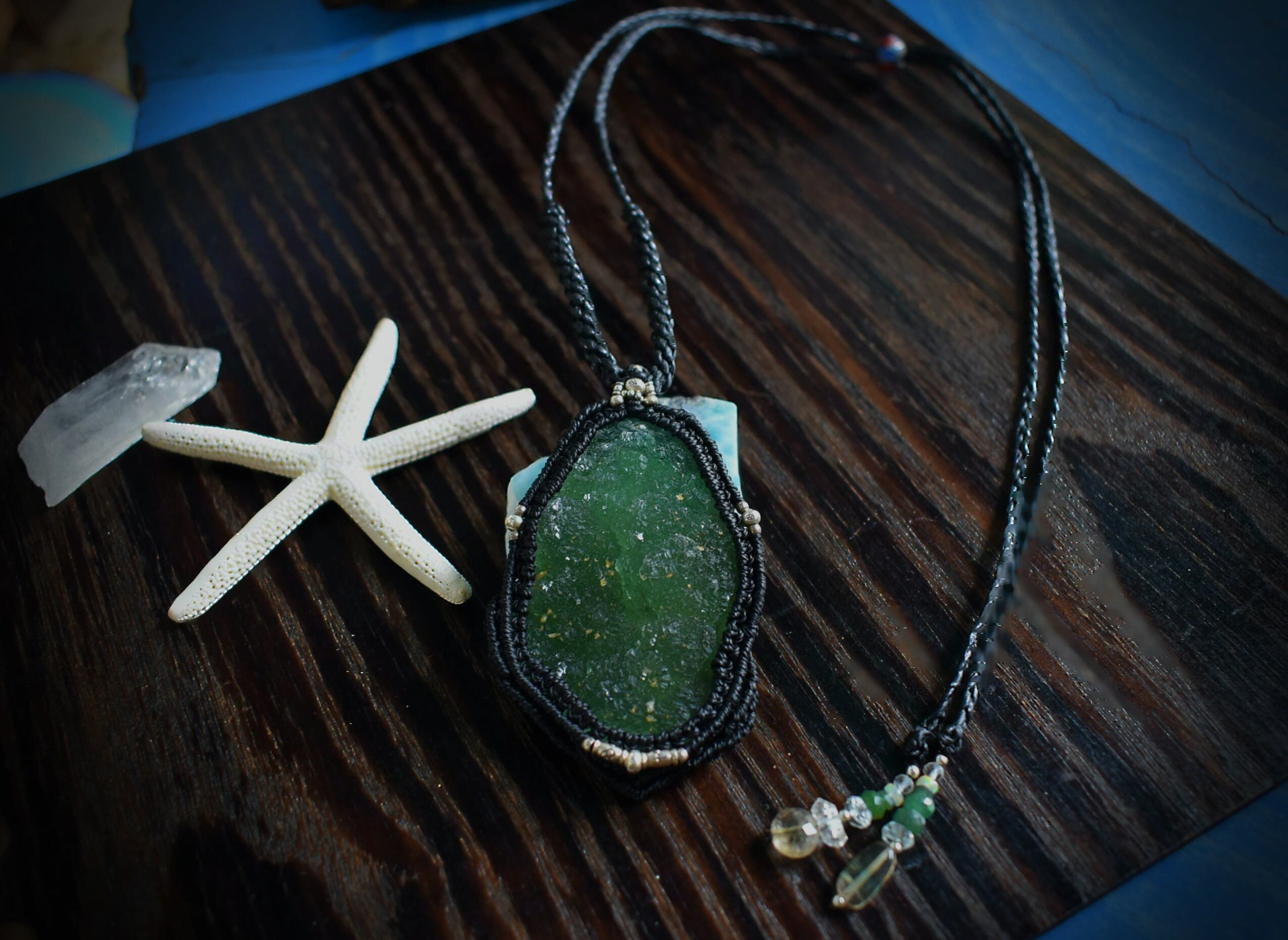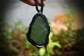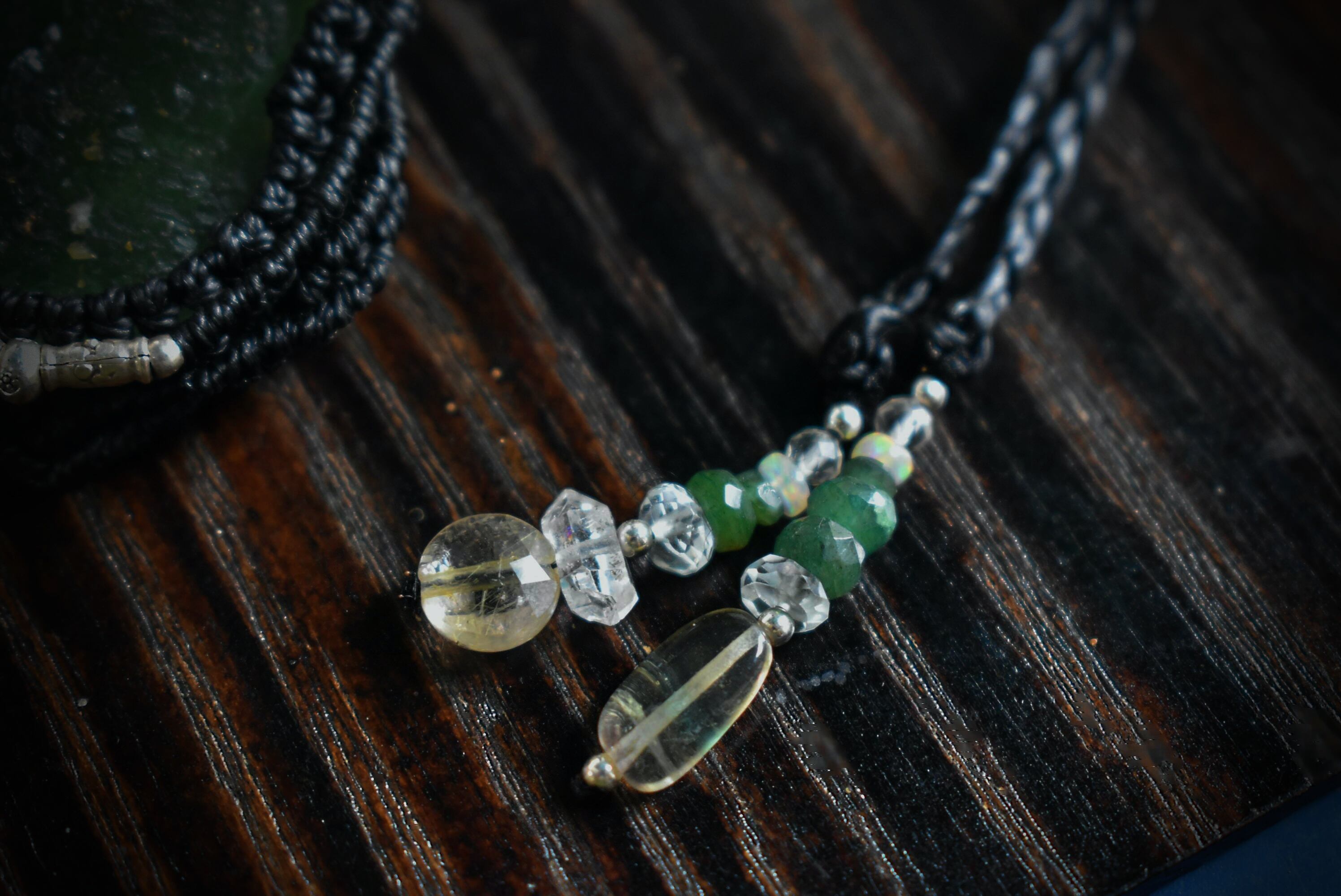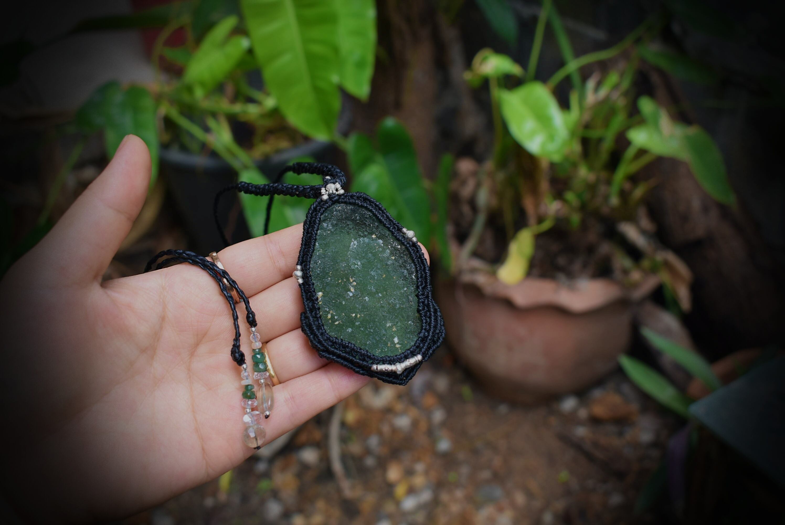 大きなドゥルージーでもある美しいグリーンフローライトそのままをシルバービーズ装飾を施しながら、マクラメ編み装飾を施してペンダントに仕上げました。トライバルなイメージでありながら、ダイナミックに着用していただける力強いイメージに仕上がりました。