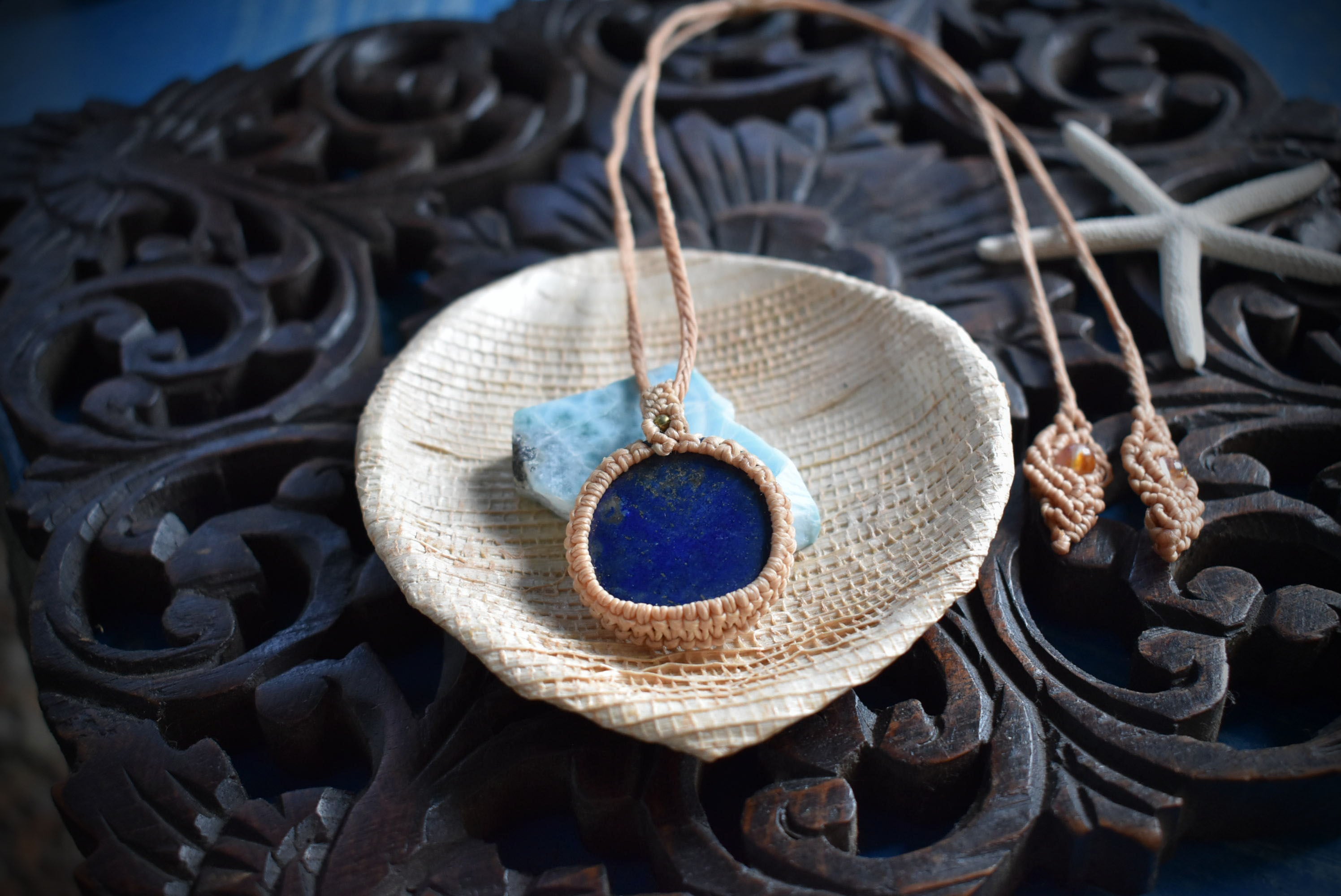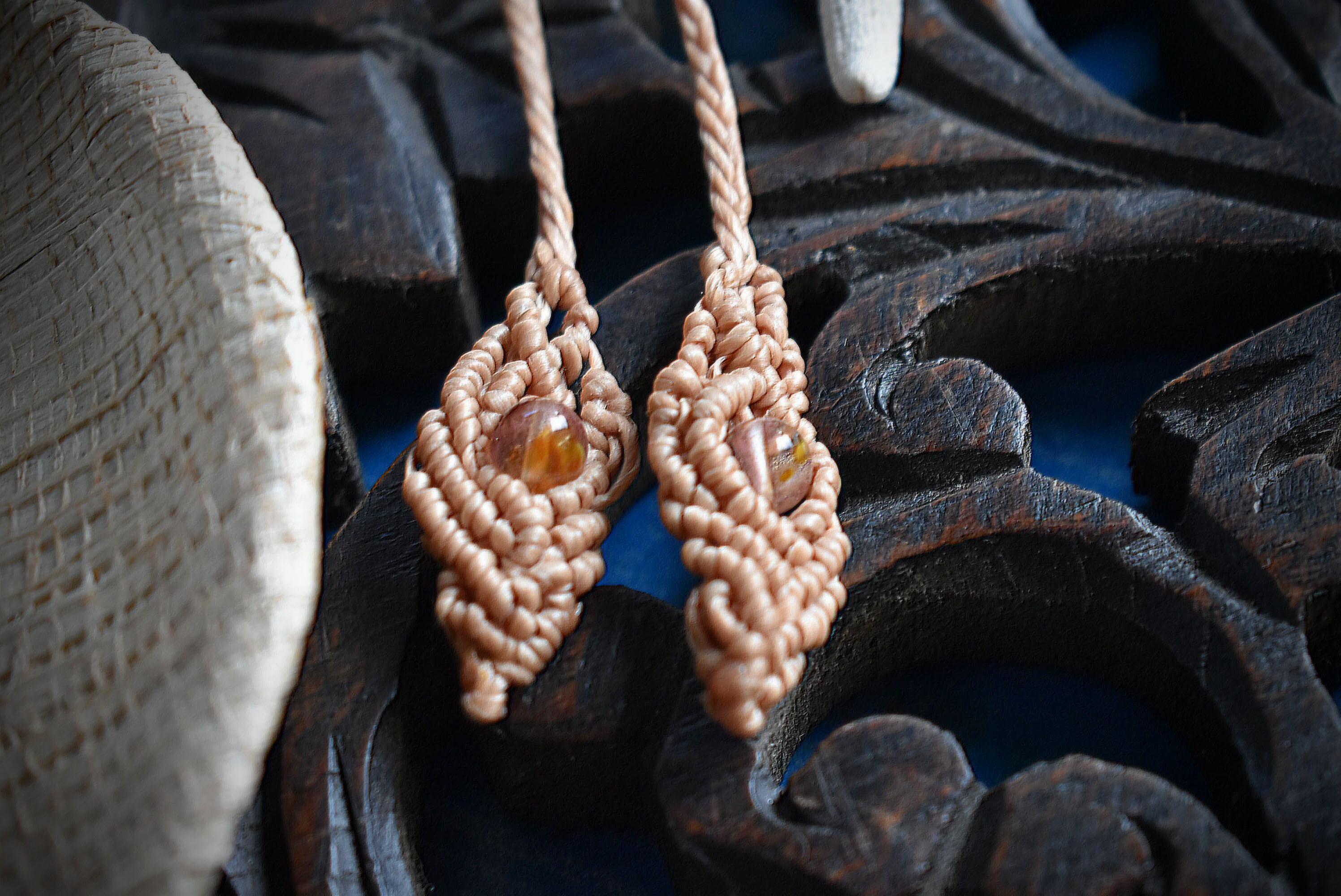 ◆このたびはブラック色の蝋引き糸を使用しマクラメ編み装飾を施しました。