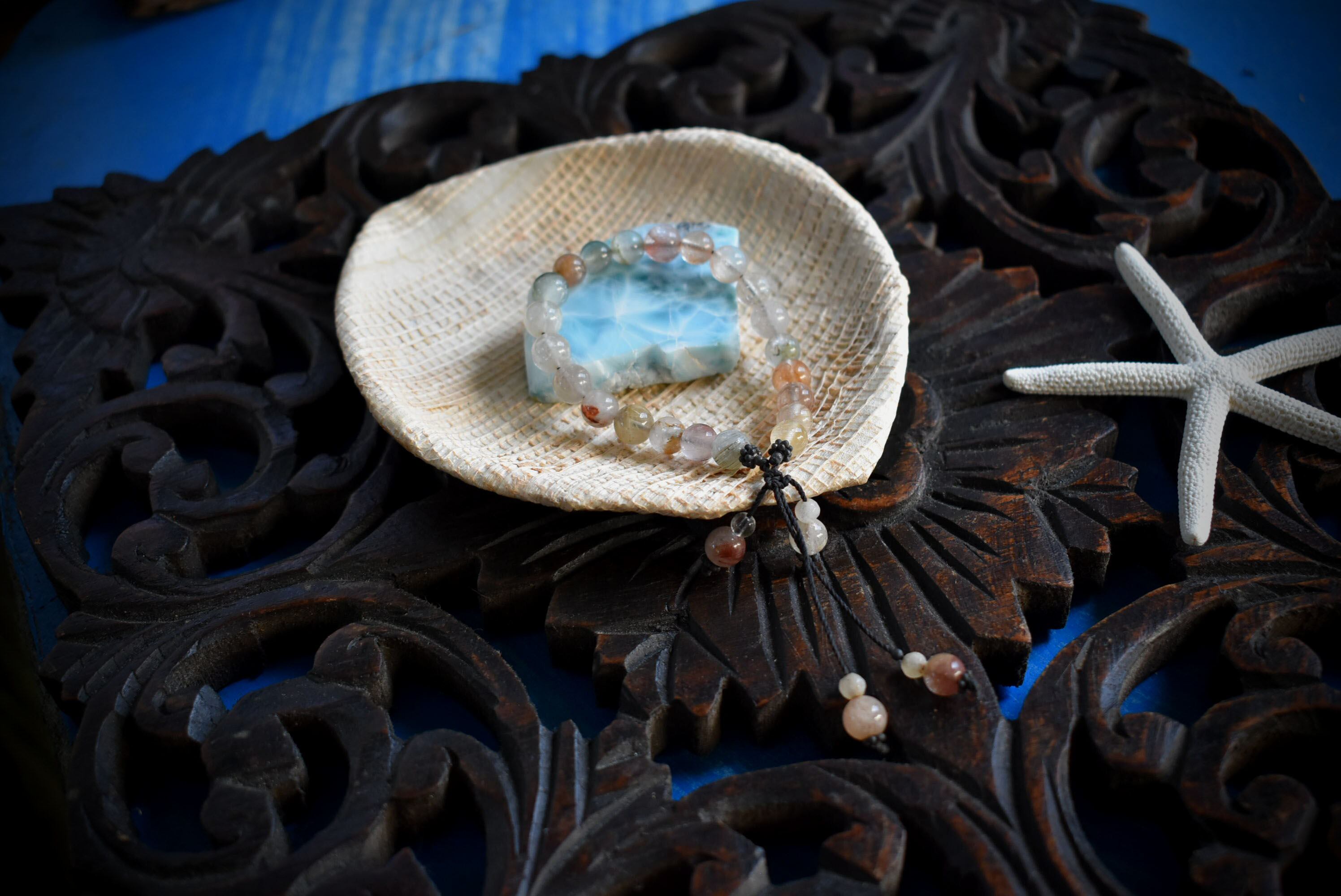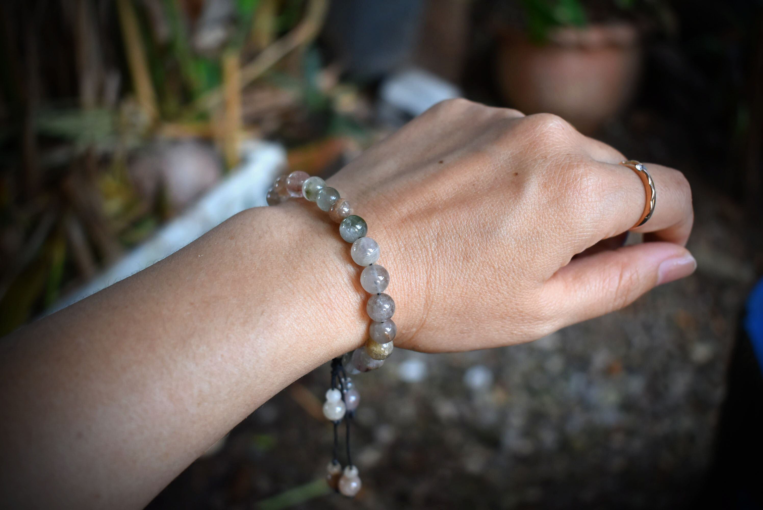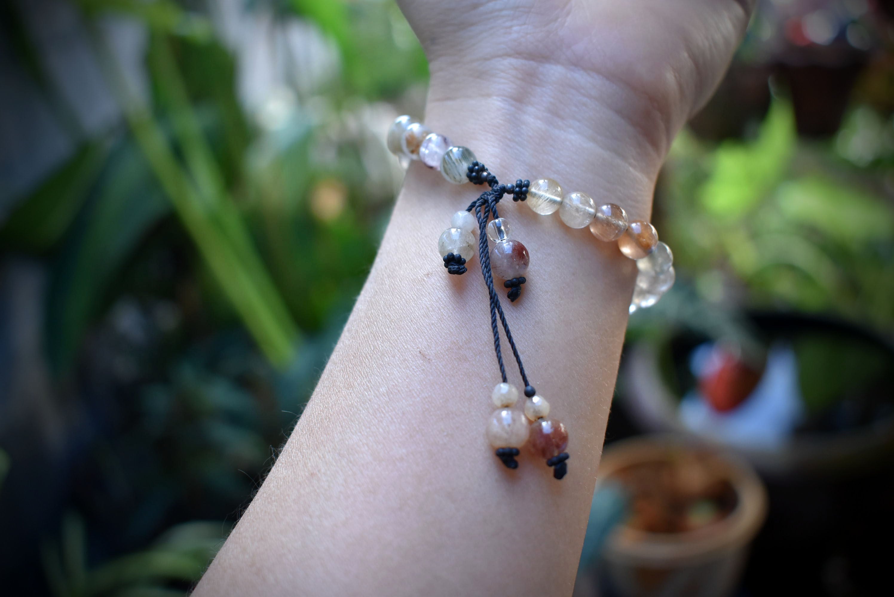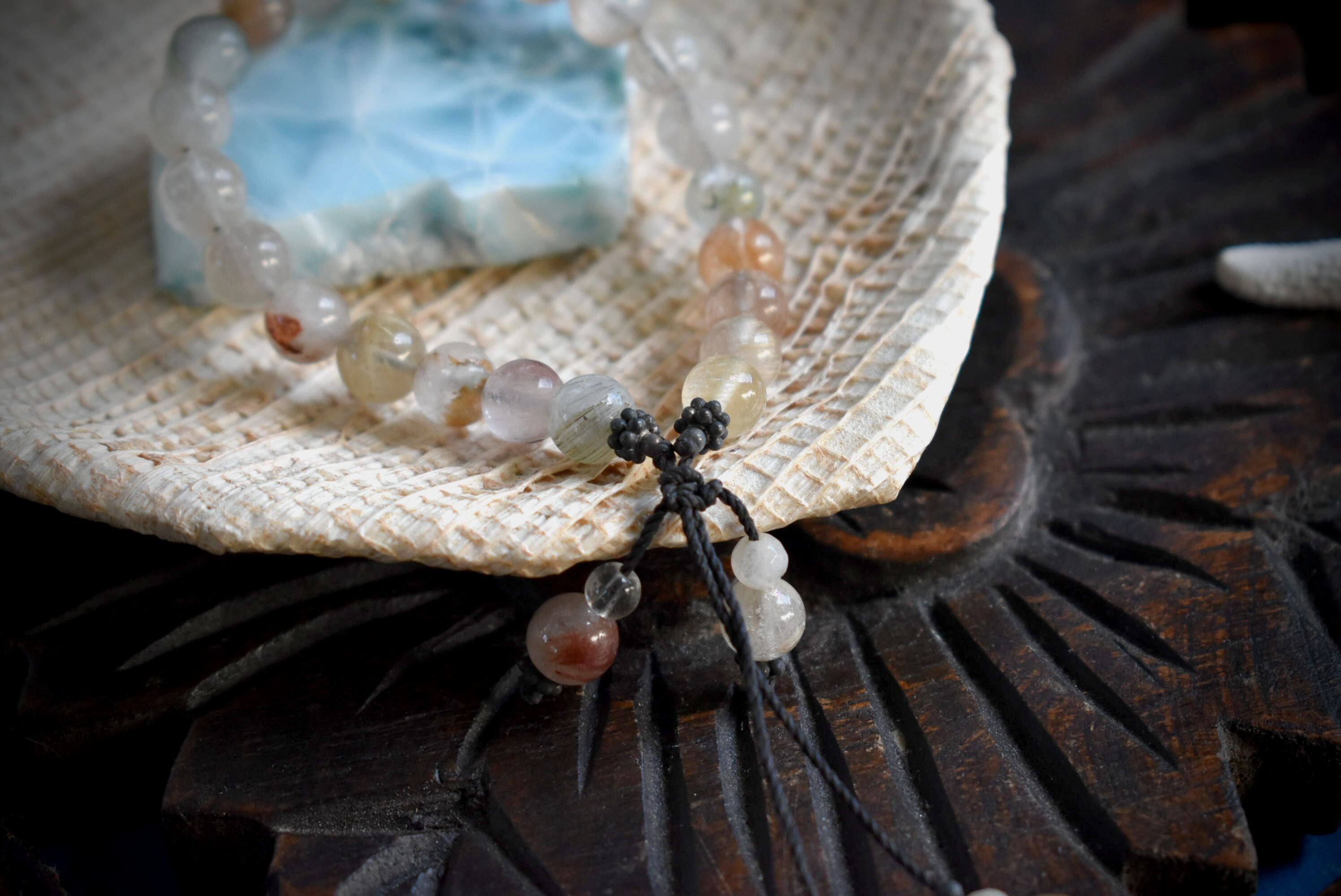 様々なタイプのガーデンルチルが入った水晶ビーズを強いコットン紐を使用してハンドメイドでブレスレットに組みました。アンティーク使用であり、シルバービーズとシルバーフラワーパーツを組み合わせています。
