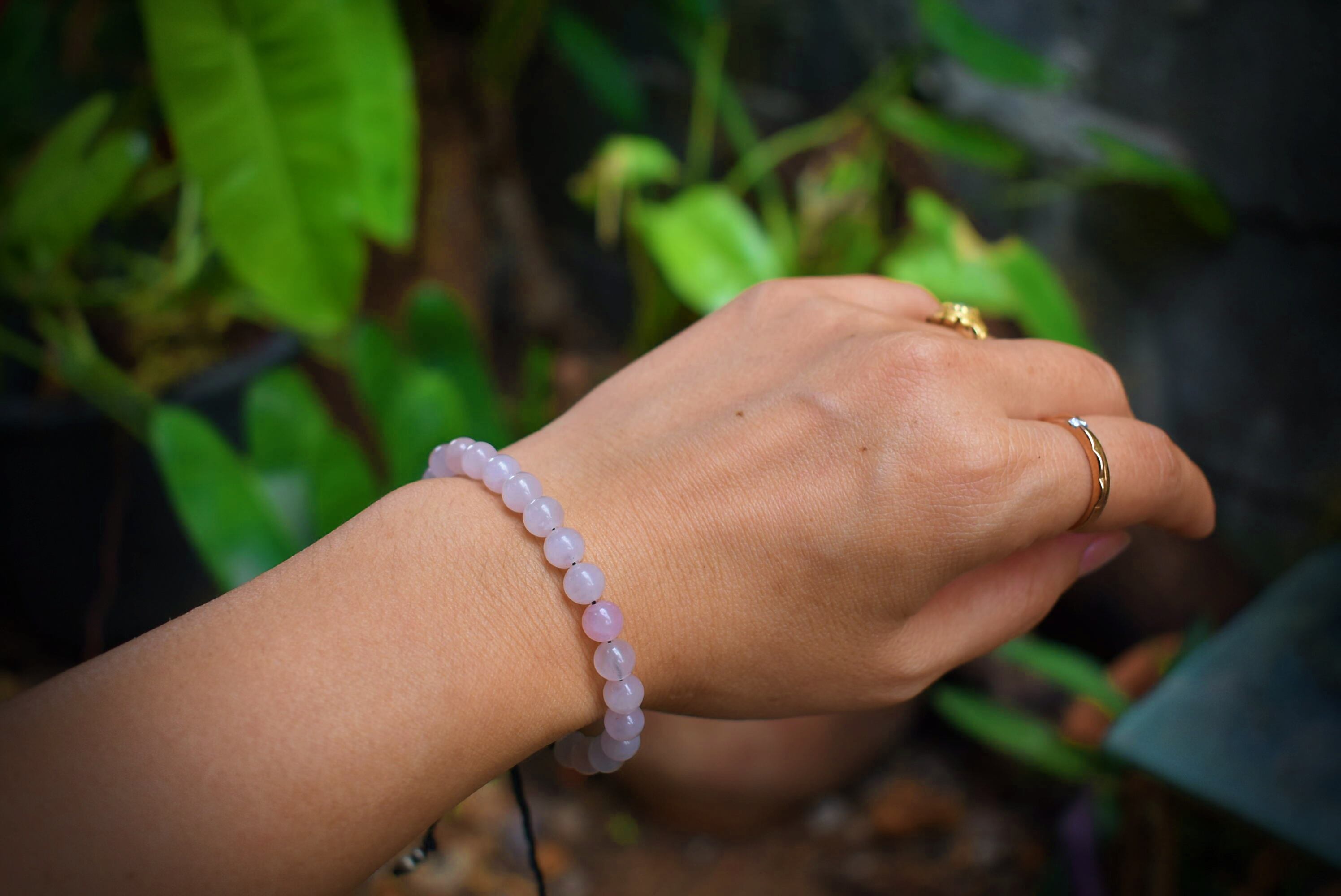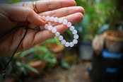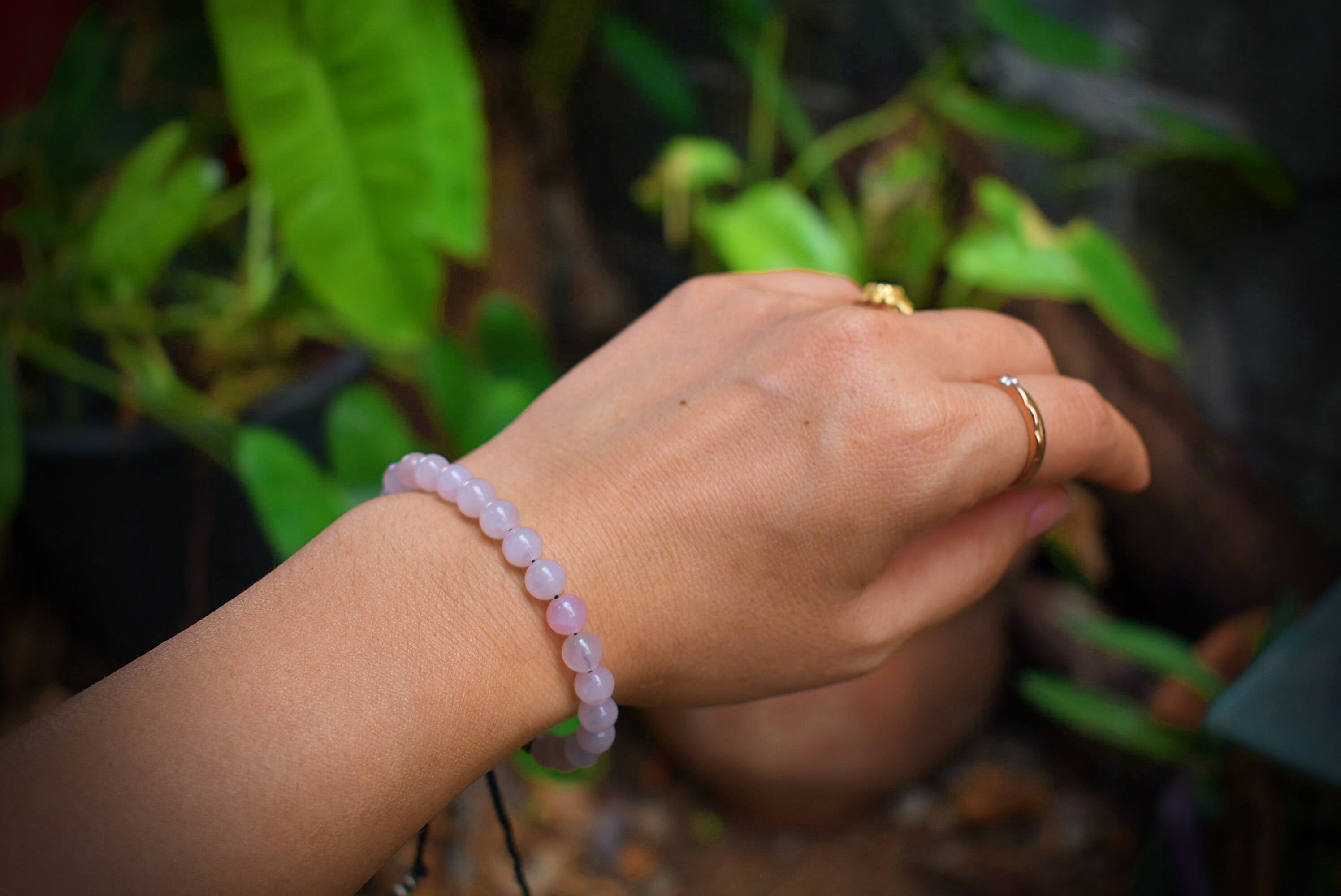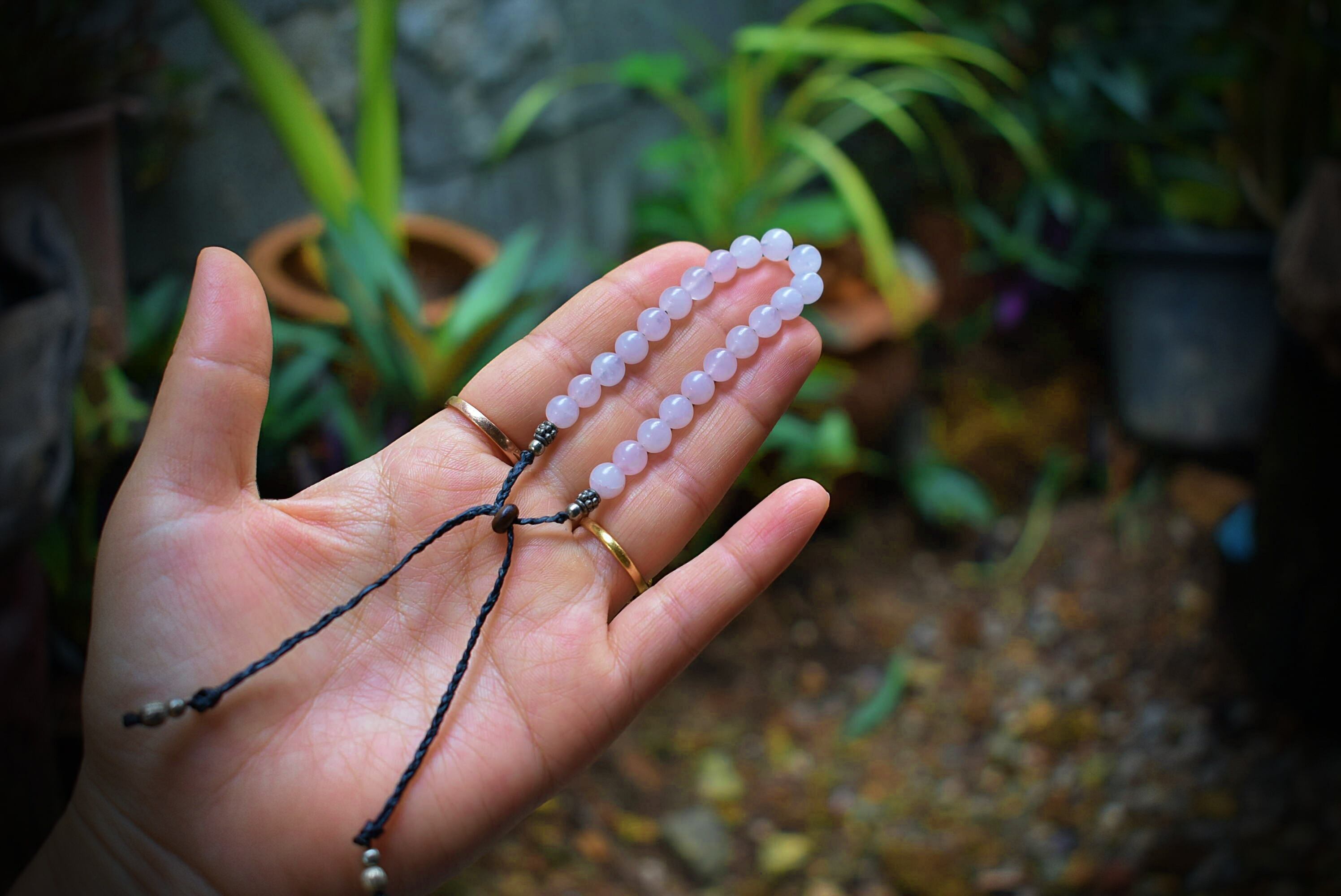 愛らしいピンク色の愛の石、ローズクォーツビーズを使用したビーズブレスレットを仕上げました。世界中の女性にいつも愛させれる天然石ビーズのひとつ。