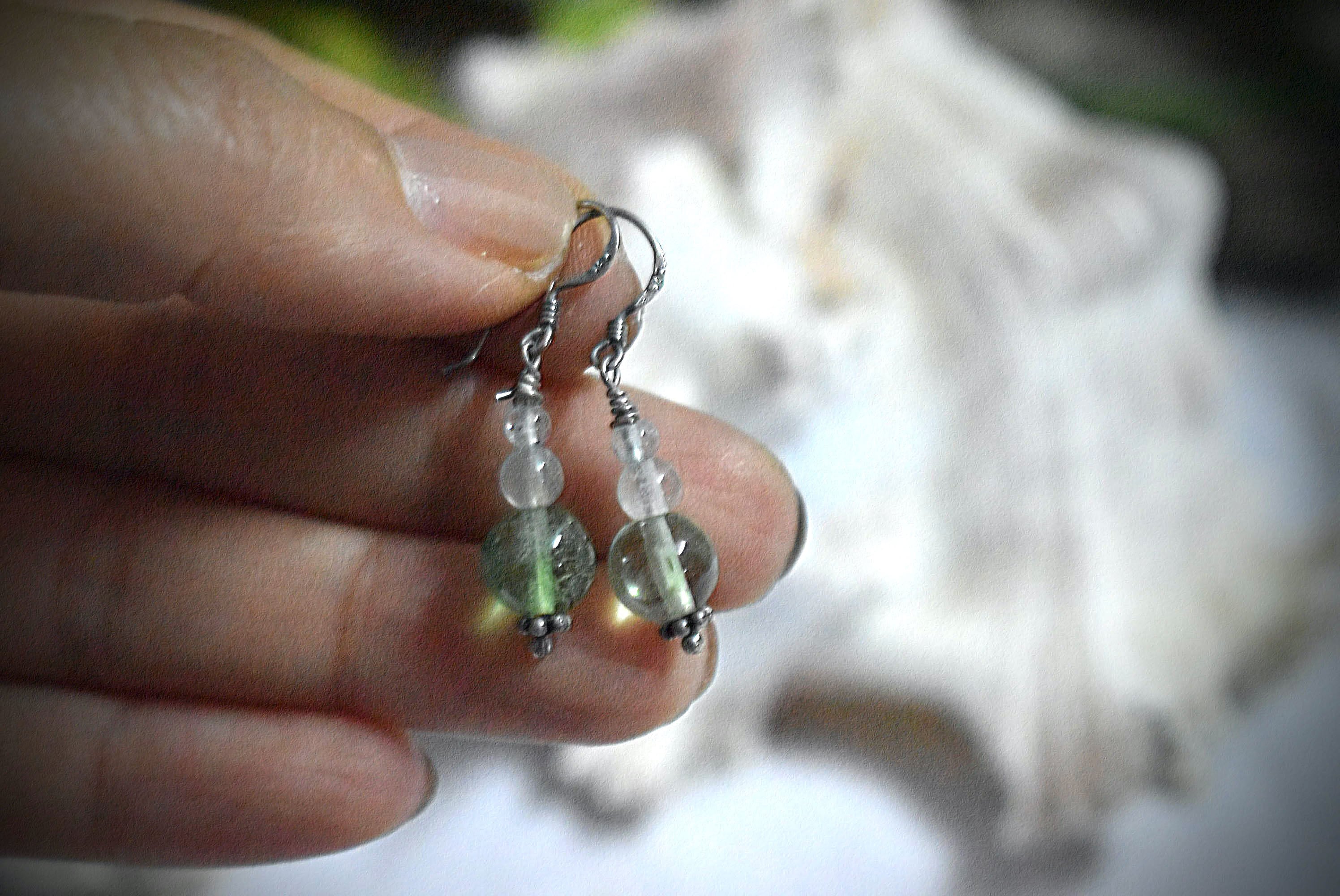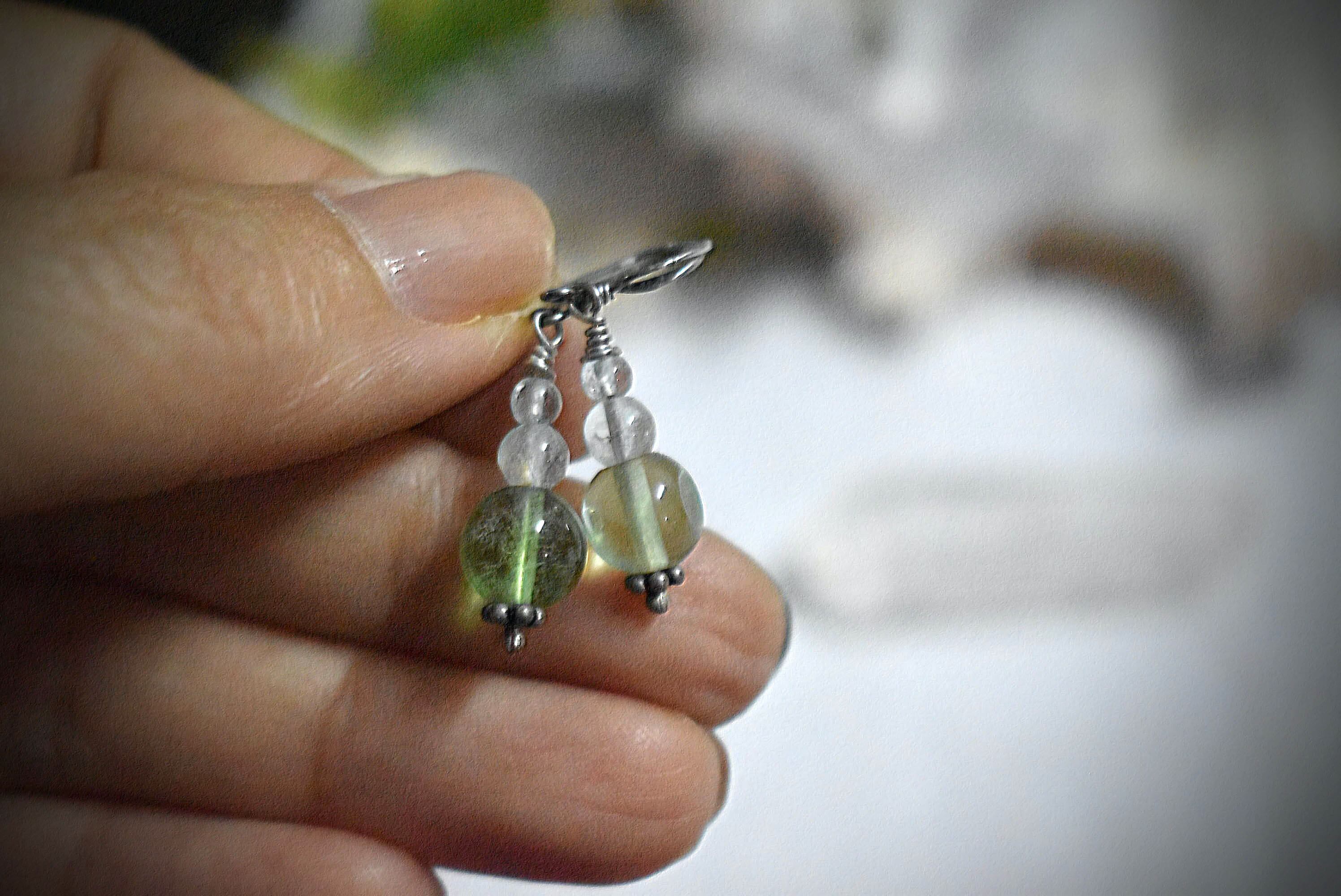 美しいフローライトビーズと透明感あるグリーンアメジストビーズをピックアップしてピアスを制作しました。耳元を優しく彩ります。