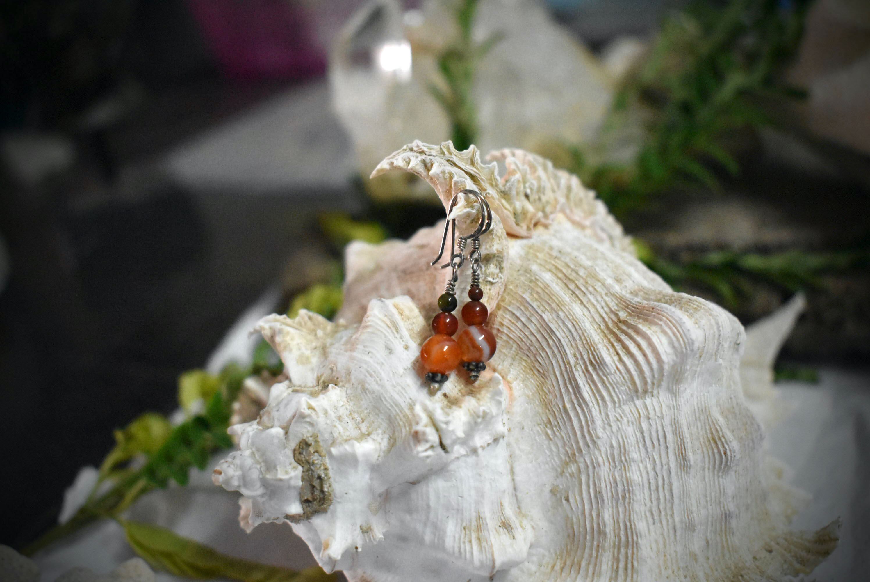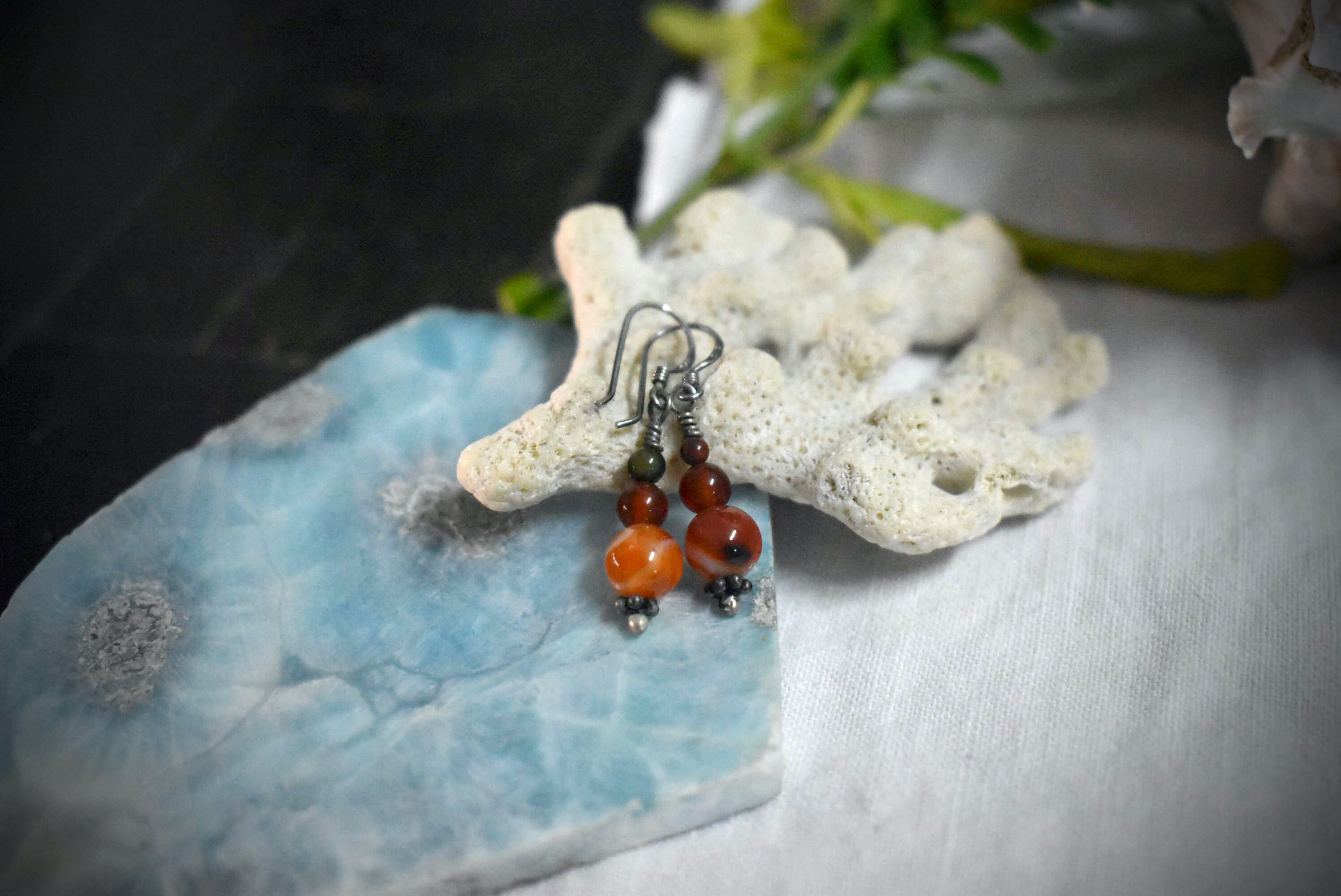 レッドアゲート瑠璃ビーズをピアスに仕上げた、天眼石の目玉のような模様がインパクトあるpピアス。元気な色味が顔まわりを整えてくれます。