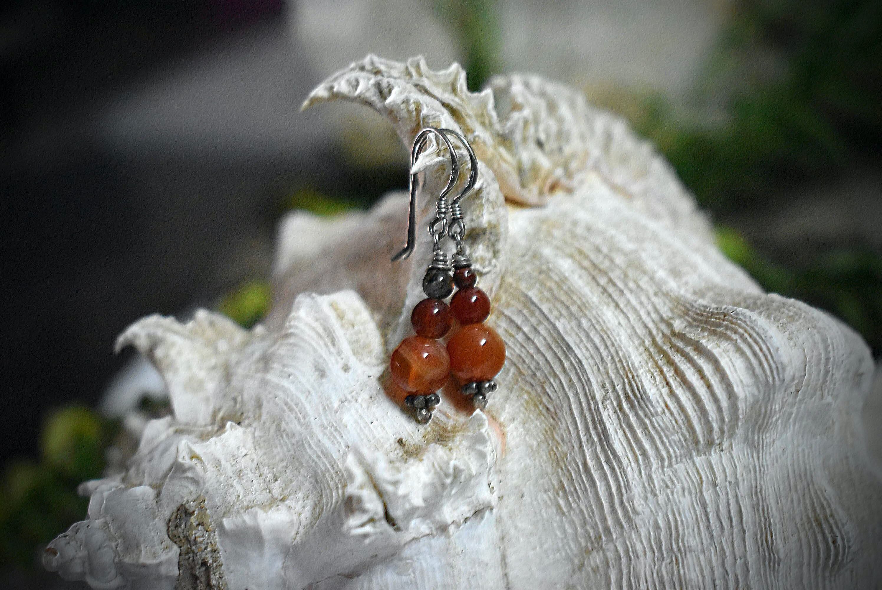 レッドアゲート瑠璃ビーズをピアスに仕上げた、天眼石の目玉のような模様がインパクトあるpピアス。元気な色味が顔まわりを整えてくれます。